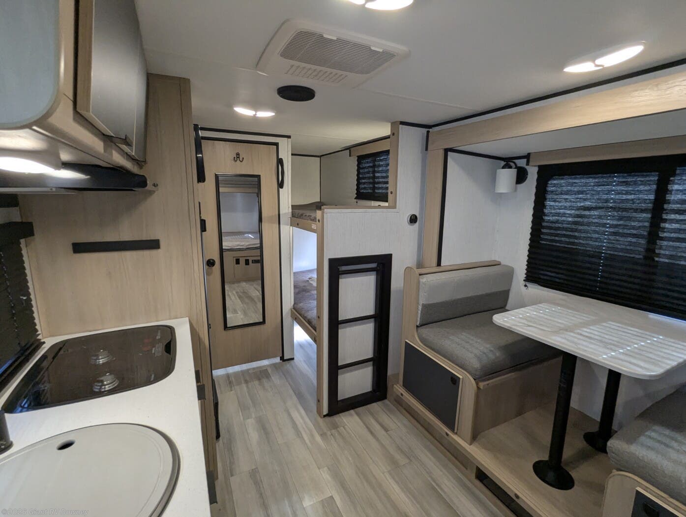 - Bunkhouse Bliss: Sleeps up to 6 with bunk beds, front queen bed, booth dinette, and single slideout for open family space.