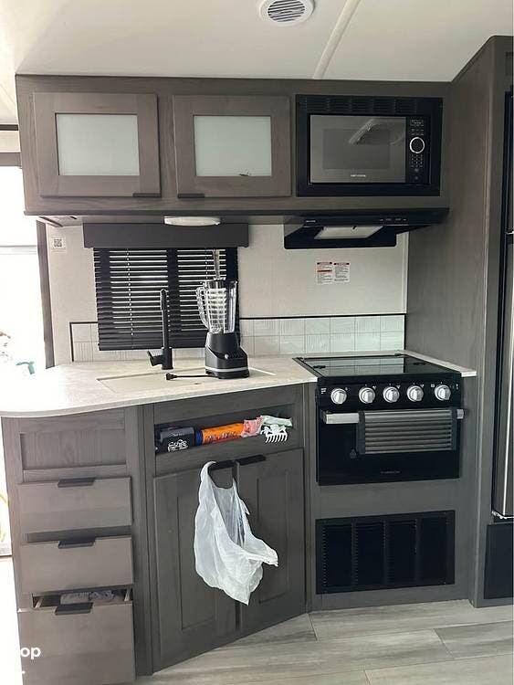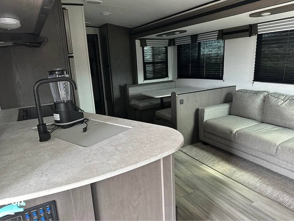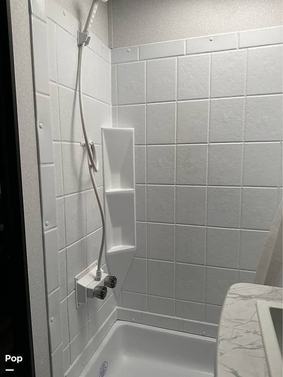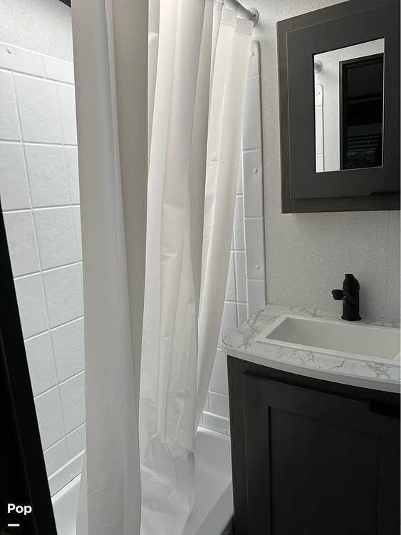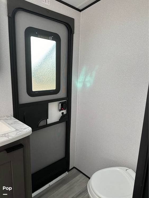 Off the kitchen area is the full bathroom with a shower, toilet, and sink with vanity. There is a convenient exterior door to this bathroom area, so you do not need to go through the RV to use the restroom.