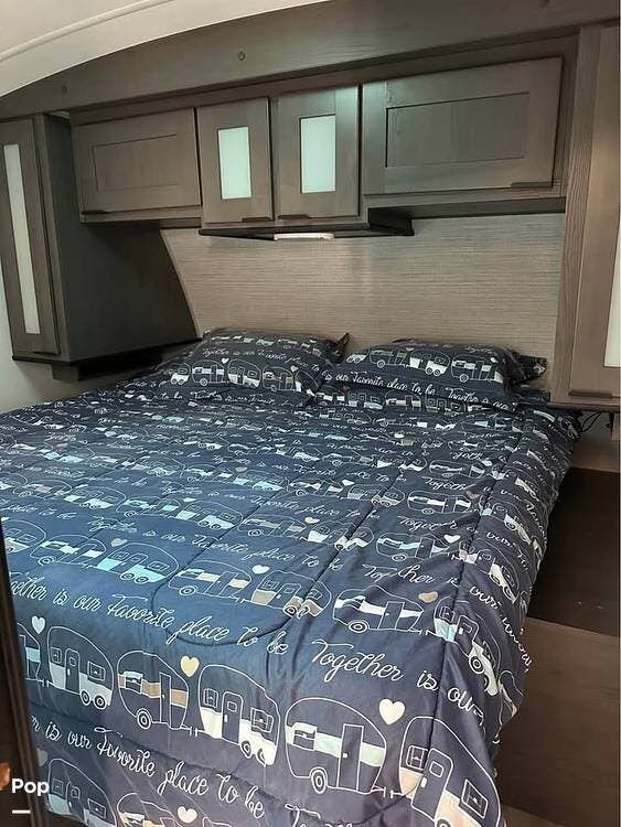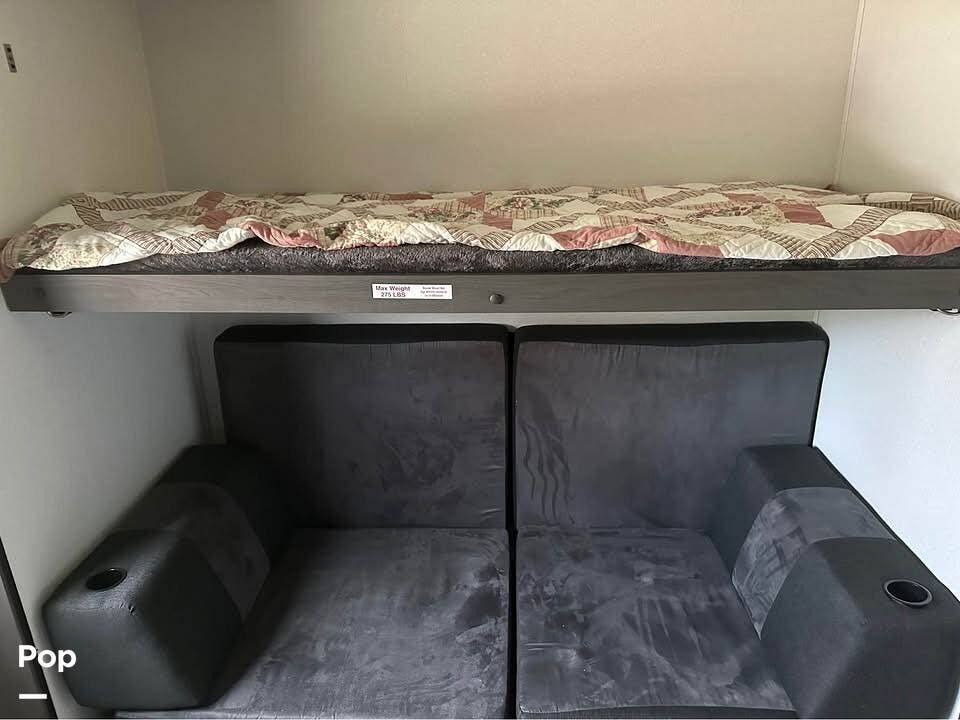 The rear of the RV is the large bunkroom with a sofa/sleeper and a bunk above that can fold up out of the way if not needed. Across is another bunk with storage below. There is a large flat-screen TV for the children to enjoy