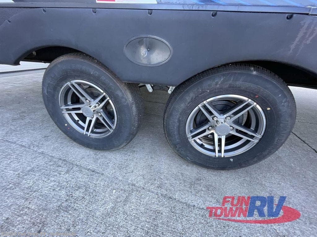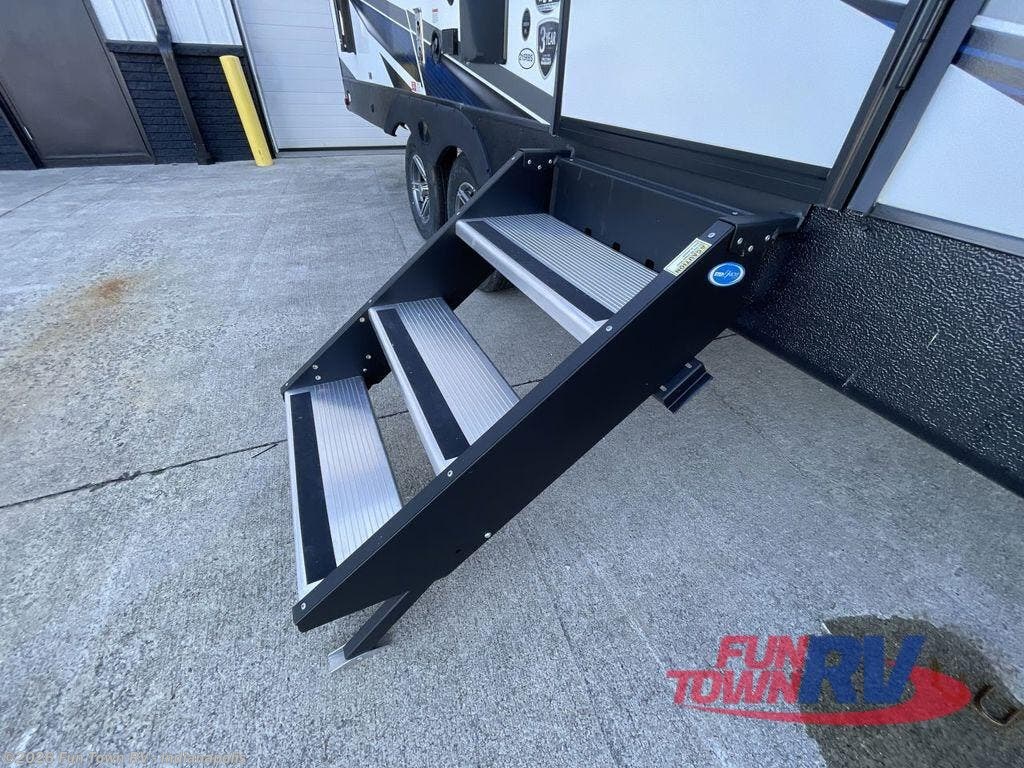 If you need to get a little work done while you are away then this travel trailer is perfect for you with the rear desk! The single slide provides more walking around space and houses the U-shaped dinette, 10.7 cu. ft. refrigerator, and pantry that is big enough to hold all of your favorite snacks. The front patent pending king bed sliding system has a pet palace underneath with a cruise-thru storage design and there are wardrobes on either side to keep your clothes looking their best, plus a privacy curtain to draw while you change or sleep. The exterior full belly storage system is big enough for all of your outdoor gear and the 15' electric awning has LED lights to highlight the good times at night!