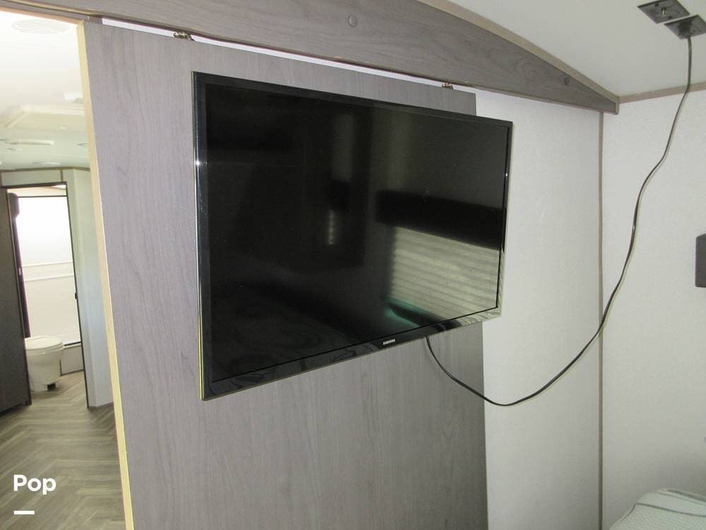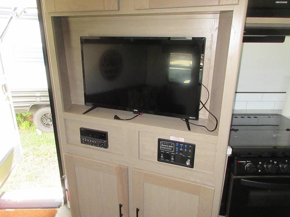 The master bedroom is in the front with a king bed and TV. Plenty of storage under the bed and overhead cabinets.