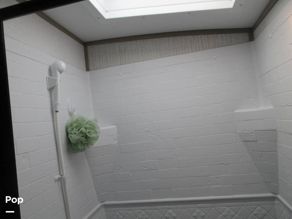 In the rear is a bunk room (top bunk removed) next to the full bathroom with a shower, sink, and a toilet.