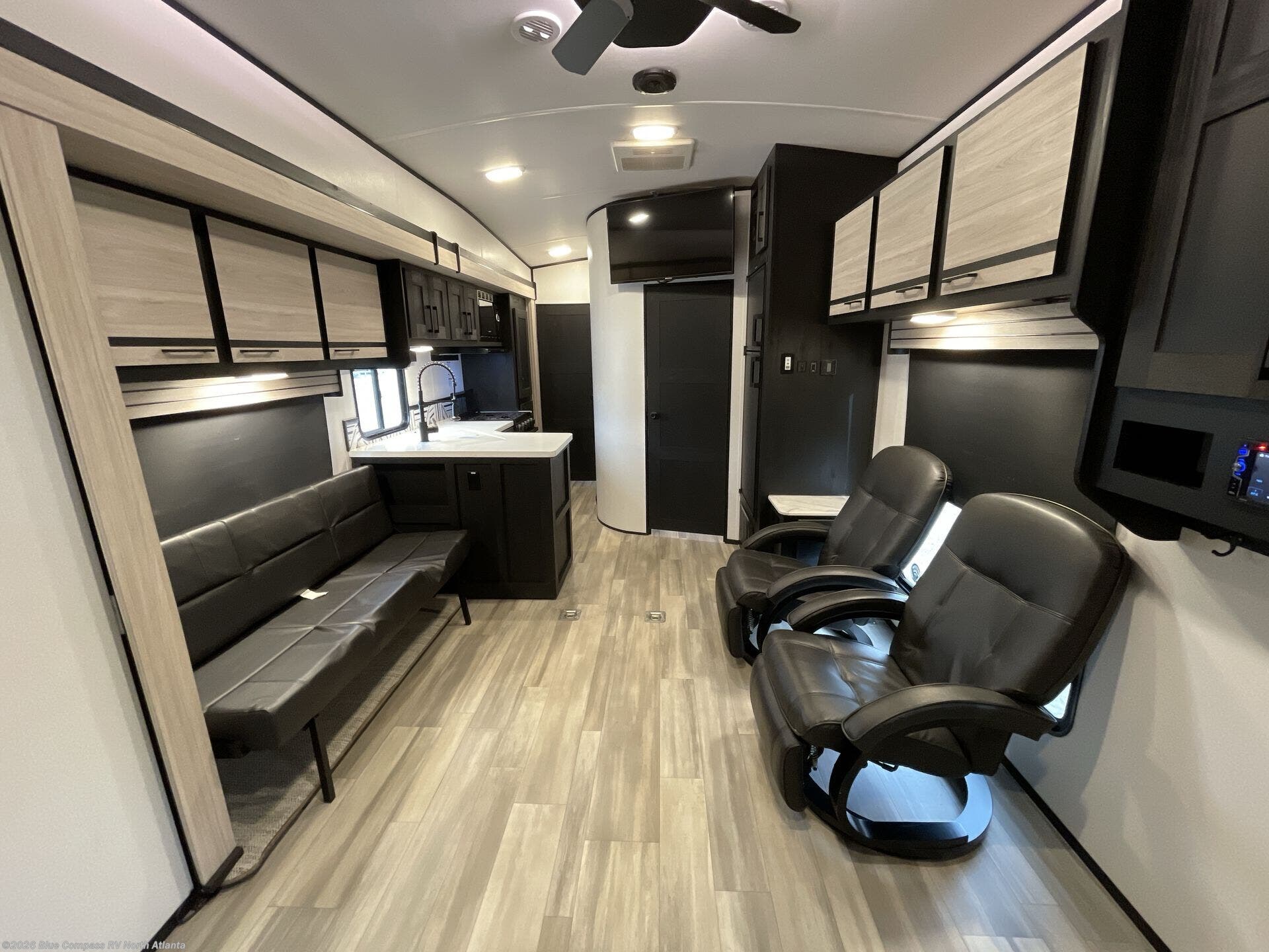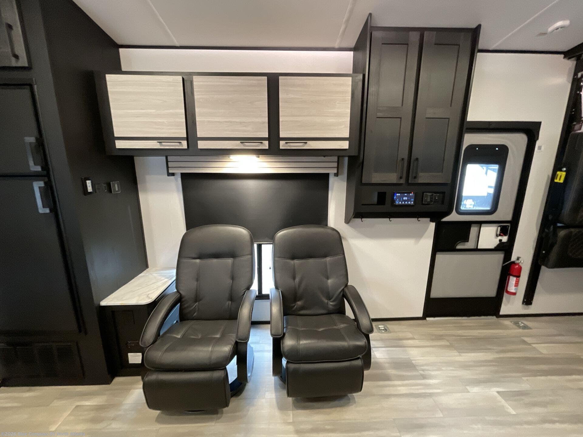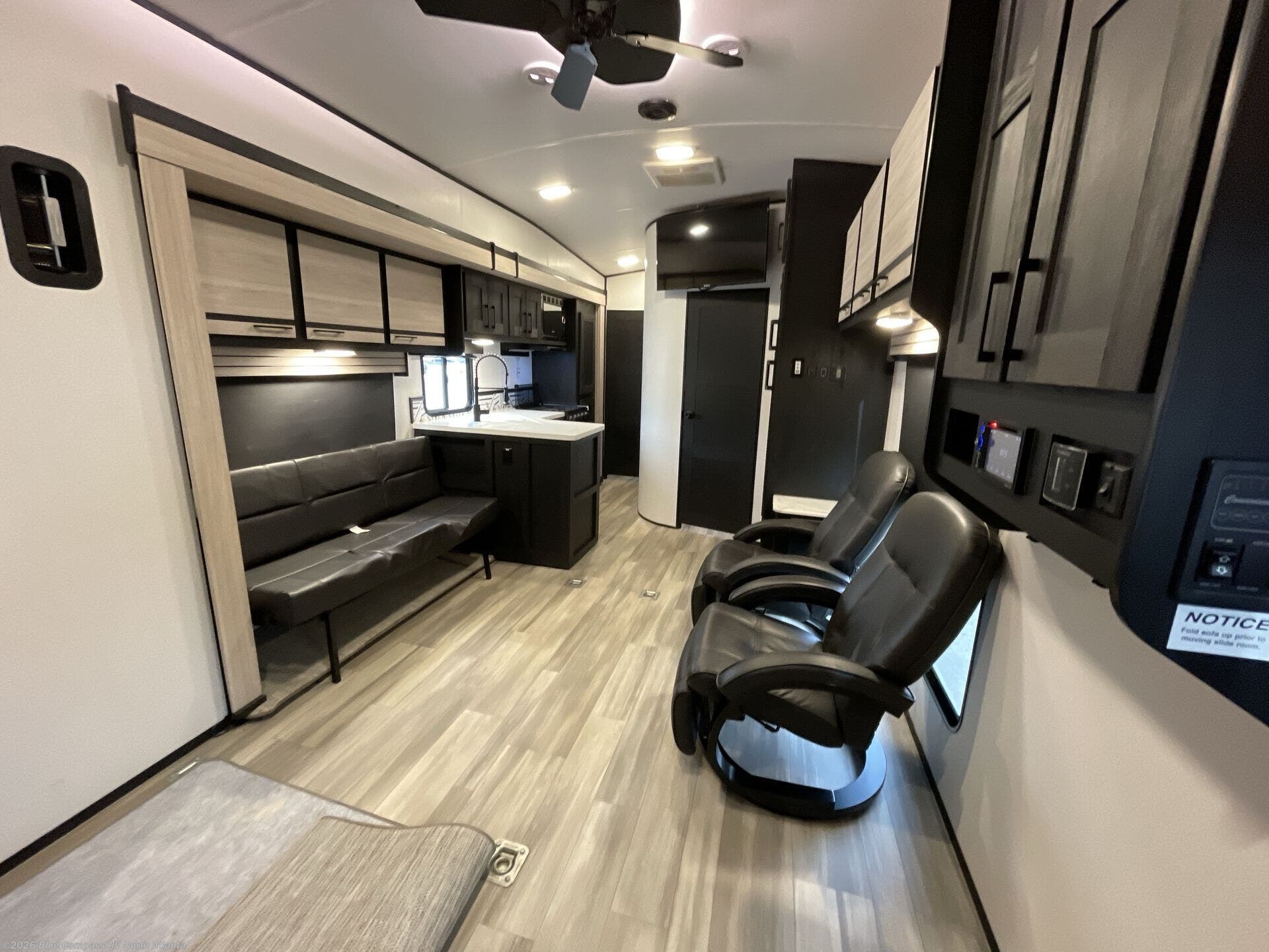 You can't go wrong with this dual entry toy hauler in tow! Once you arrive at the campground, fill up the bikes using the convenient 30 gallon fuel station, then head out on a trail or two! There is a dual entry bath on board that will allow you to clean up before heading to the kitchen to start dinner. You will love the large slide out that will provide more space when cooking, and there is a sofa with a table to dine at. You may just want to kick back on the dual lounge chairs before starting the dishes. Sleeping space can be found on the king bed in the front master, or on the opposing sofas and power queen bed in the garage!