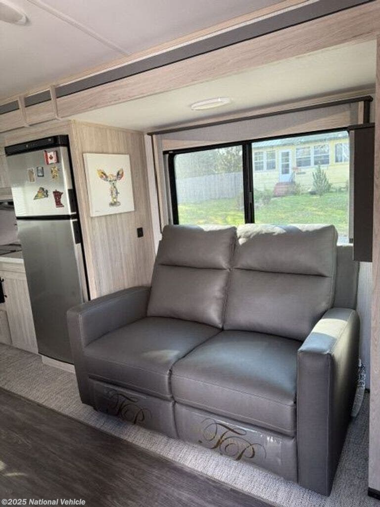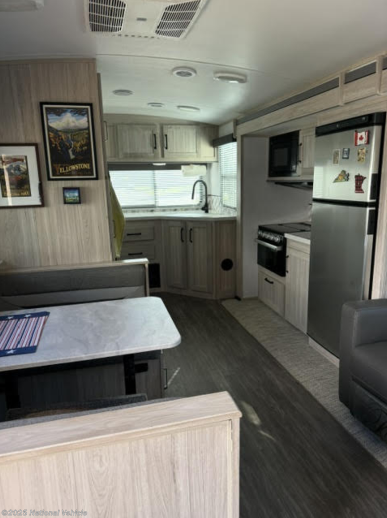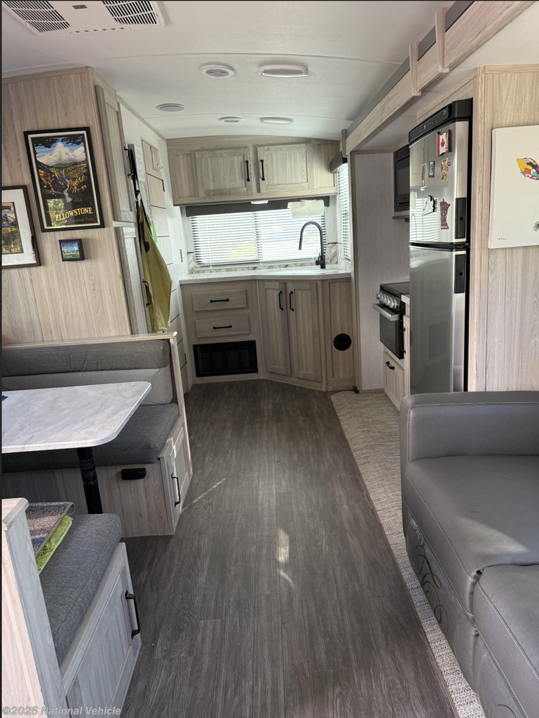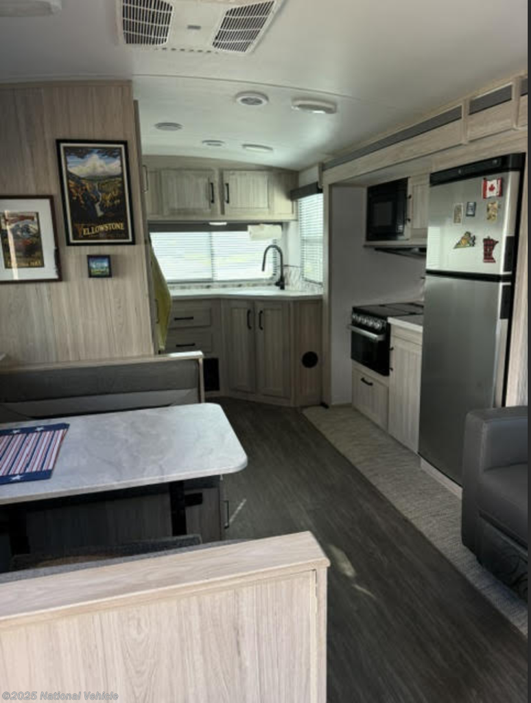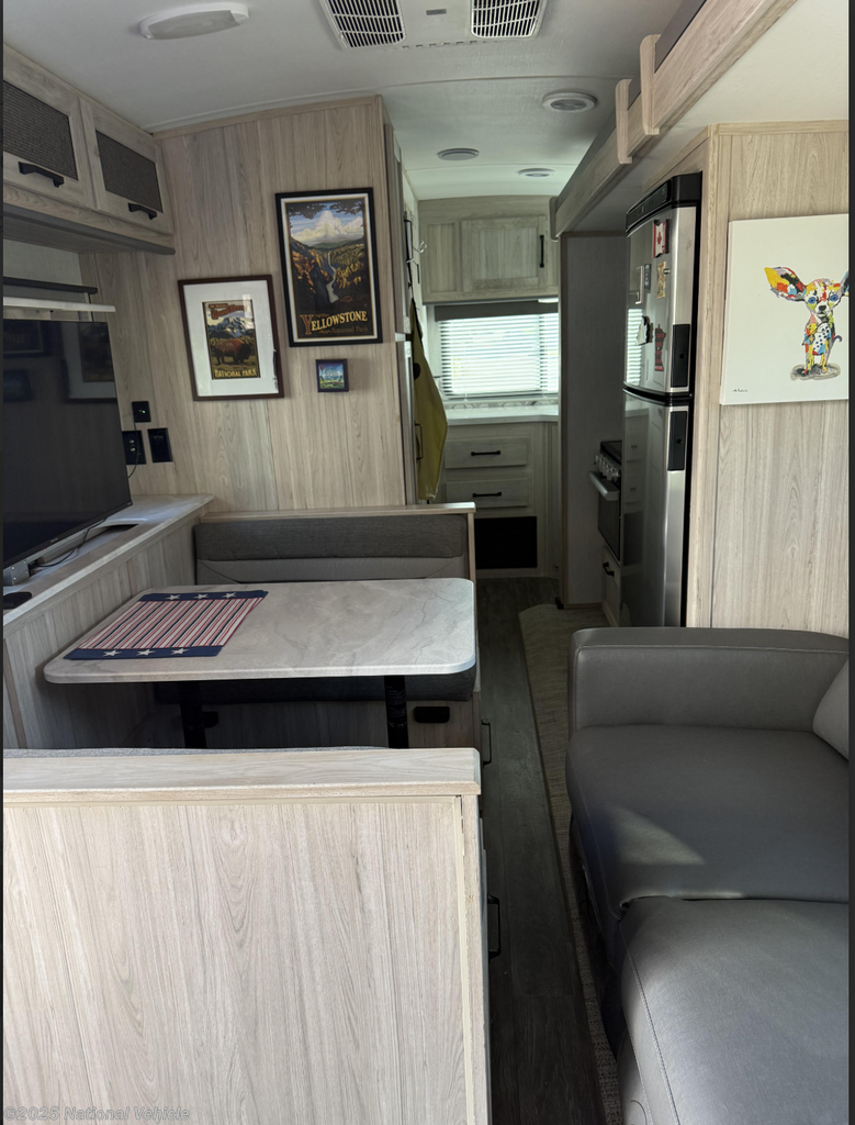 Step inside and you?re greeted by a bright, contemporary interior with residential touches throughout. The front private bedroom features a true queen-size bed with storage underneath, while the rear of the trailer offers a spacious dinette in a large slide-out ? perfect for meals, games, or converting into extra sleeping space. The full kitchen includes solid-surface countertops, a three-burner range with oven, microwave, large stainless-steel sink, and a 10 cu. ft. refrigerator.
