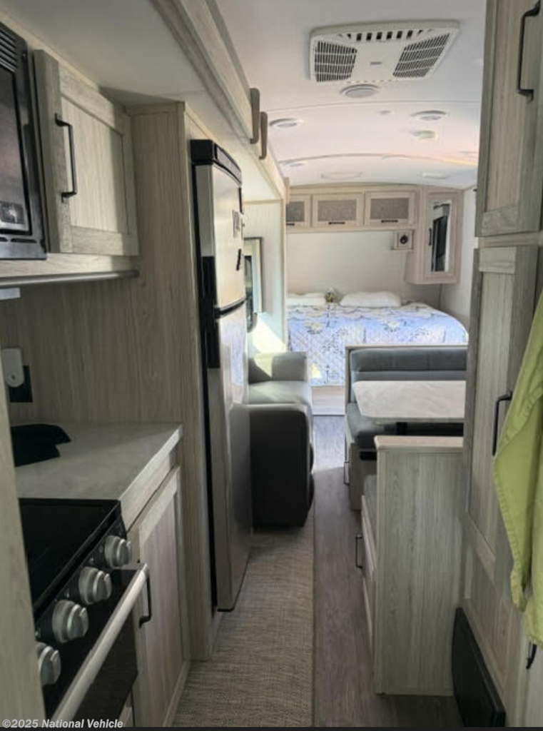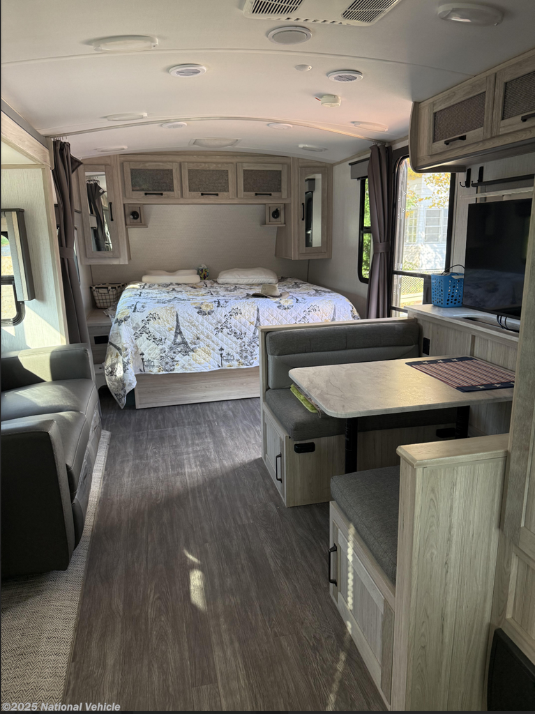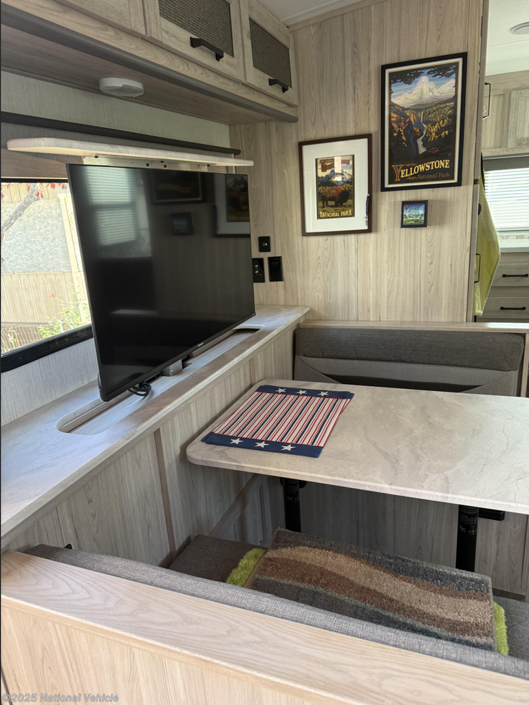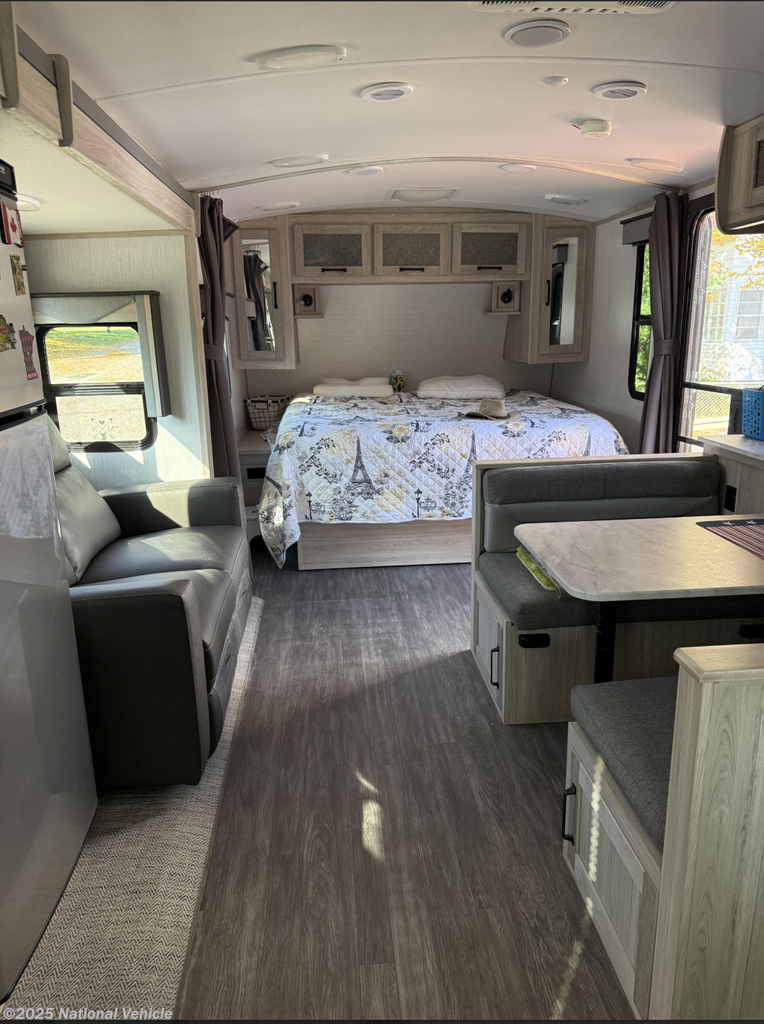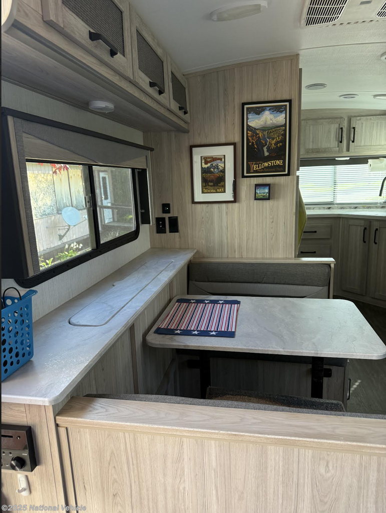 Step inside and you?re greeted by a bright, contemporary interior with residential touches throughout. The front private bedroom features a true queen-size bed with storage underneath, while the rear of the trailer offers a spacious dinette in a large slide-out ? perfect for meals, games, or converting into extra sleeping space. The full kitchen includes solid-surface countertops, a three-burner range with oven, microwave, large stainless-steel sink, and a 10 cu. ft. refrigerator.