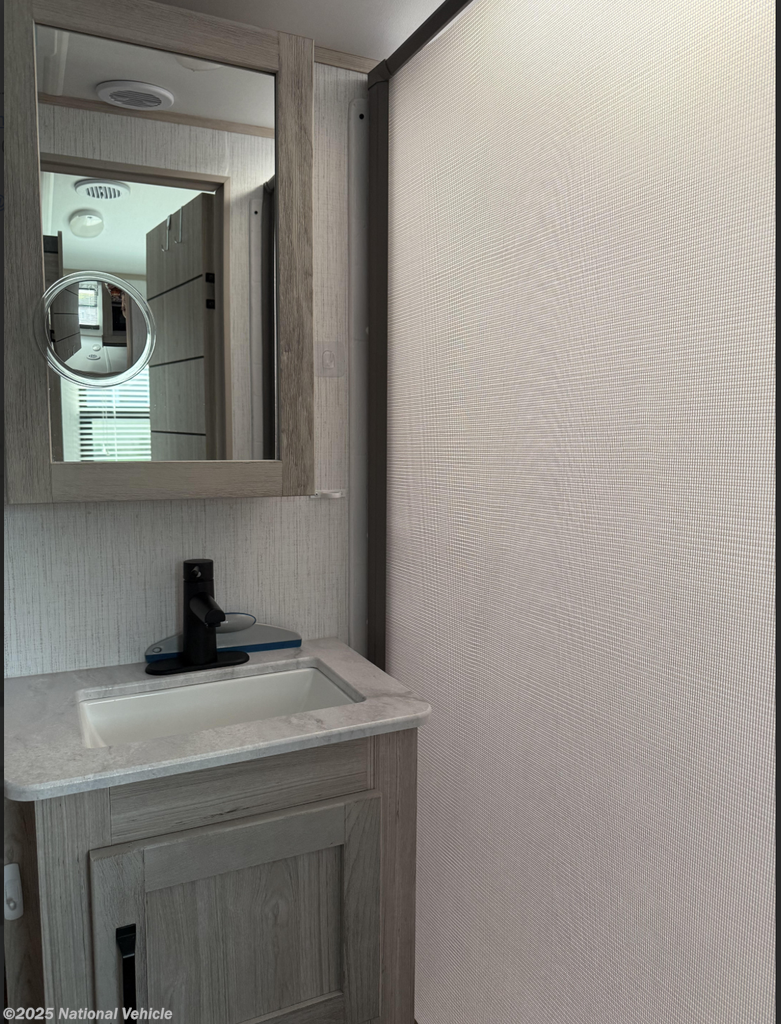 The full rear bath includes a glass-door shower, vanity, and linen storage, offering the kind of comfort usually found in larger units. Exterior features like the power awning with LED lighting, outdoor speakers, solid entry steps, and pass-through storage make life outside just as enjoyable.
