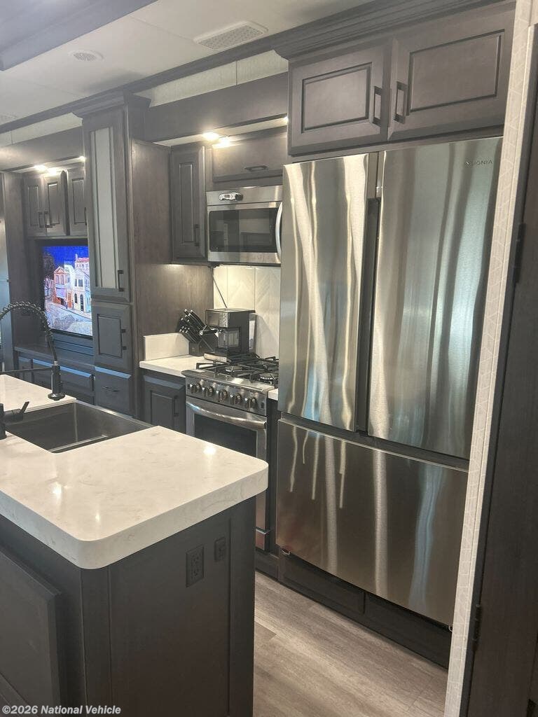 The kitchen features hardwood cabinets, solid surface counters, residential refrigerator/freezer with an ice maker, 4-burner gas stove, microwave-convection oven, a dishwasher, and a large sink for easy cleanup. The free standing dinette table provides comfortable seating to enjoy meals.