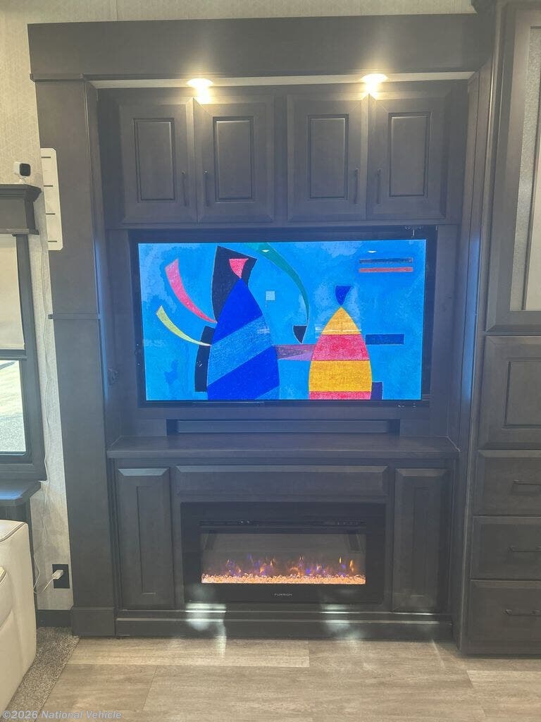 The living area features a flat screen LG OLED TV with home theater system, sofa sleeper, and an electric fireplace.