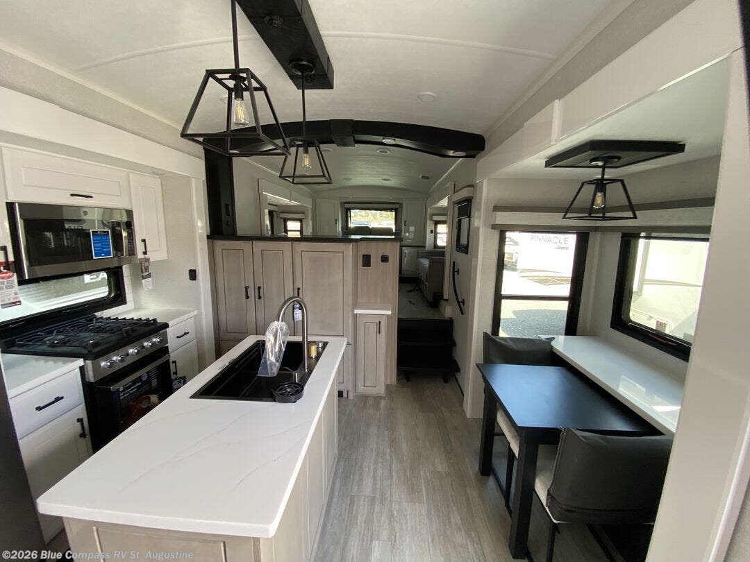 Luxury abounds in this fifth wheel made for full-time living! Step inside and you'll be wowed by the large living area with two sofas, and an entertainment center with a fireplace. The kids or your guests can make this area their bedroom at night, while you and your spouse claim the master suite all to yourselves. Here, you'll sleep soundly on the king bed, and you'll find plenty of storage space, including a dresser for your clothes. You will love waking up in the morning and heading to the gourmet kitchen up front that includes a lighted pantry, dual slides for added space, plus a counter with stools the kids are sure to love. This model also includes its own designated closet that has been prepped to add an optional washer and dryer. The only thing missing in this fifth wheel is you!
