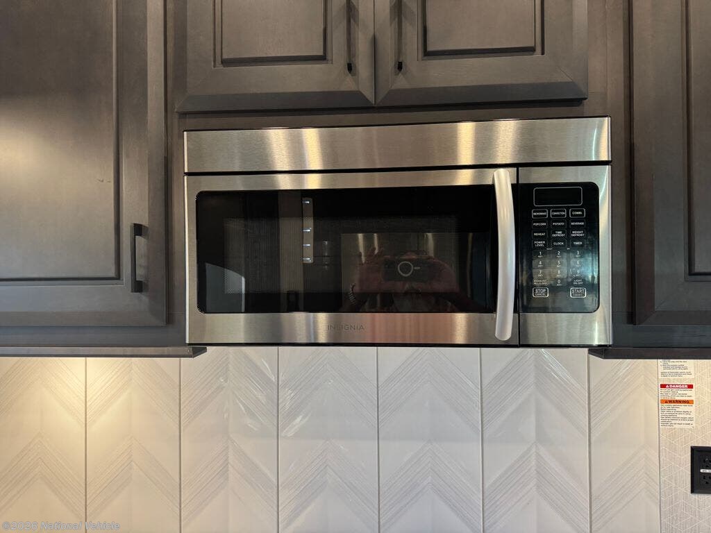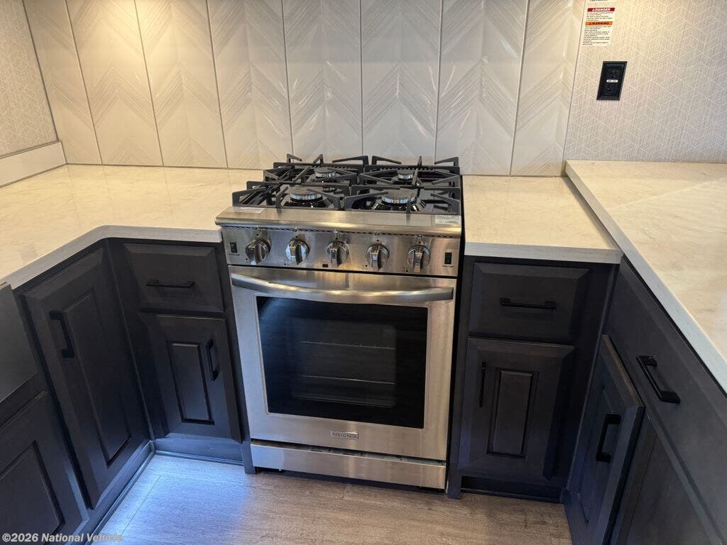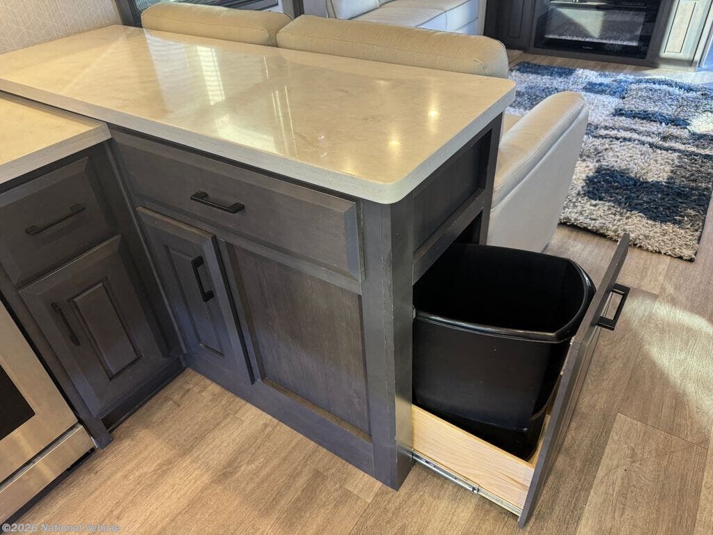 The stunning rear gourmet kitchen is a chef?s dream, featuring solid hardwood cabinetry, solid-surface countertops, residential stainless-steel appliances, a large pantry, and abundant counter space for cooking and entertaining. The central living area boasts dual recliners, a sofa sleeper, an entertainment center with a large TV, and a beautiful fireplace, creating a warm, inviting space that feels truly like home.