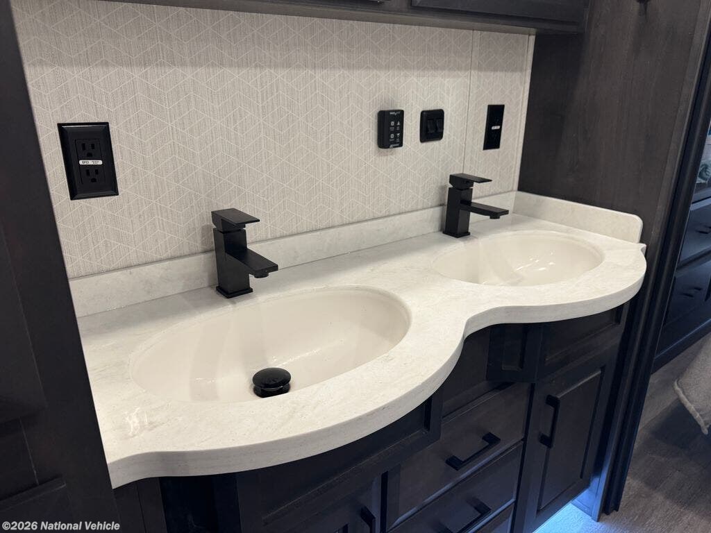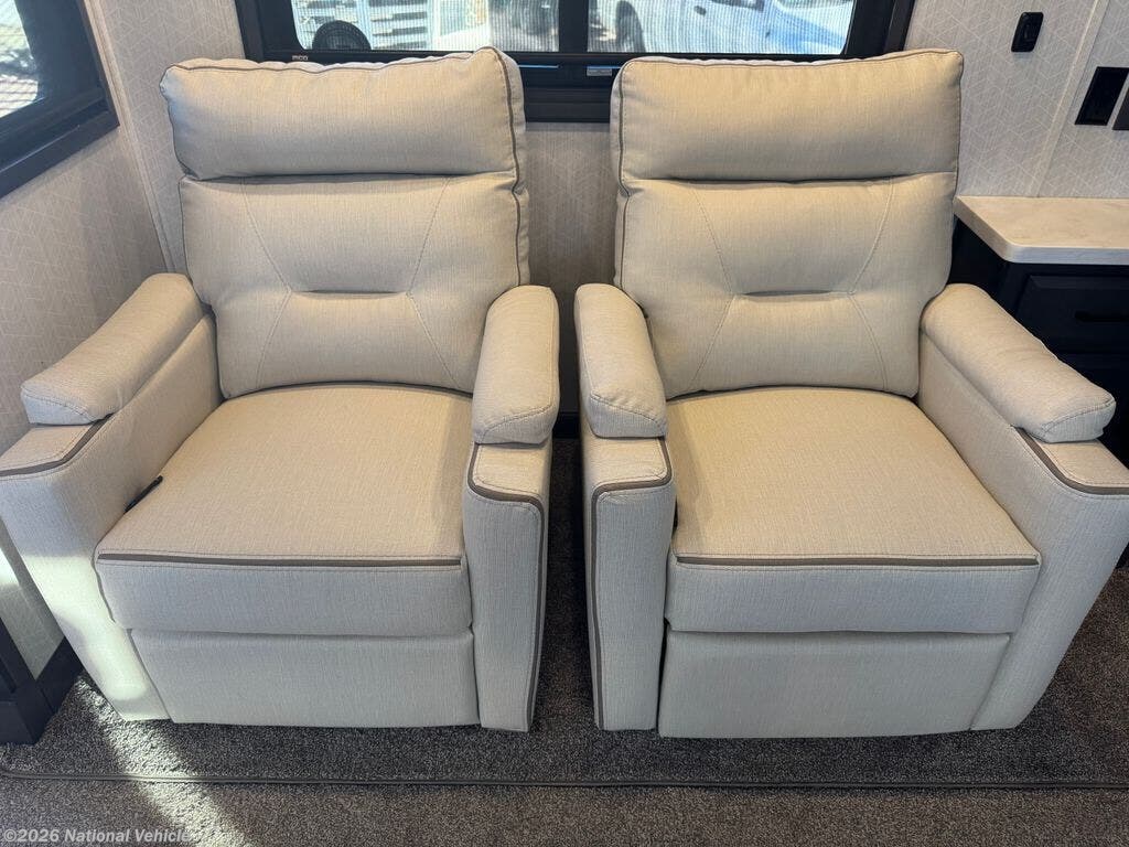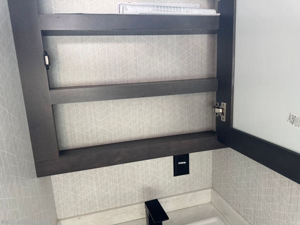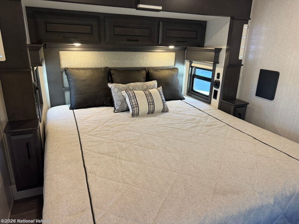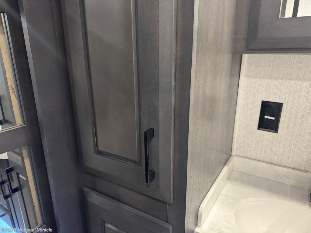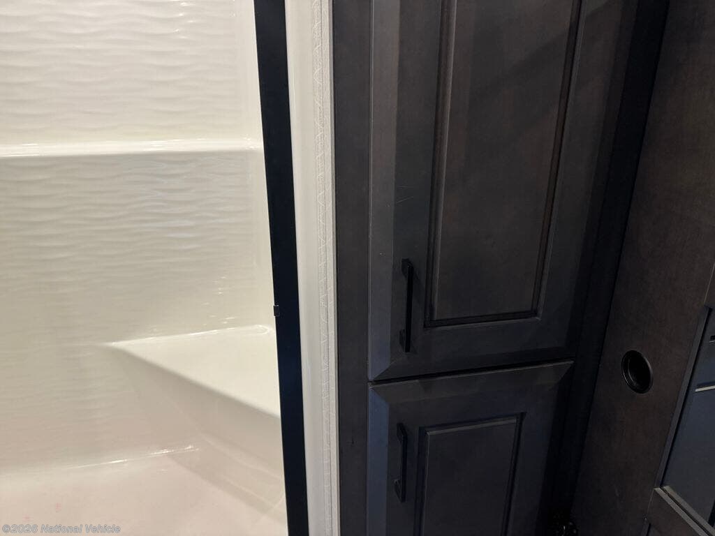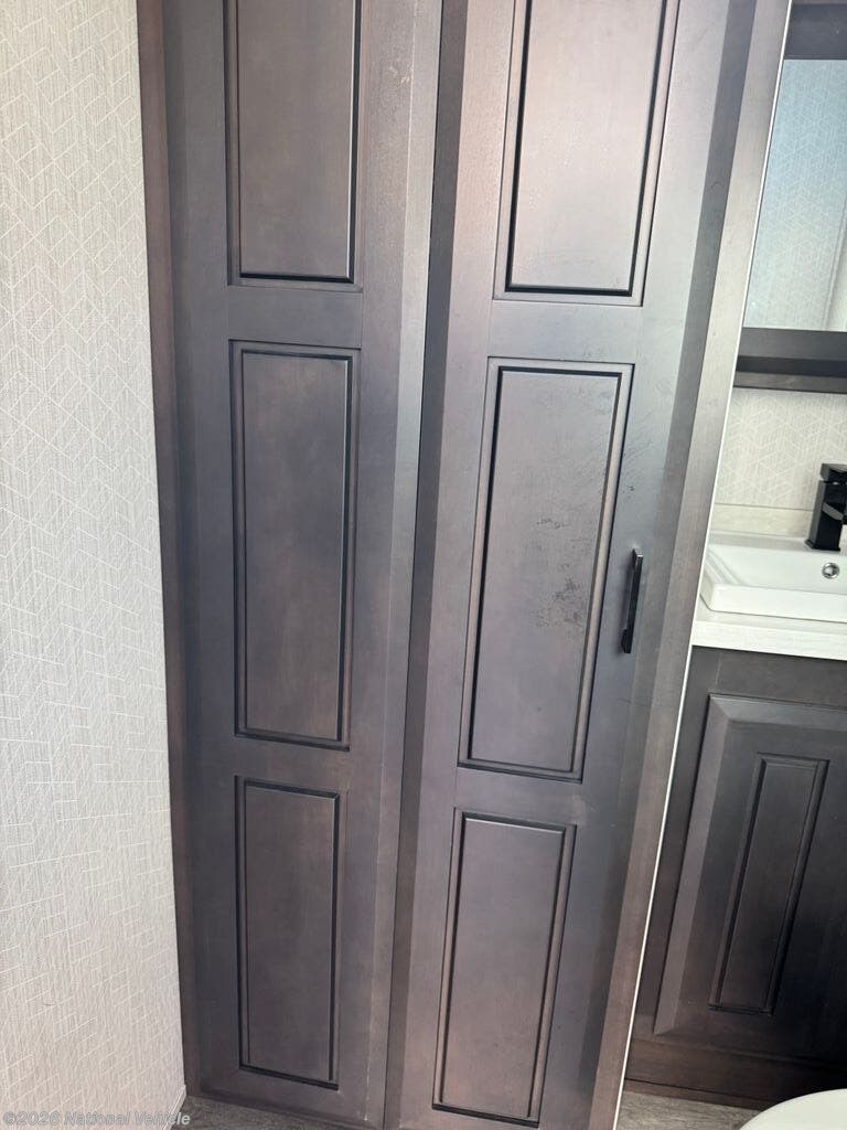 Mid-coach, you?ll find a guest half bath, perfect for hosting friends or providing extra convenience during travel. Upstairs, the luxurious master suite includes a king bed, massive wardrobe, dresser storage, and direct access to the spa-inspired rear full bathroom. This elegant bath features dual sinks, a residential shower with seat, premium fixtures, linen storage, and a walk-in closet?offering a true residential feel unmatched in most fifth wheels.