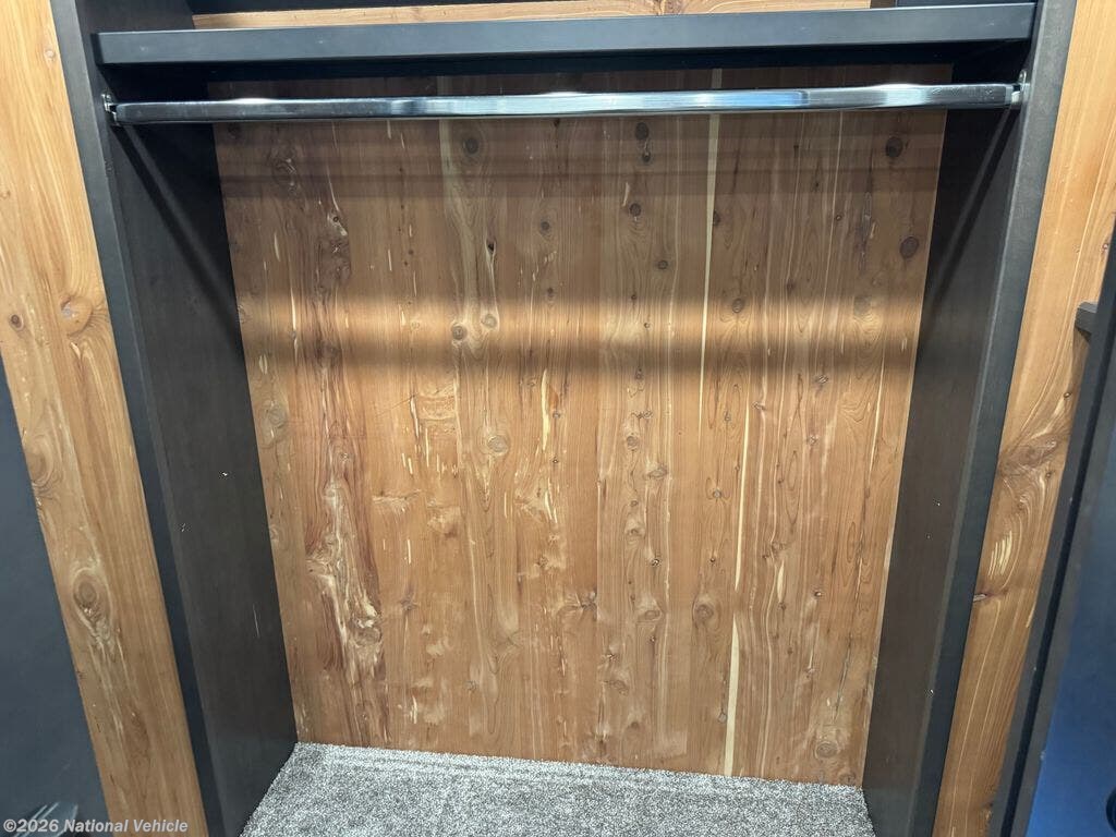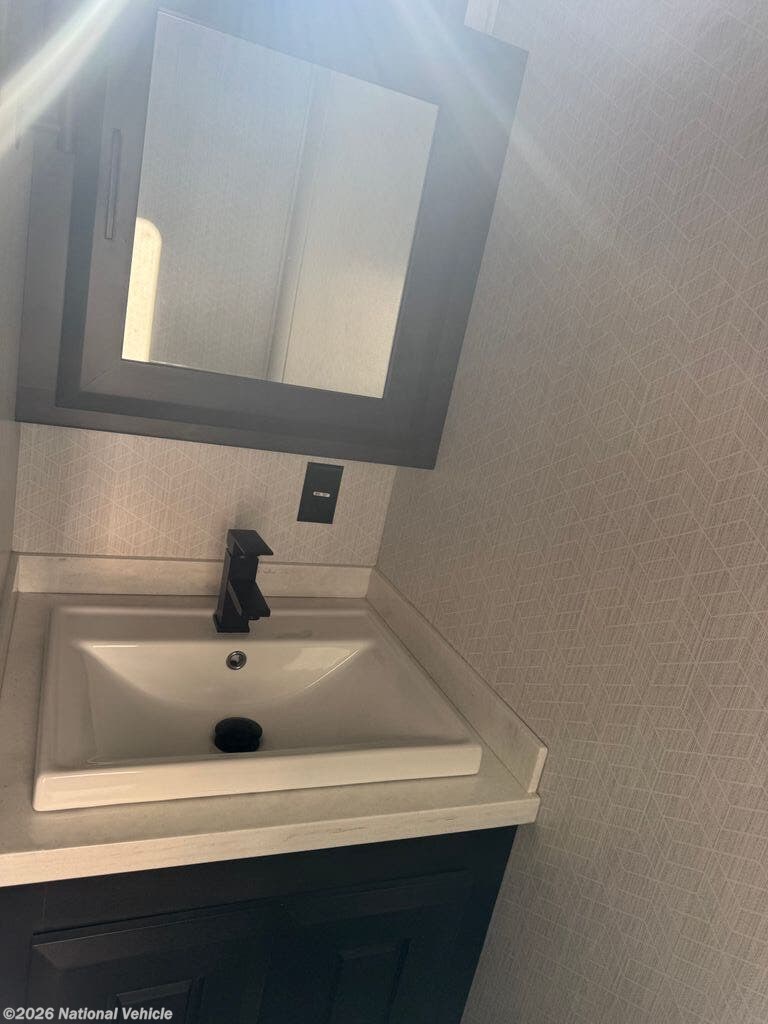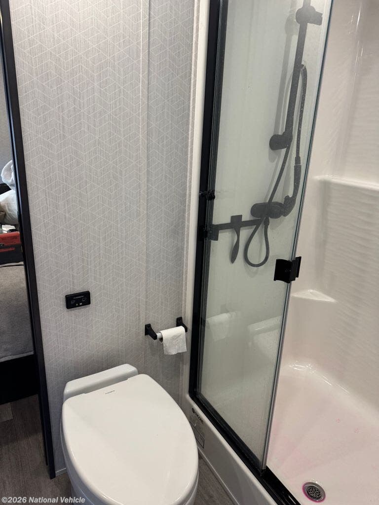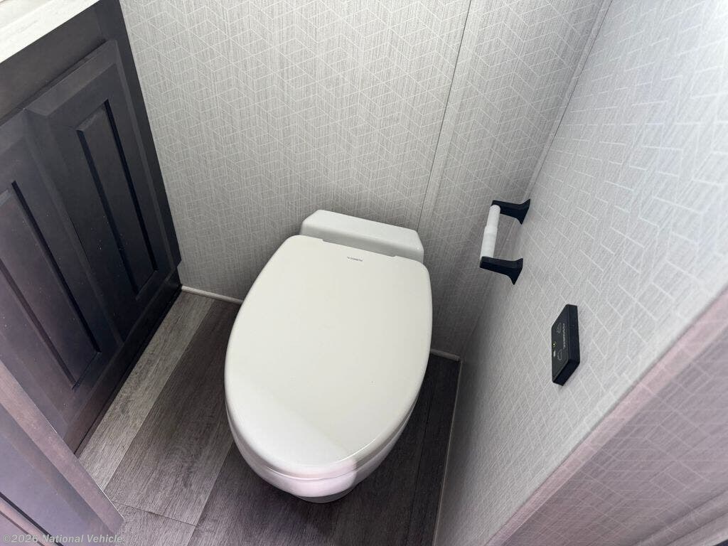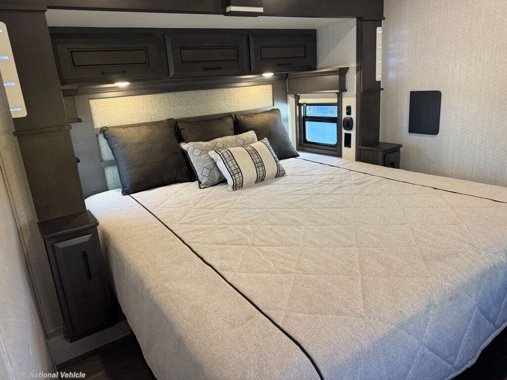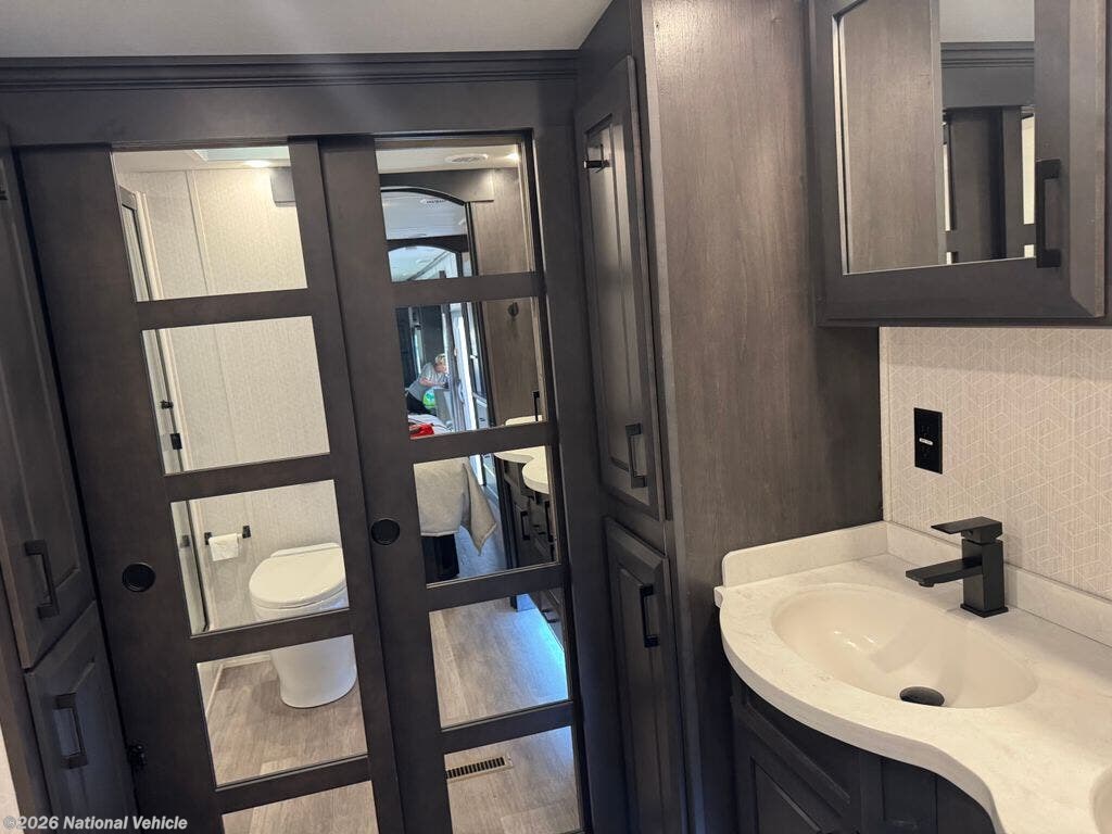 Mid-coach, you?ll find a guest half bath, perfect for hosting friends or providing extra convenience during travel. Upstairs, the luxurious master suite includes a king bed, massive wardrobe, dresser storage, and direct access to the spa-inspired rear full bathroom. This elegant bath features dual sinks, a residential shower with seat, premium fixtures, linen storage, and a walk-in closet?offering a true residential feel unmatched in most fifth wheels.