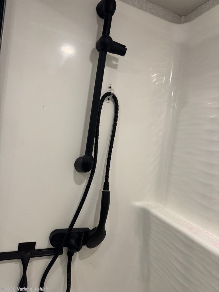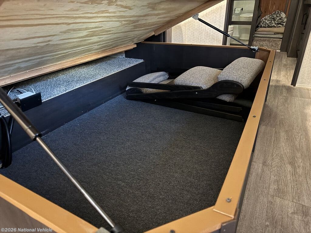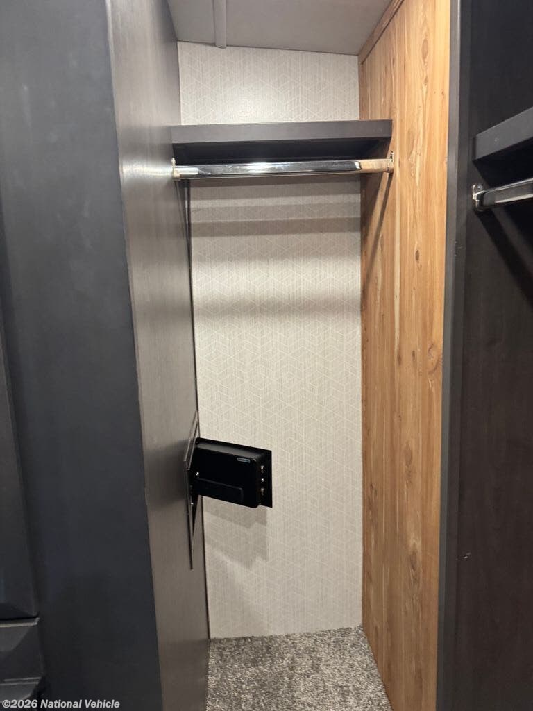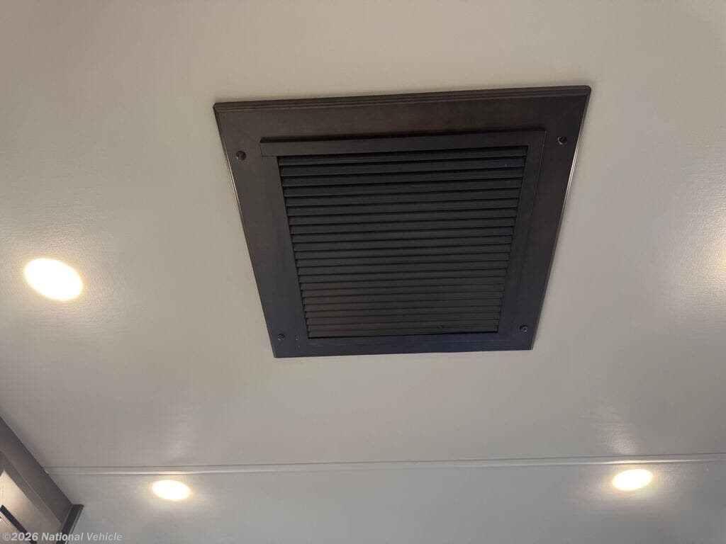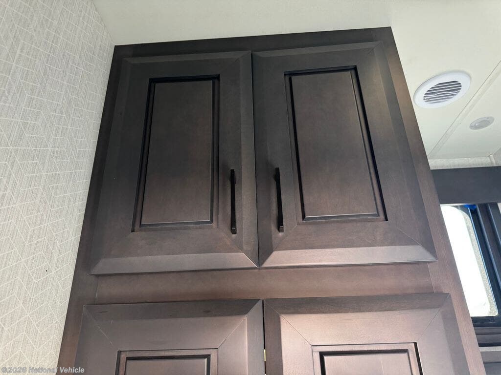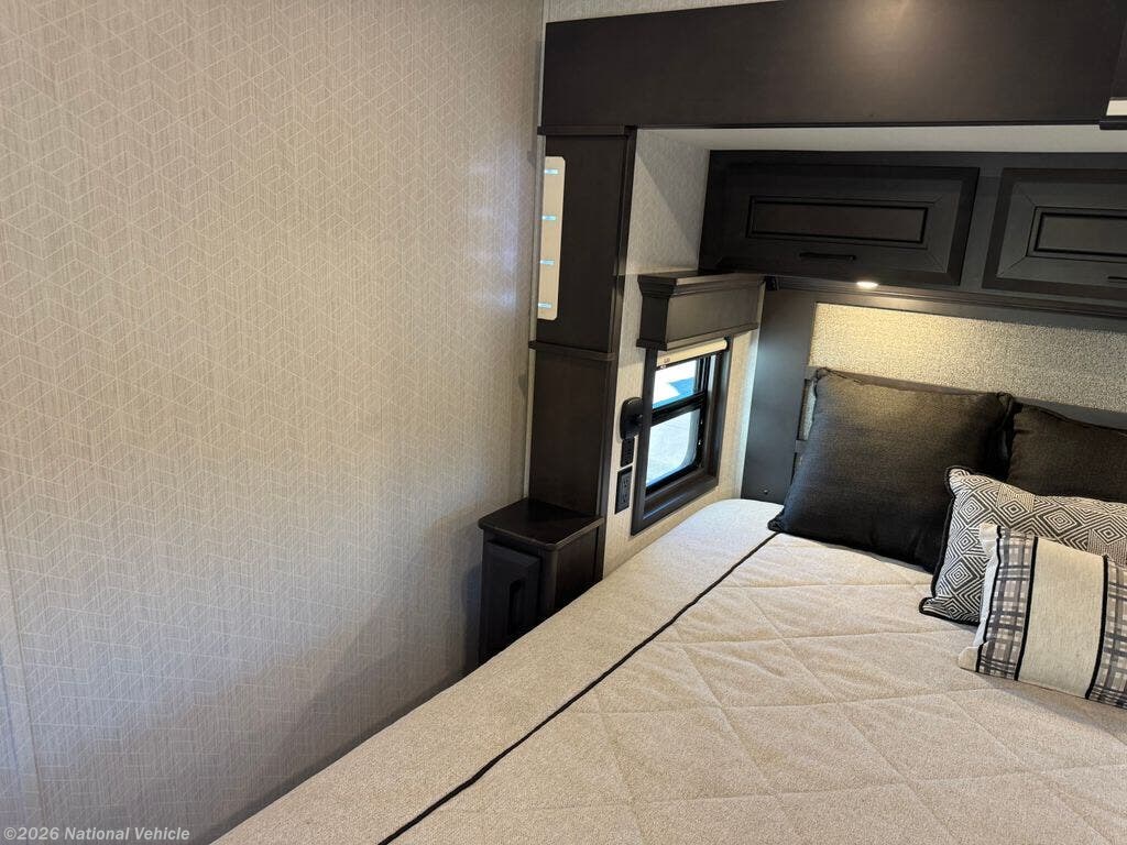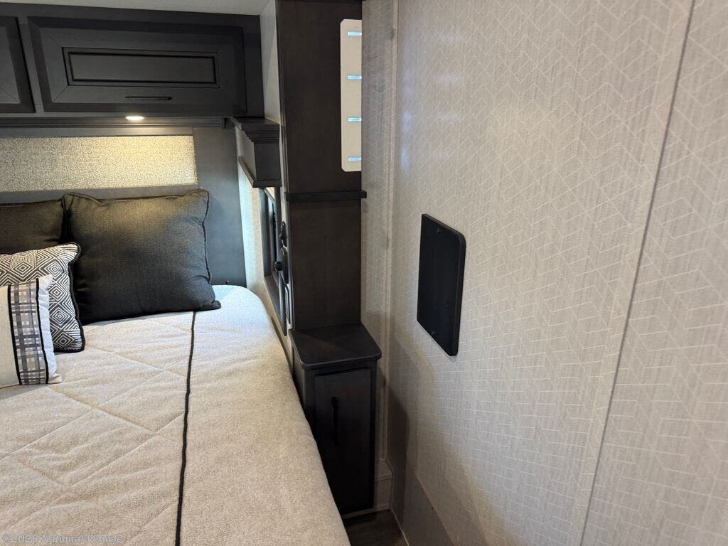 Mid-coach, you?ll find a guest half bath, perfect for hosting friends or providing extra convenience during travel. Upstairs, the luxurious master suite includes a king bed, massive wardrobe, dresser storage, and direct access to the spa-inspired rear full bathroom. This elegant bath features dual sinks, a residential shower with seat, premium fixtures, linen storage, and a walk-in closet?offering a true residential feel unmatched in most fifth wheels.