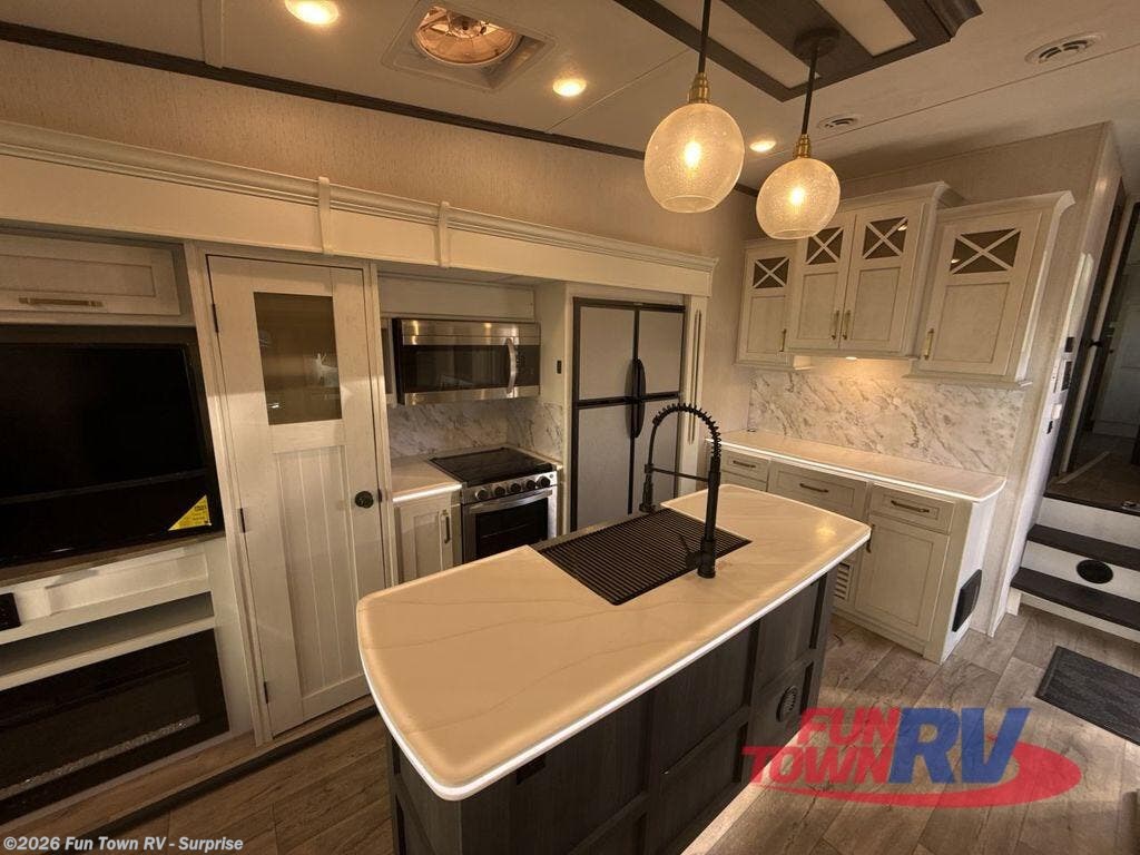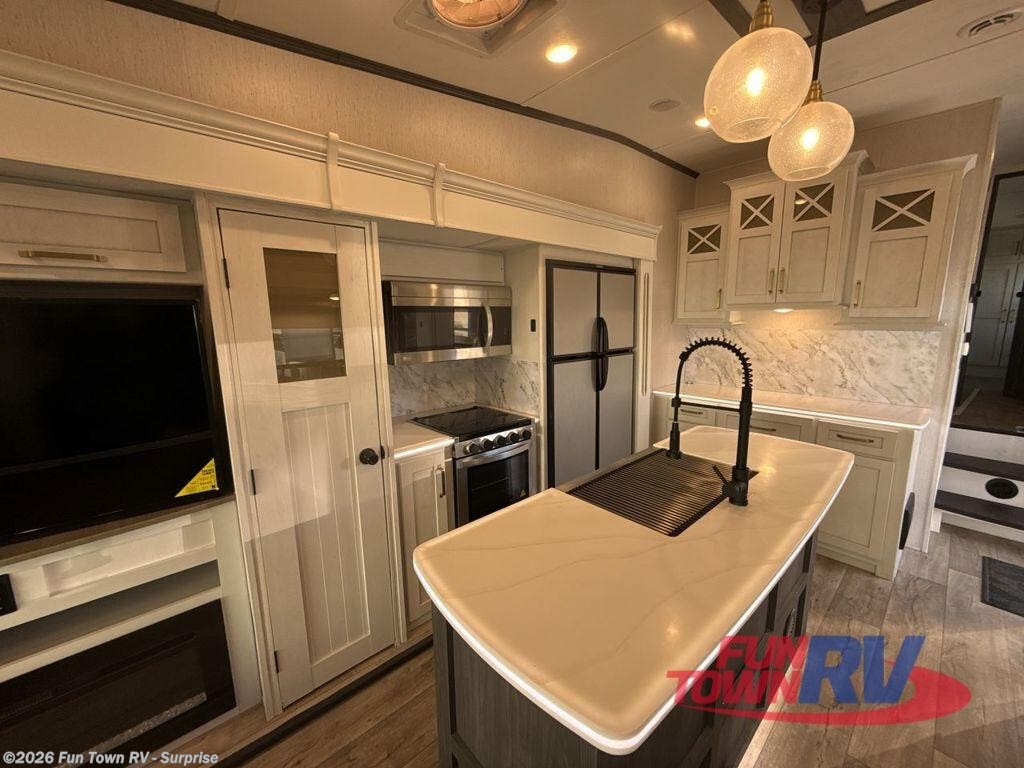Two can get ready at once with a dual sink vanity in the full bathroom of this fifth wheel! Enjoy a good night's rest and walking around space with the king bed slide in the front private bedroom which also has a front wardrobe to keep your clothes looking their best, and a closet prepped for a washer/dryer option. The chef will have an easy time preparing meals in the kitchen with the island, the extra countertop space below the hutch, and the glass top three burner cooktop with 21" oven. The rear living area has a tri-fold sofa and theater seating across from an entertainment center with a fireplace and a 50" LED TV!