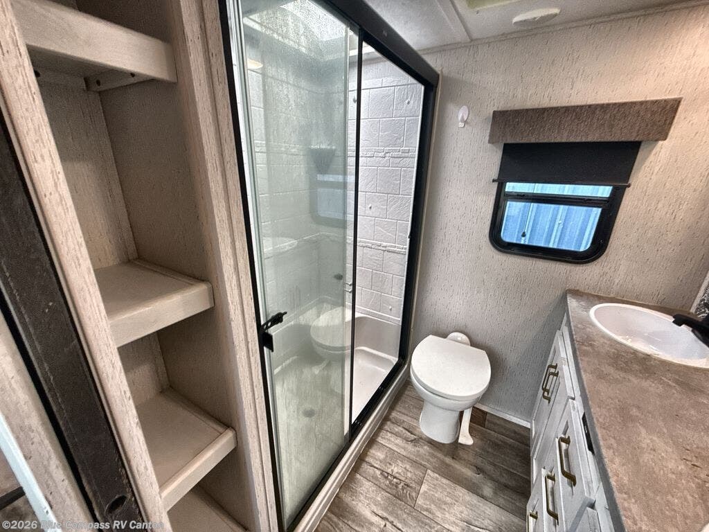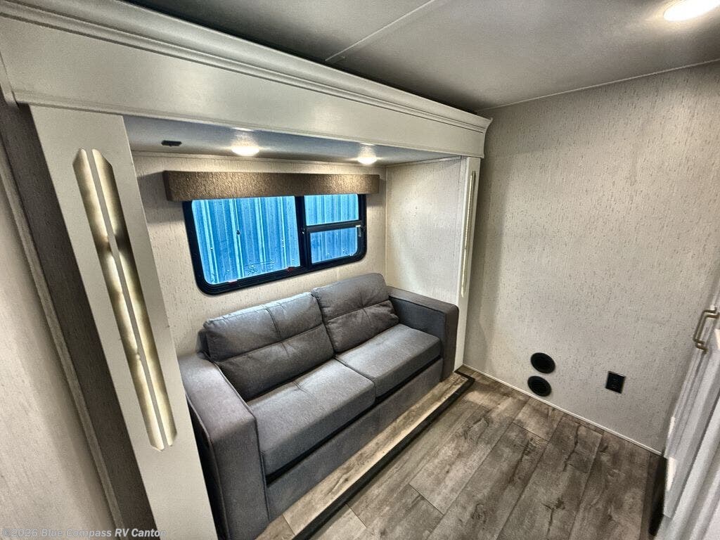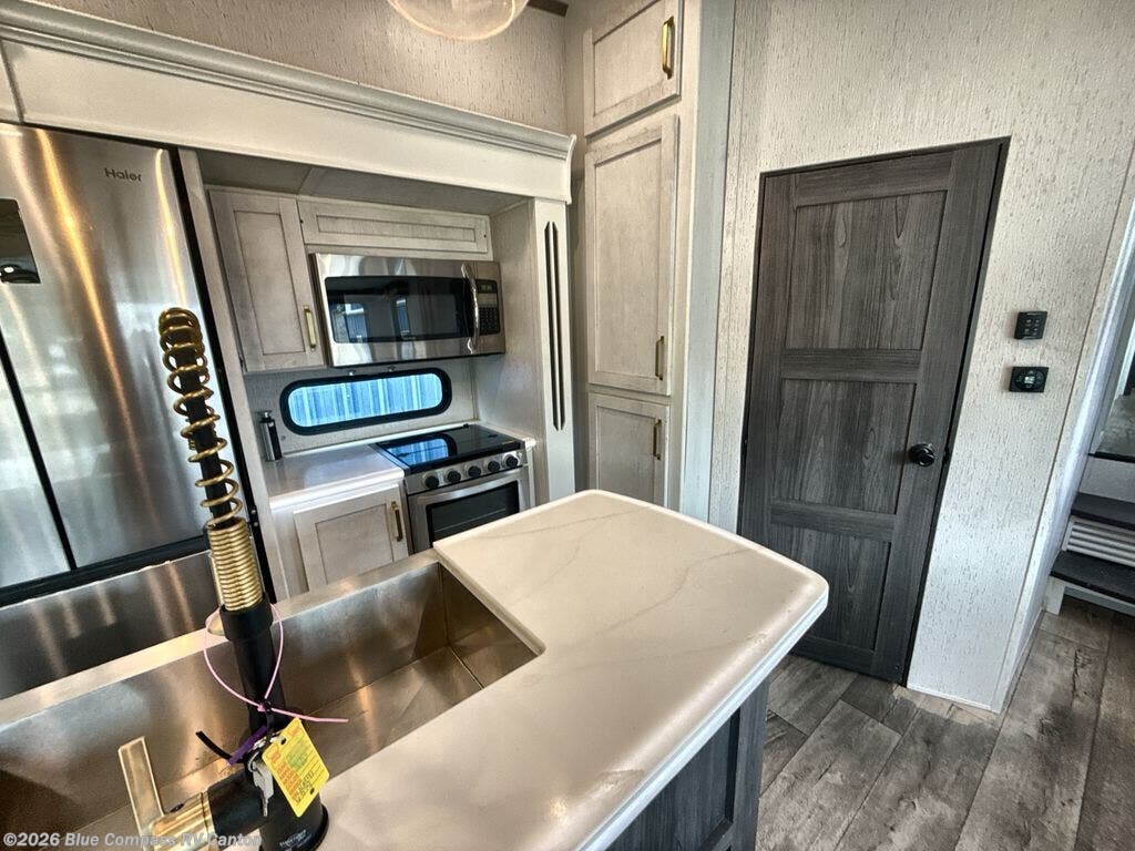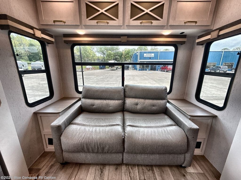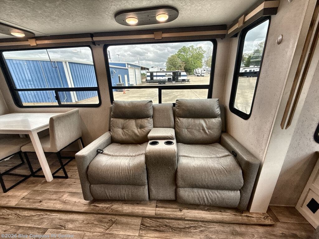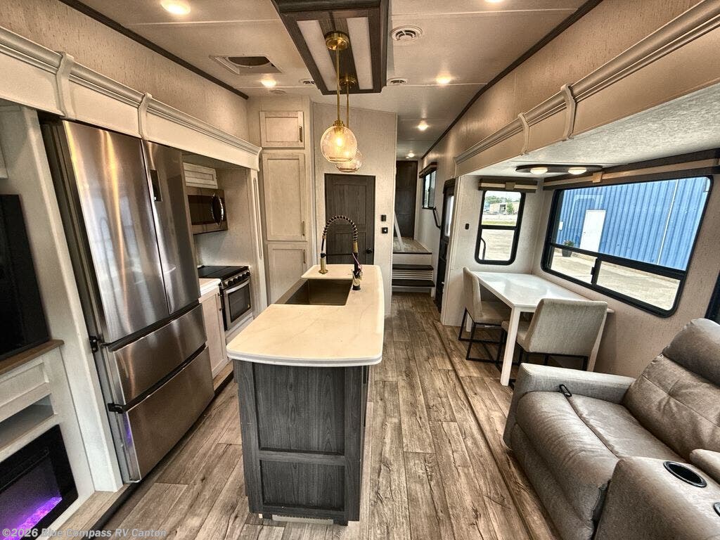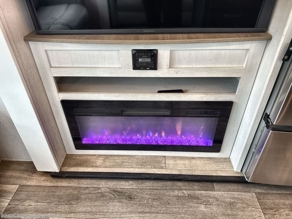 With a front bedroom and a middle multipurpose room in this fifth wheel, everyone will have a comfortable night's sleep when you include the living room furniture and the loft bed as sleeping space! The front private bedroom has a king bed slide and a front wardrobe to keep your clothes looking their best. The multipurpose room features a sofa slide and storage below a loft bed which can be used for sleeping or storage. A couple other guests can join in too and sleep on the rear tri-fold sofa and the booth dinette once they are converted. The full bathroom has a dual sink vanity to make it easier for everyone getting ready in the mornings. You can prepare your best meals with the glass top three burner cooktop with 21" oven, the 12 cu. ft. refrigerator, and the kitchen island. The theater seating is conveniently across from the entertainment center with a 50" LED TV and the fireplace.