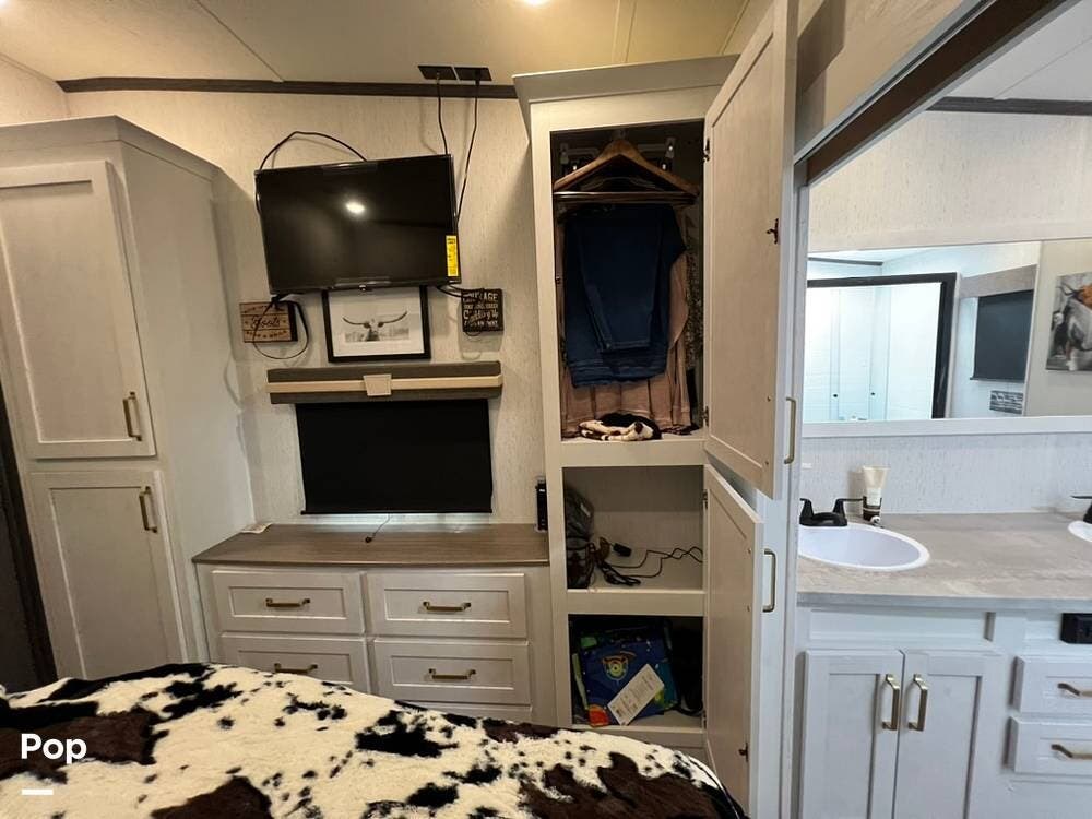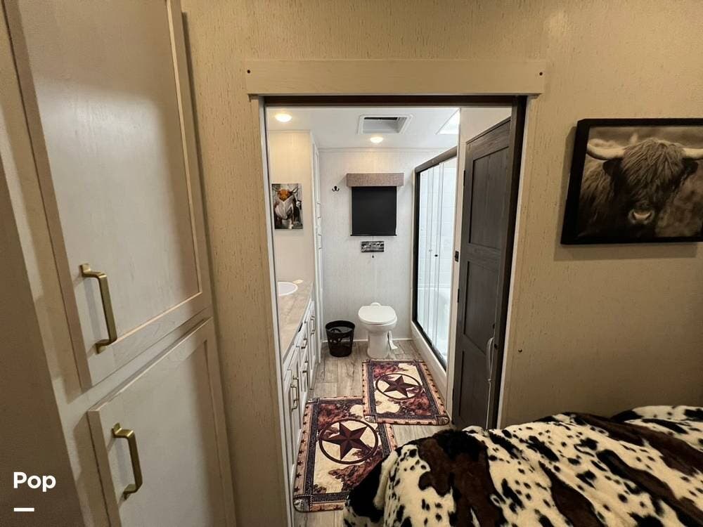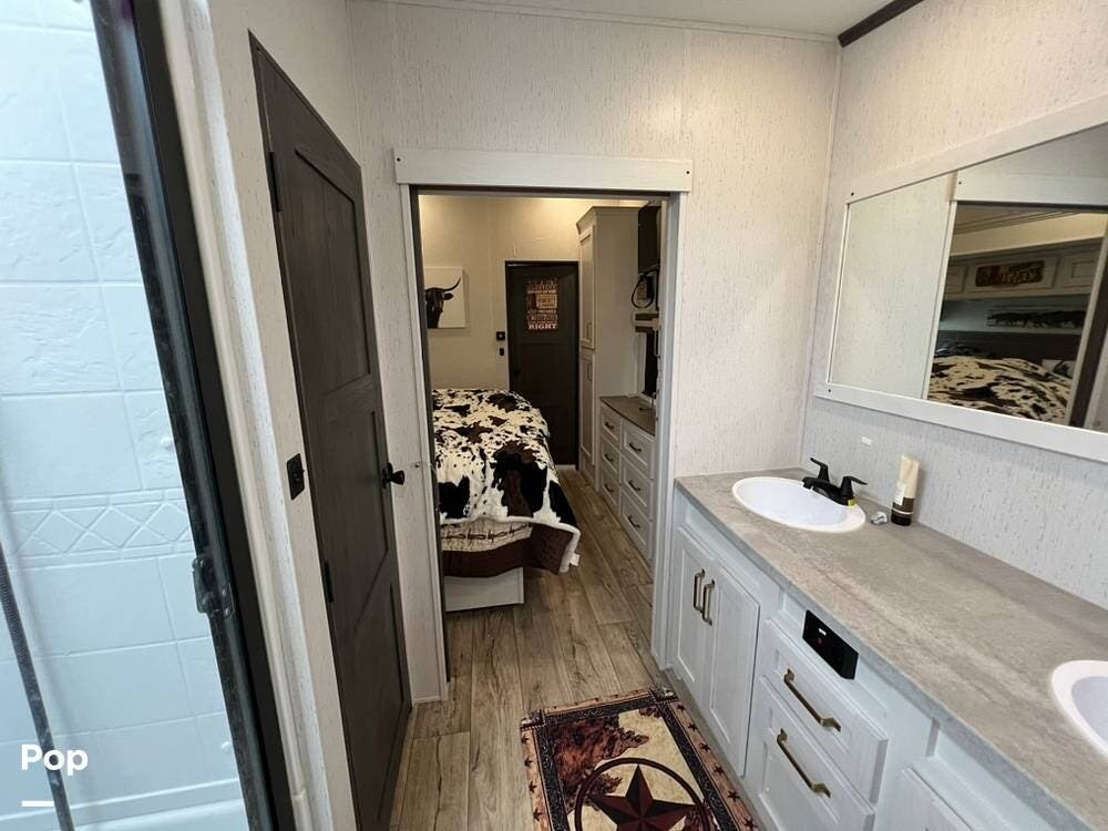 You will be impressed with the 3803FLP's at-home feel when you step inside. The living room has two sleeper sofas, two recliner theater seats, and a large entertainment center with a 40" fireplace.