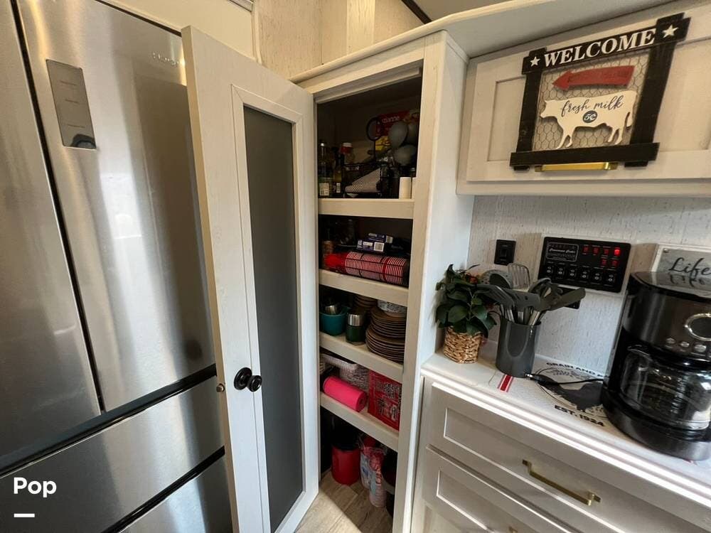 The kitchen has a large four-shelf pantry, a separate coffee nook, a 12 cu.ft. four-door refrigerator, a microwave, a three-burner range with a glass cover, and a 21" oven.