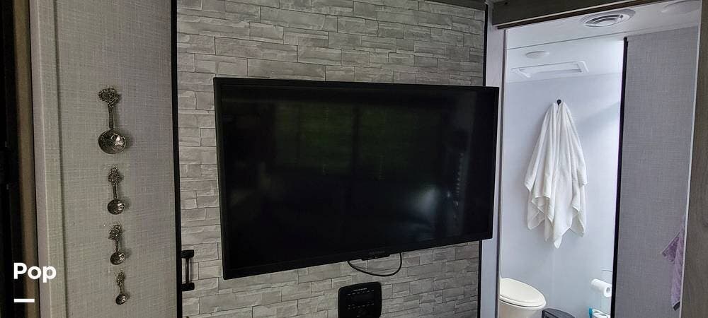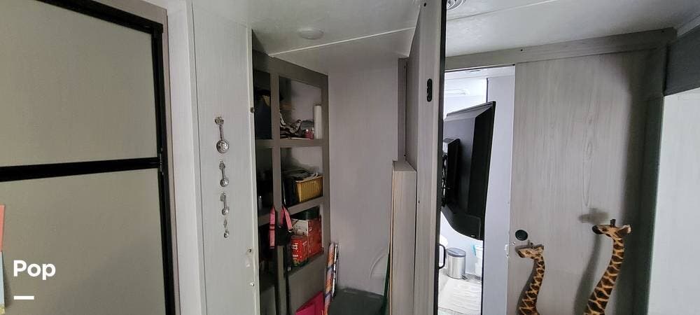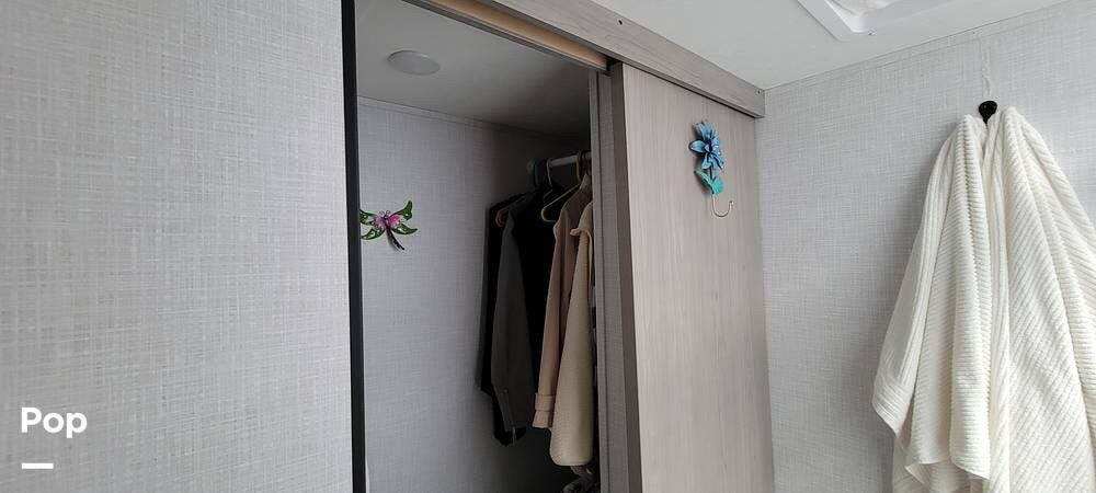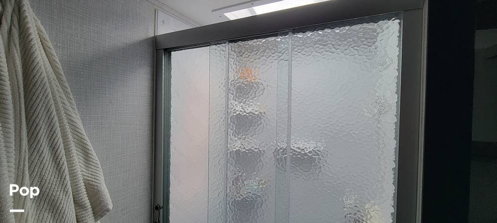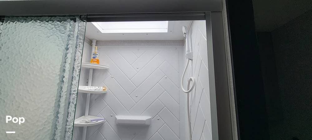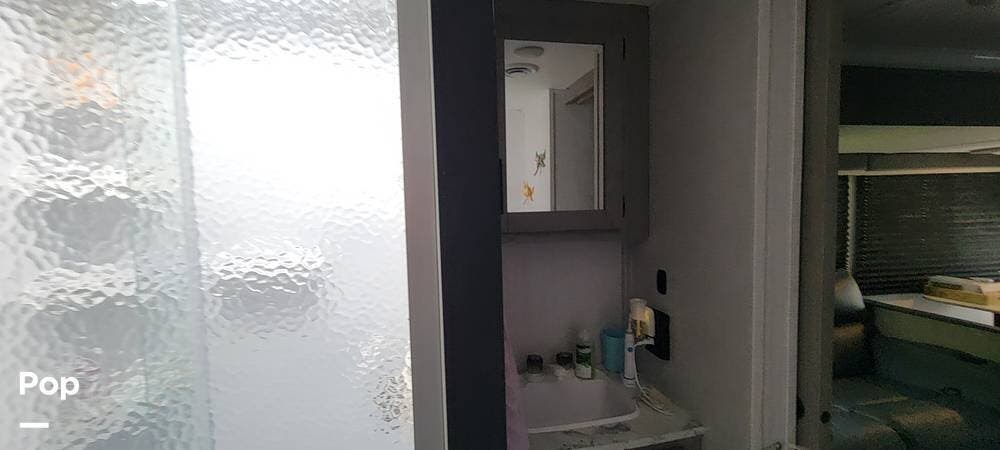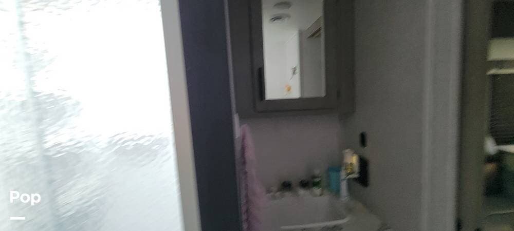 This RV features a private bathroom with a shower, sink, medicine cabinet, and toilet. It also has tons of storage space.