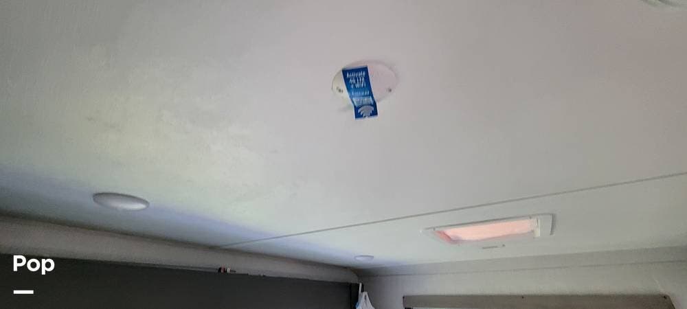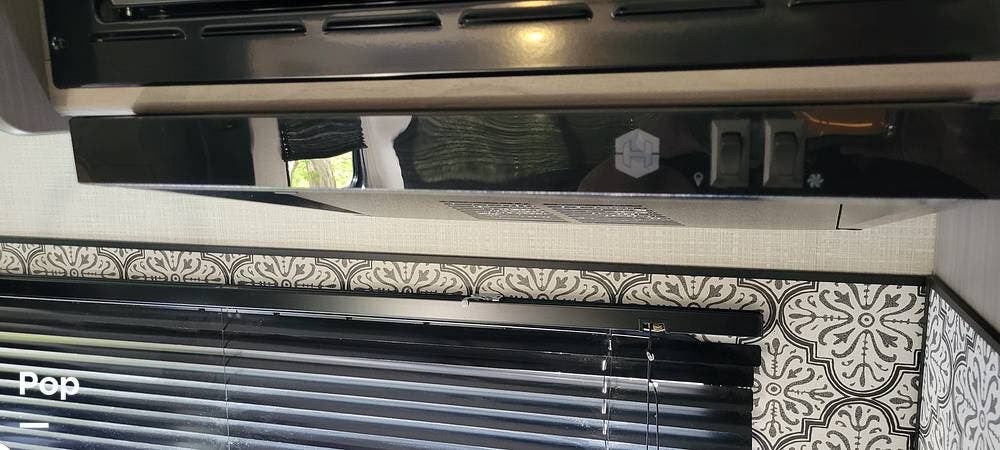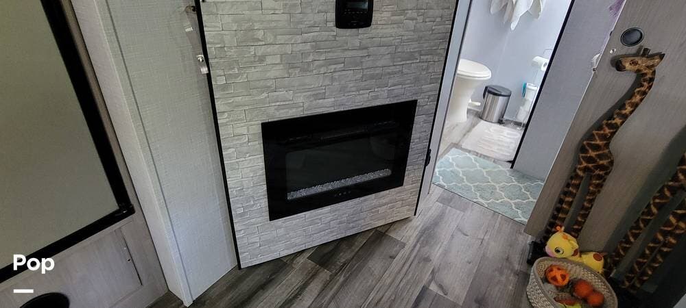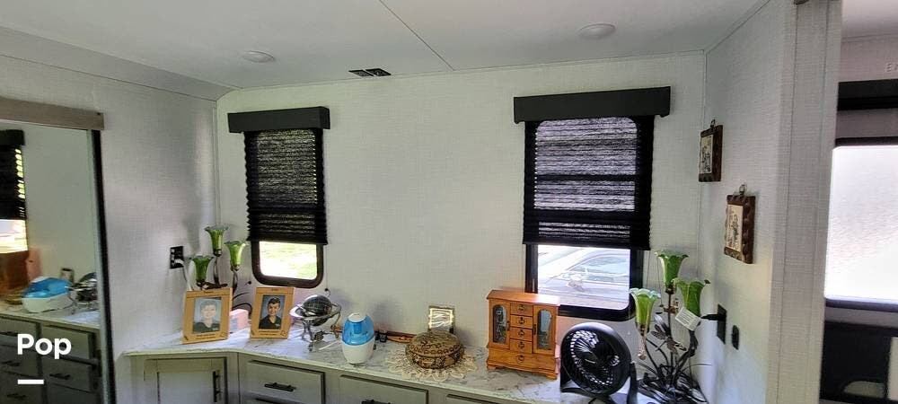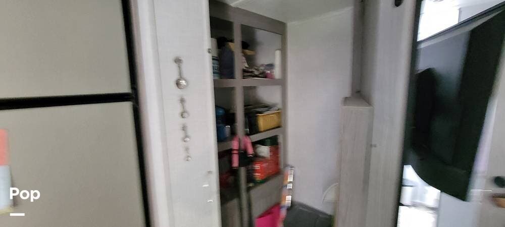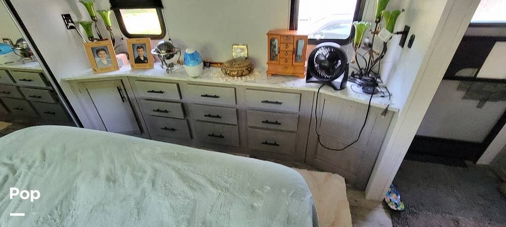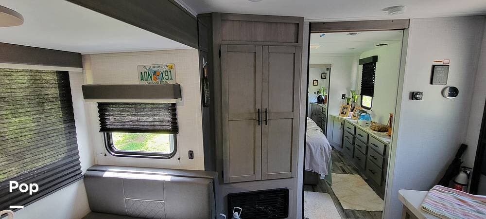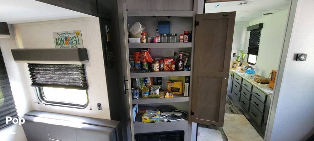 This RV features a private bathroom with a shower, sink, medicine cabinet, and toilet. It also has tons of storage space.
