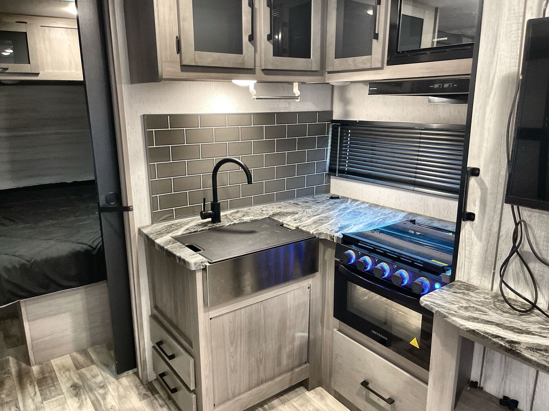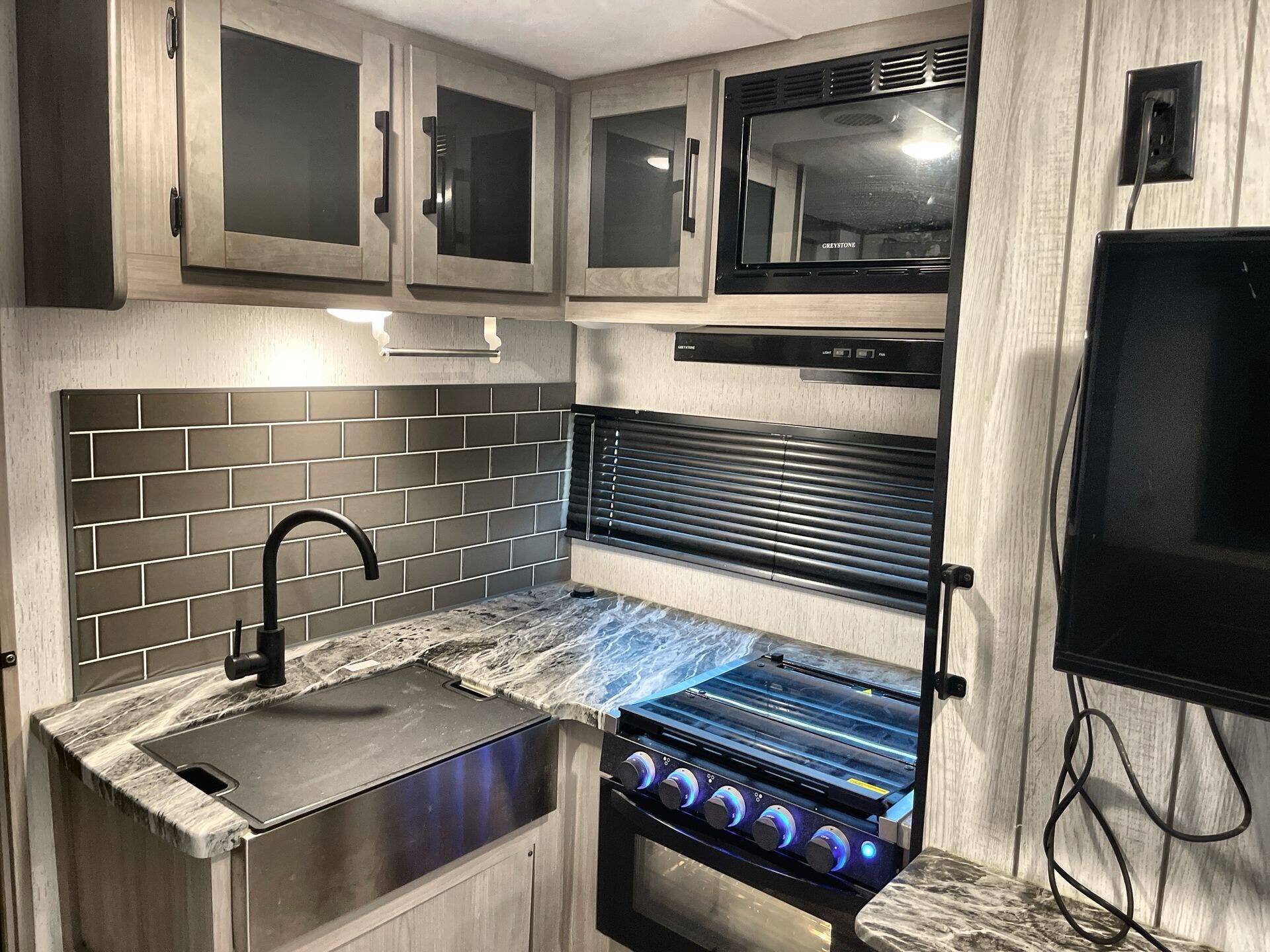 - Ceiling and safety features: CO Detector, LP Detector, Smoke Detector, Fire Extinguisher