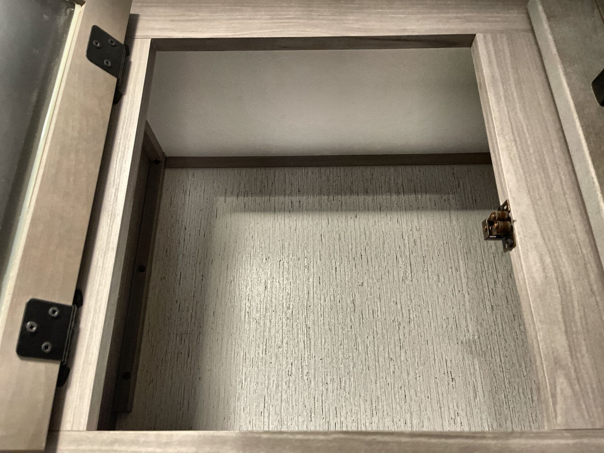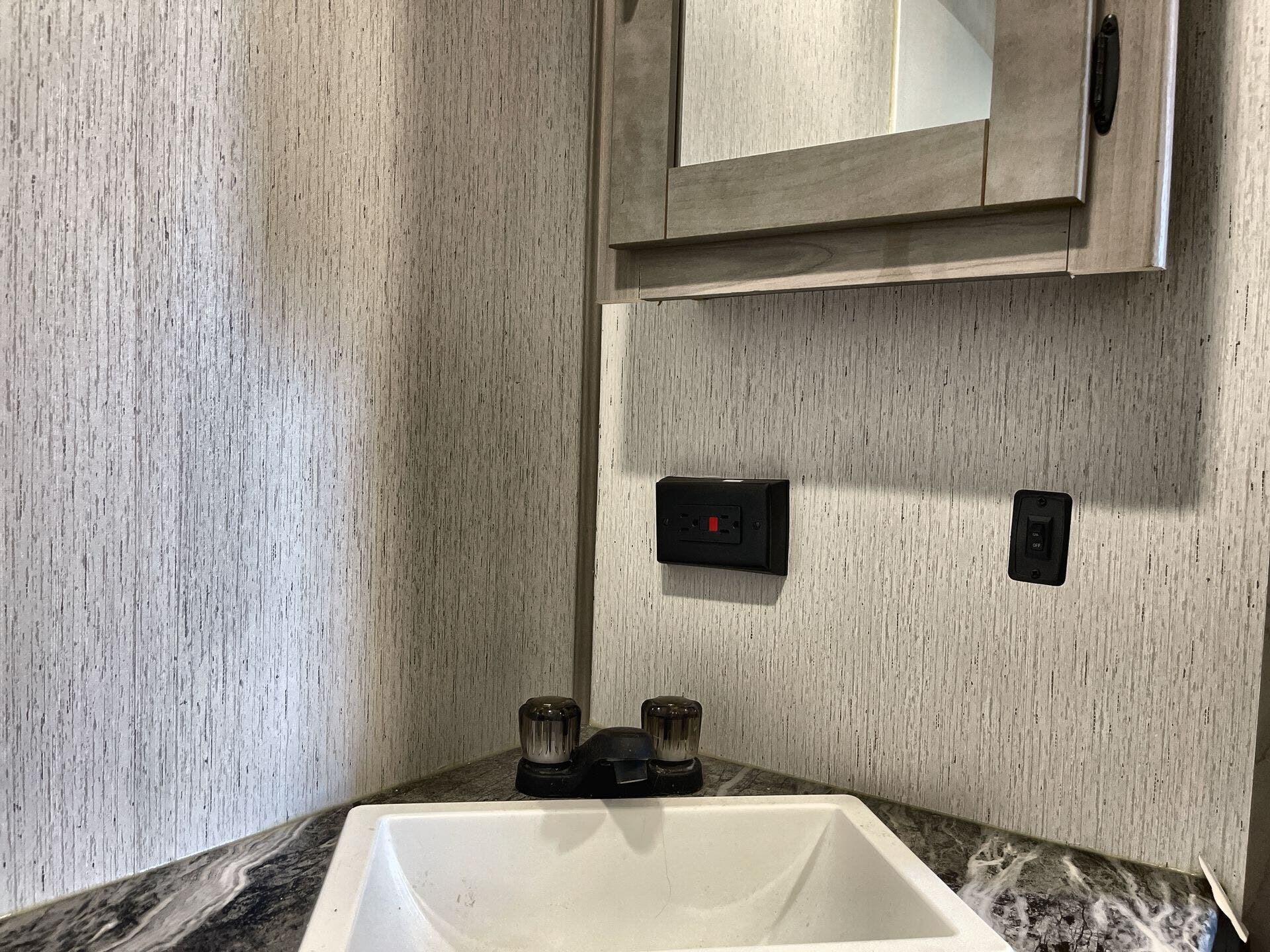 - TV for entertainment and a medicine cabinet in the bathroom