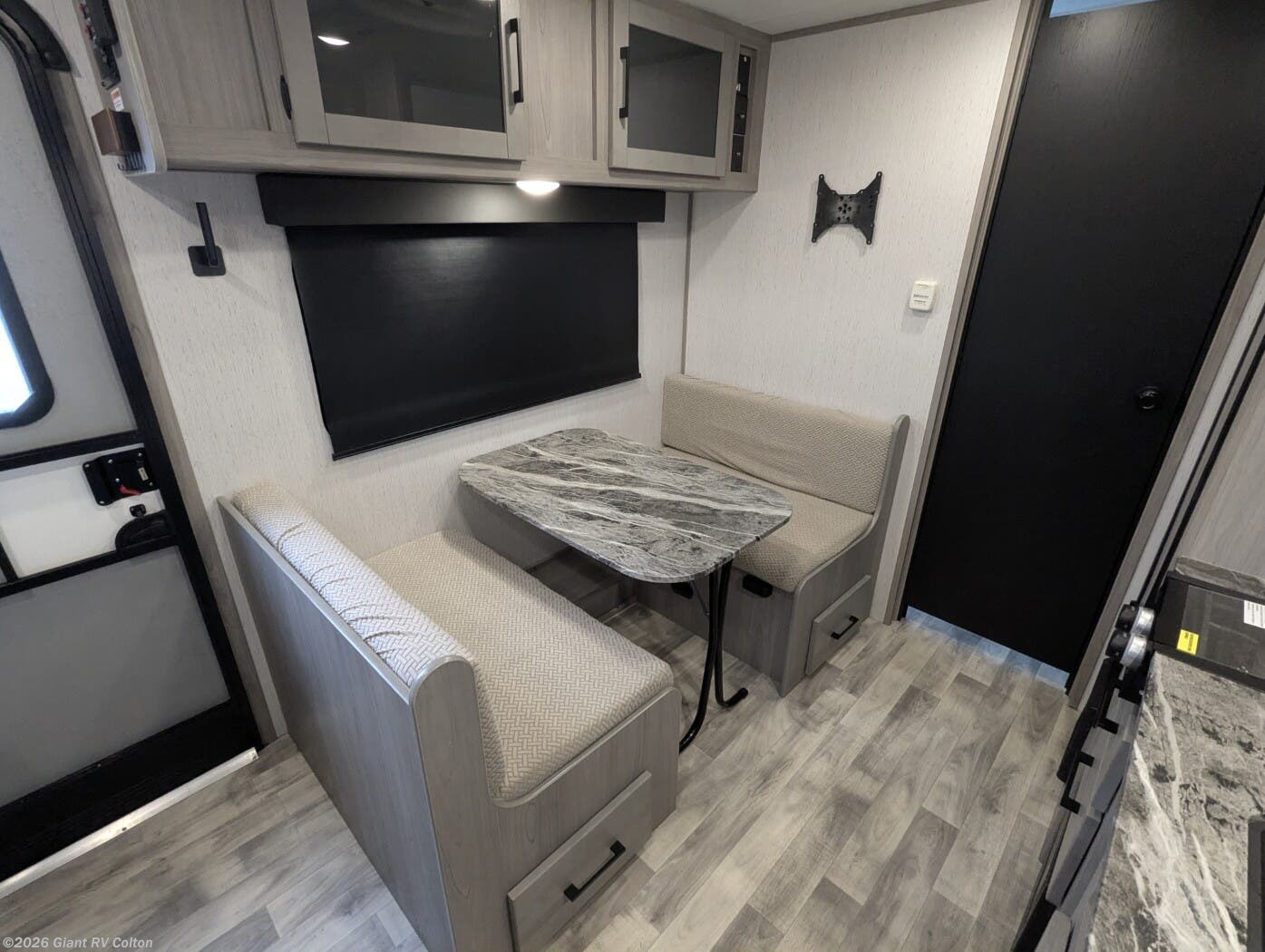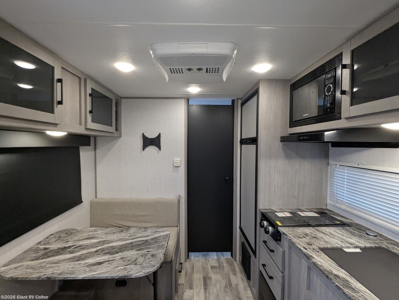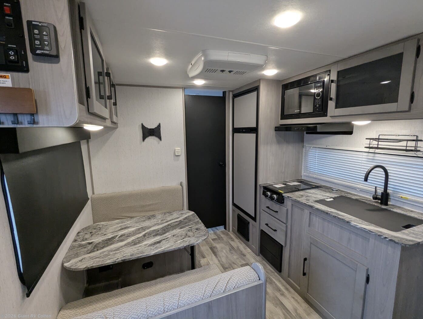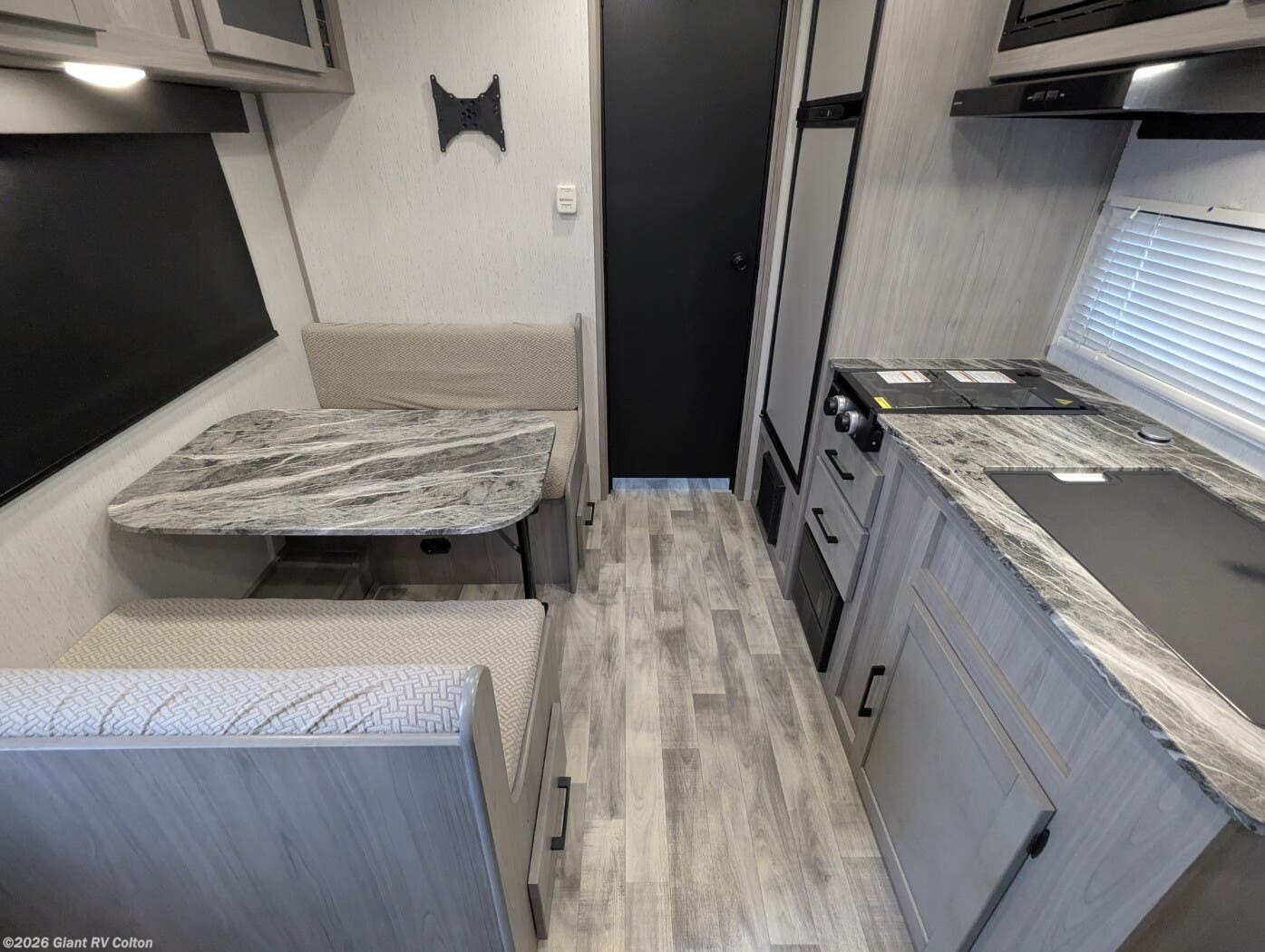 - Open Kitchen & Dinette Area with a cooktop, microwave, refrigerator, solid cabinetry, and a booth dinette that converts to extra sleeping space.