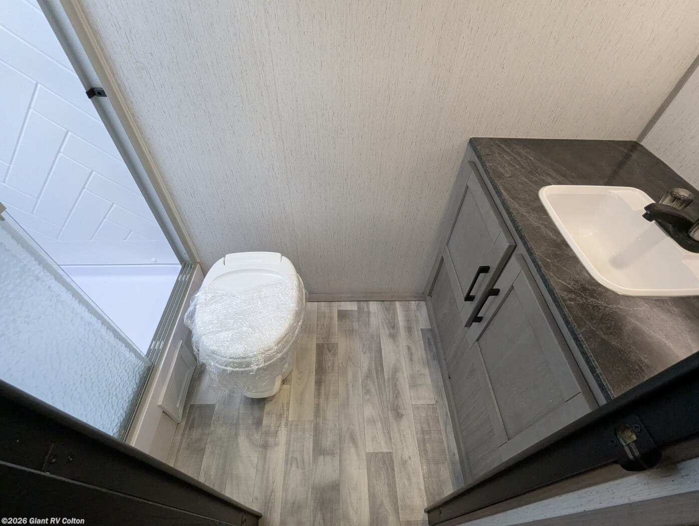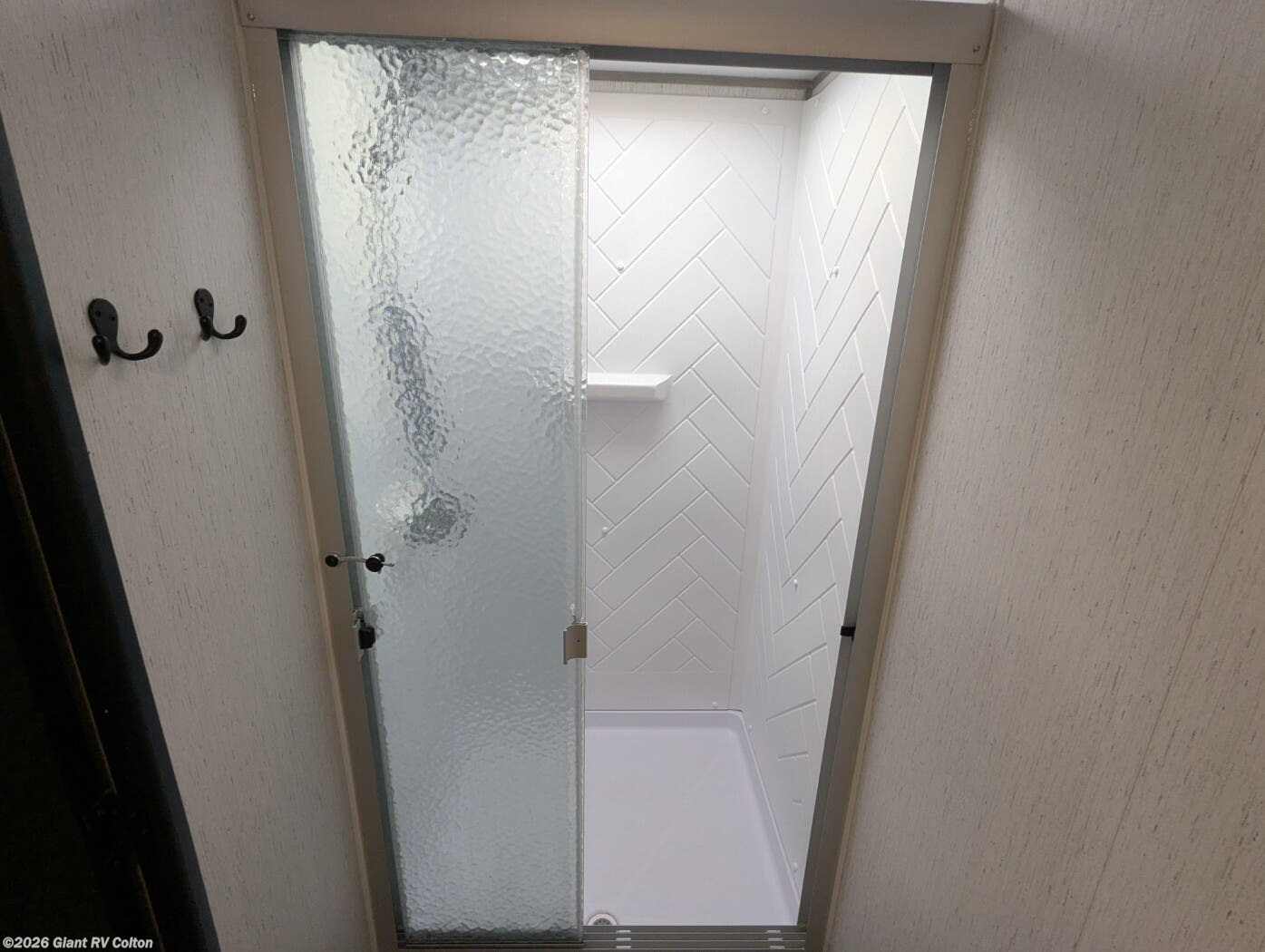 - Spacious Rear Bathroom featuring a full shower, toilet, vanity, and linen storage—offering more room than typically found in a trailer this size.