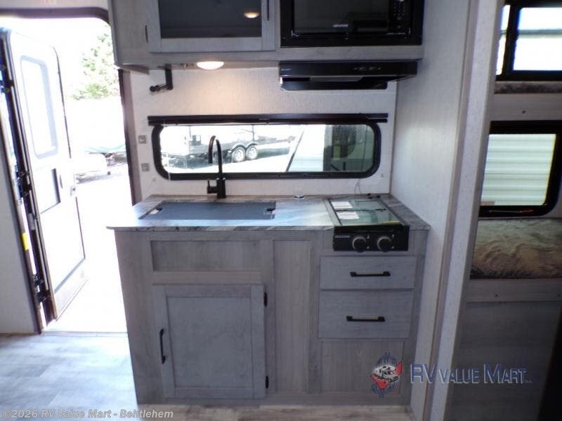 You can go camping with the whole gang in this travel trailer! The kiddos or guests can sleep on the set of bunk beds and you can sleep on the front queen bed which has USB ports to charge your electronics. Start each morning with a full belly after frying up some bacon and eggs on the two burner range with glass cover and enjoy them at the booth dinette with an indoor/outdoor table slide. You could even prepare your meals at the outdoor kitchen and breathe in some fresh air while you cook. There is also a rear corner bathroom for everyone to freshen up in with a skylight above the shower!