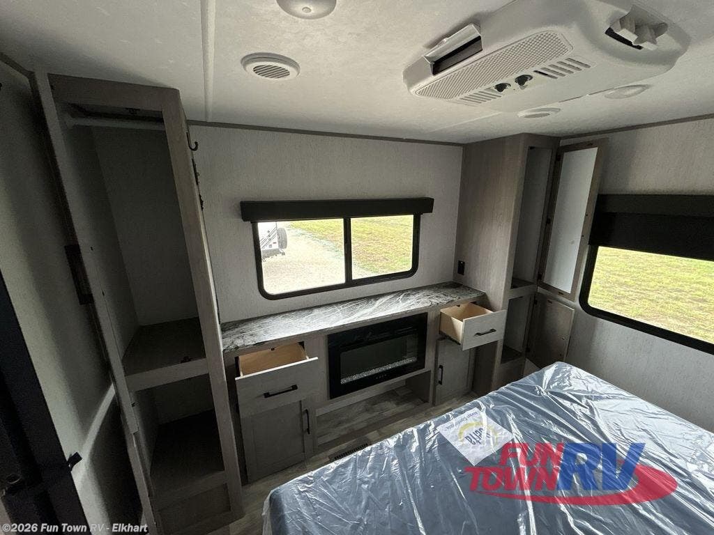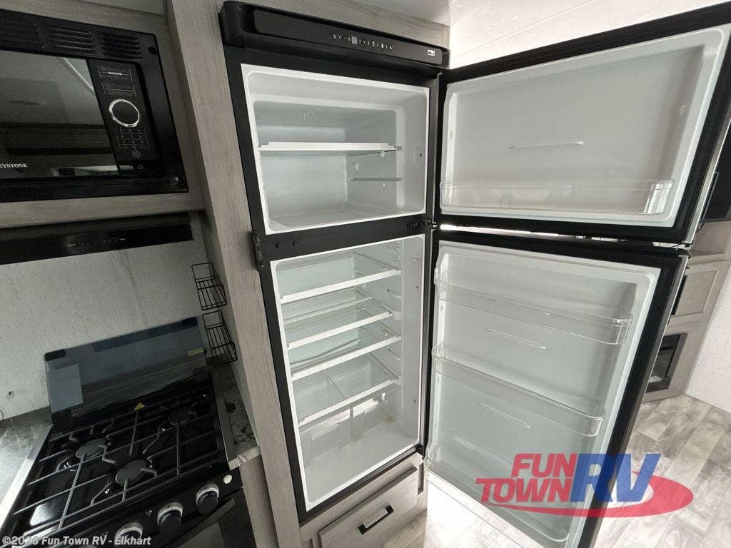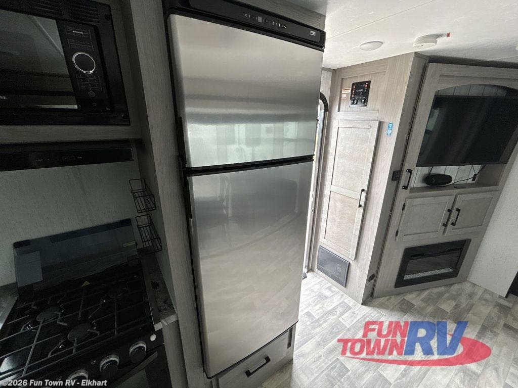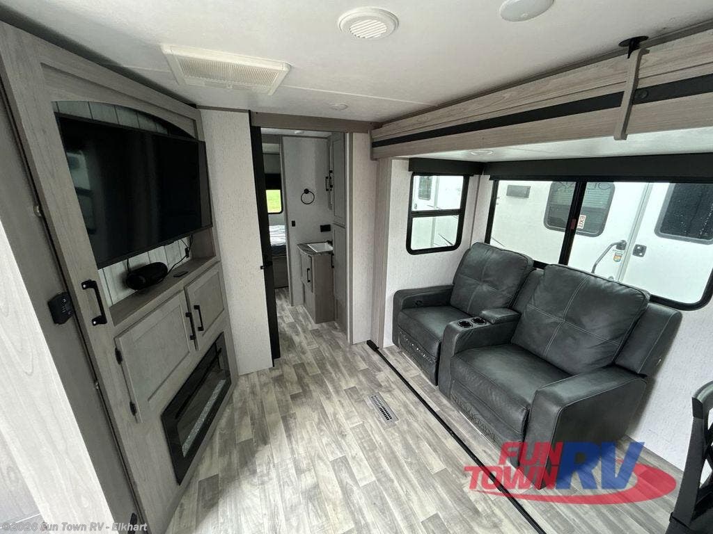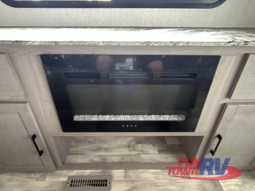 You will love every minute spent in this spacious travel trailer that includes dual slide outs! The walk through bath will create a rear master bedroom you are sure to love. You can sleep soundly on the king bed and relax in front of the bedroom fireplace. The chef of your group will have ample counter space in the kitchen to prep meals, plus there is a 10 cu. ft. refrigerator to store perishables. After dinner, get comfortable on the theater seats or play a game at the booth dinette. Or you may just want to relax outdoors under the 20' power awning with LED lights!