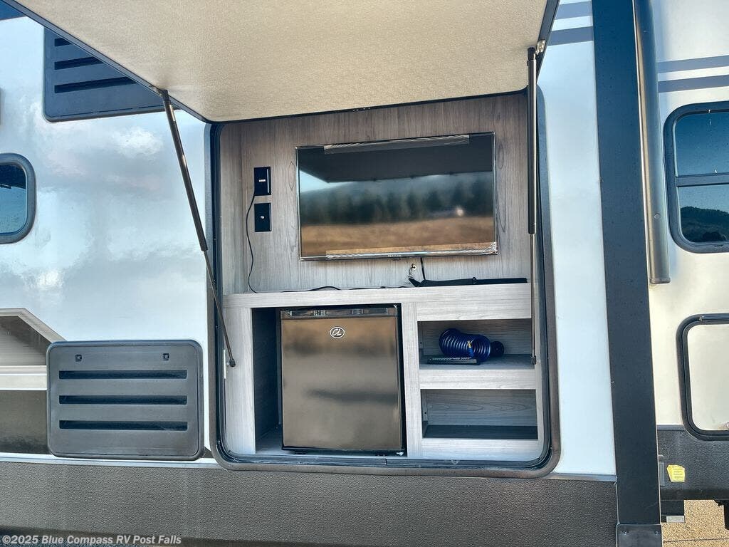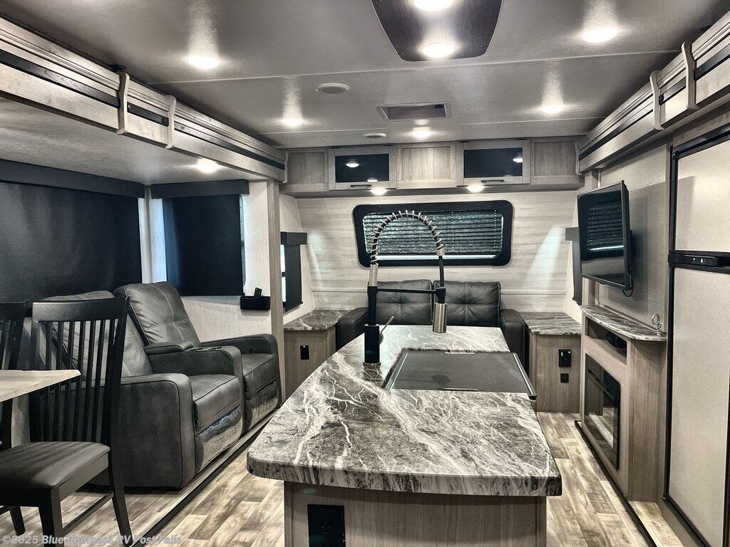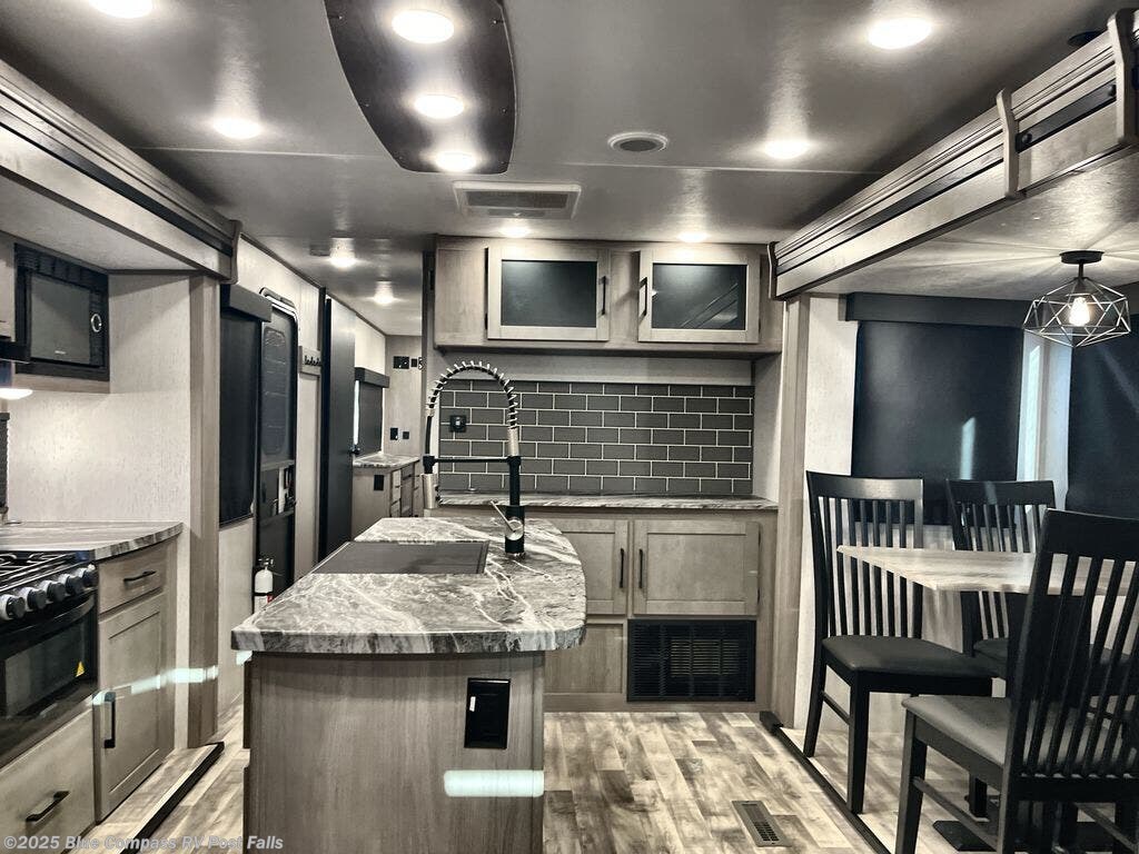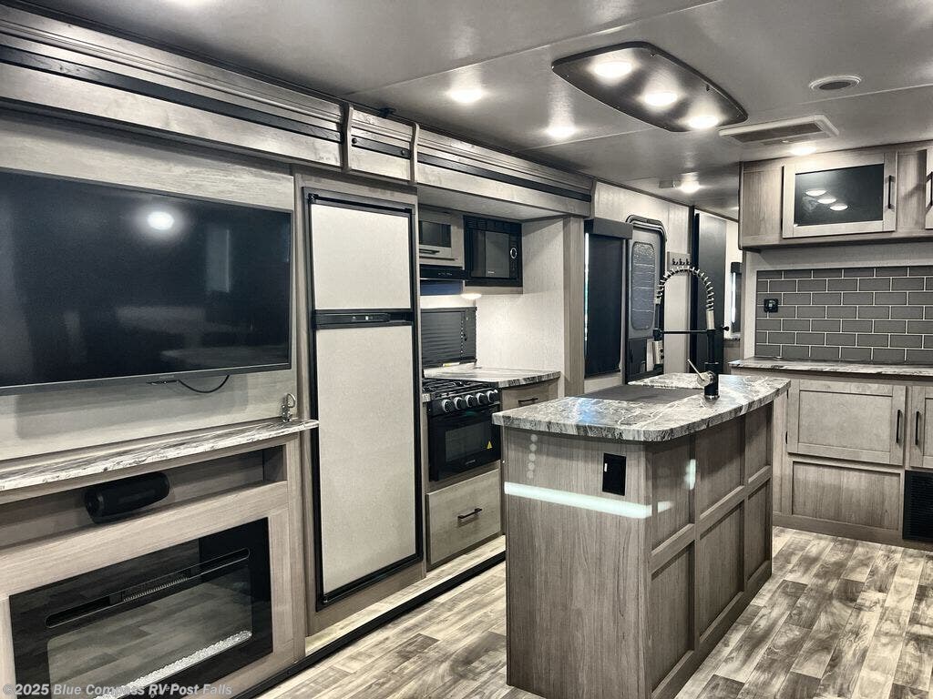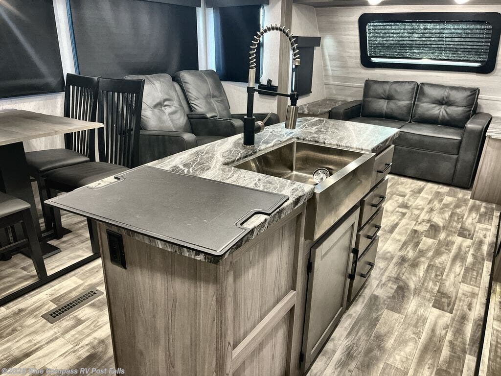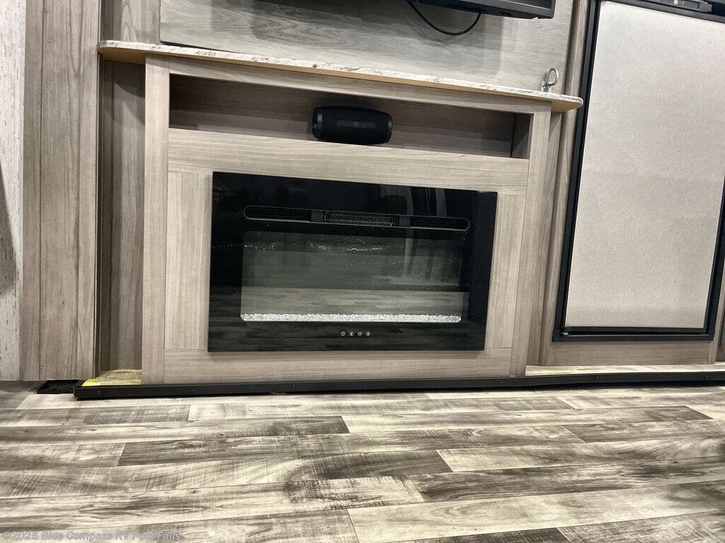 Enjoy ultimate family vacations or trips with friends in this spacious travel trailer. The dual opposing slides in the front living area open up the whole unit for a more at-home feel, and you'll find plenty of seating spaces on the theater seats, booth dinette, and sofa. The chef of the family will appreciate the extra counter space provided by the kitchen island, plus there is an extra counter with cabinets above and below for dishes and food. There is an outside kitchen that will come in handy if you like to cook breakfast outdoors, and the power awning with LED lights will provide your crew with shade as they wait for the food to be done. You and your spouse will love retreating to the rear private bedroom for bed each night. Here, the slide out king bed will provide a great night's rest, plus you will have your own fireplace and storage to hang your clothes!