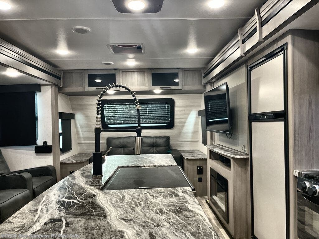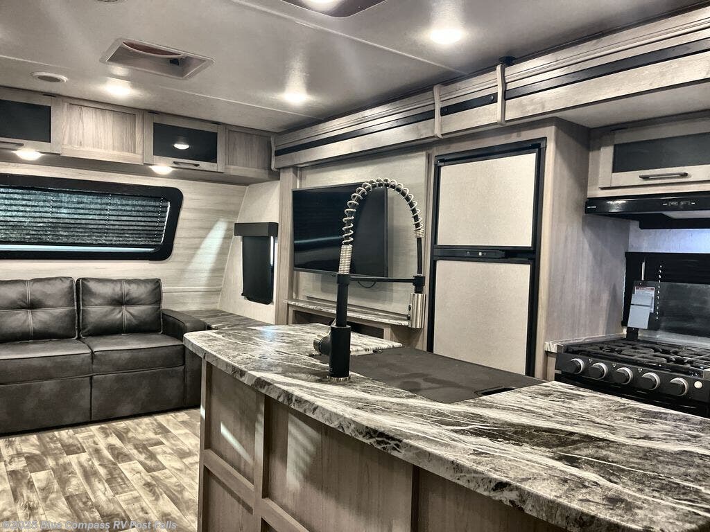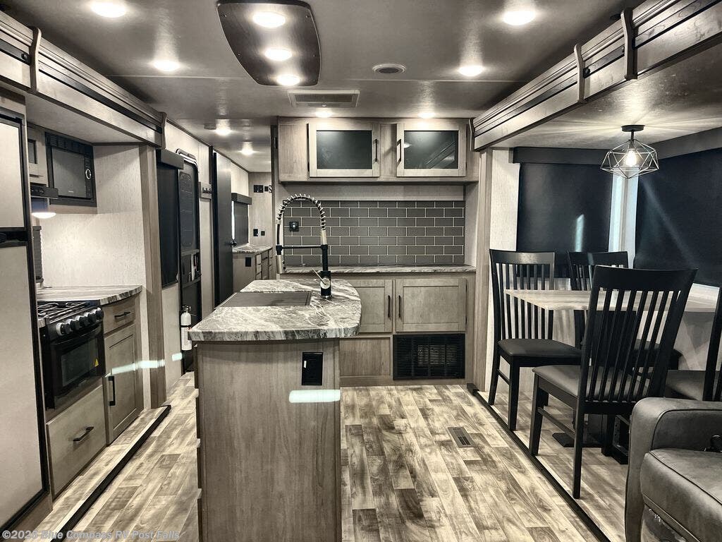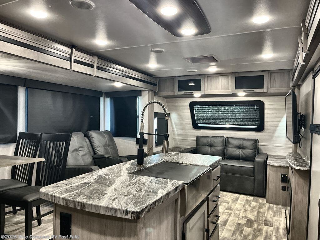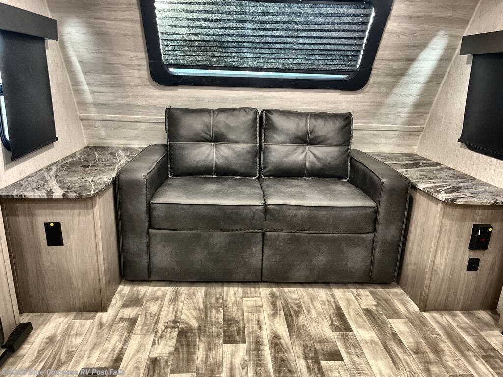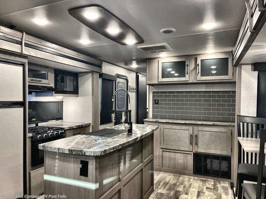 Enjoy ultimate family vacations or trips with friends in this spacious travel trailer. The dual opposing slides in the front living area open up the whole unit for a more at-home feel, and you'll find plenty of seating spaces on the theater seats, booth dinette, and sofa. The chef of the family will appreciate the extra counter space provided by the kitchen island, plus there is an extra counter with cabinets above and below for dishes and food. There is an outside kitchen that will come in handy if you like to cook breakfast outdoors, and the power awning with LED lights will provide your crew with shade as they wait for the food to be done. You and your spouse will love retreating to the rear private bedroom for bed each night. Here, the slide out king bed will provide a great night's rest, plus you will have your own fireplace and storage to hang your clothes!