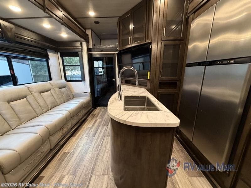 With any Voltage Triton toy hauler fifth wheel by Dutchmen you will appreciate the economical price point while still including many luxury features. The 7' slide boxes provide you with space to stretch out, plus there are oversized windows to let the sun through each morning. Some of the other interior comforts you are sure to love are the pleated night shades throughout the entire coach, the stainless steel kitchen sink, the upgraded heat and massage sofas, and more. Each model includes a 30" residential microwave, a 12 gallon water heater, plus two upgraded A/C's to keep you cool all summer long. The Triton garage is ready to house your favorite toys with 2,500 lb. tie-downs and a Tuff Ply floor, and you can add the optional ramp door patio system for more fun. You will also enjoy the two indoor/outdoor speakers, plus a pull down screen to keep the bugs out when you want to dine at the table.