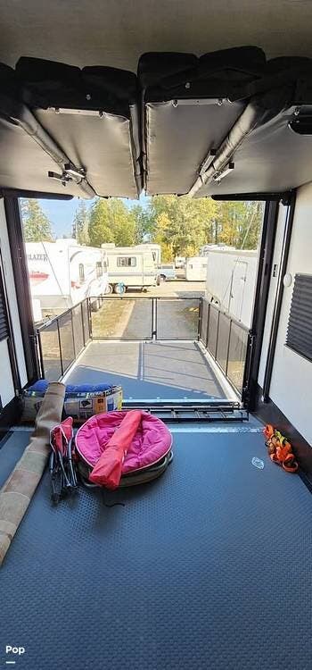 This 2022 Voltage Dutchmen 3551 is a 39-foot, one-owner toy hauler with three slides and an 11-foot garage. It sleeps seven with a king bed, sofa sleepers, and bunk beds.