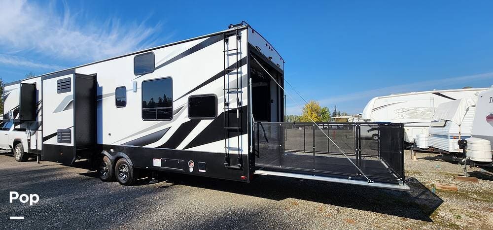 A 2022 Dutchmen Voltage Triton 3551 Toy Hauler in Good Condition w/ Washer and Dryer!