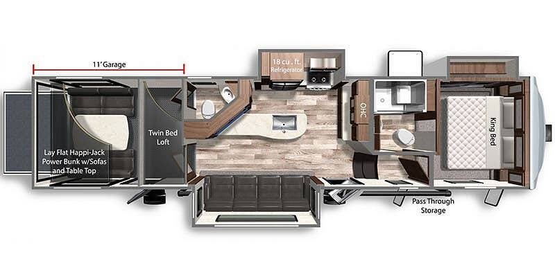 This 2022 Voltage Dutchmen 3551 is a 39-foot, one-owner toy hauler with three slides and an 11-foot garage. It sleeps seven with a king bed, sofa sleepers, and bunk beds.