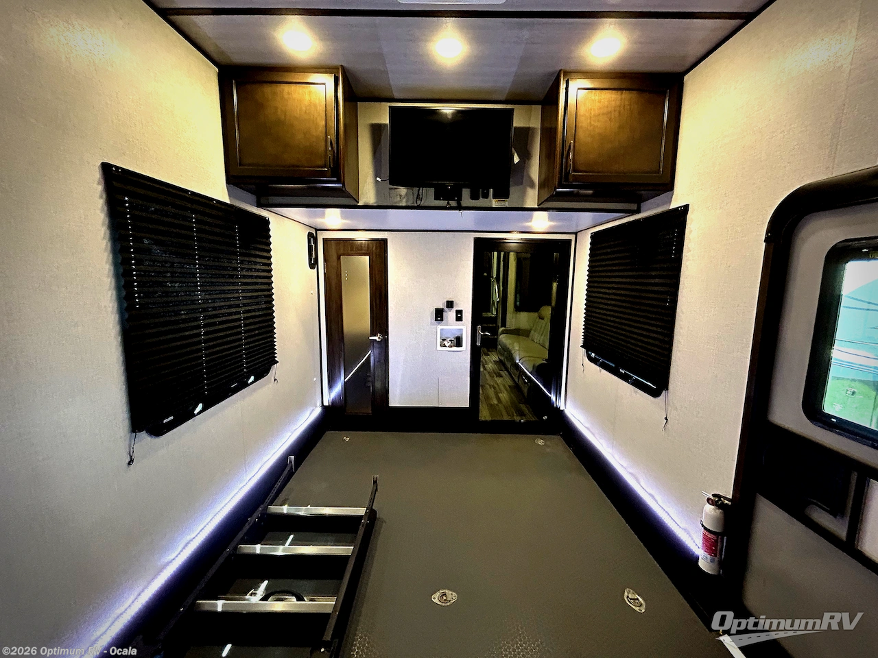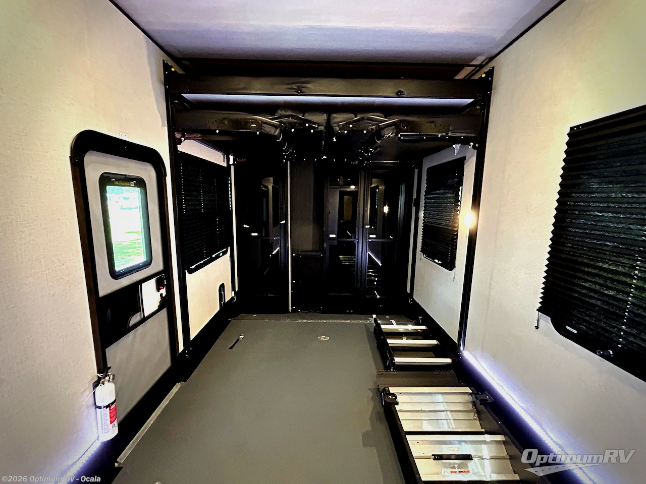 You are going to want to see this Voltage toy hauler! It offers you two entry doors that you can use to get to the main living area or the garage. Once you're inside, you'll be met with a luxurious interior filled with an 18-cubic foot refrigerator, a 50" LCD HDTV, a garage TV, a king-size bed, and USB charging stations. The full dual-entry bathroom has an entrance from the main hallway and the front bedroom, and the half bathroom is included in the garage. The garage also features a Happi-Jack power bunk with sofas and table top below, and it has a loft bed.