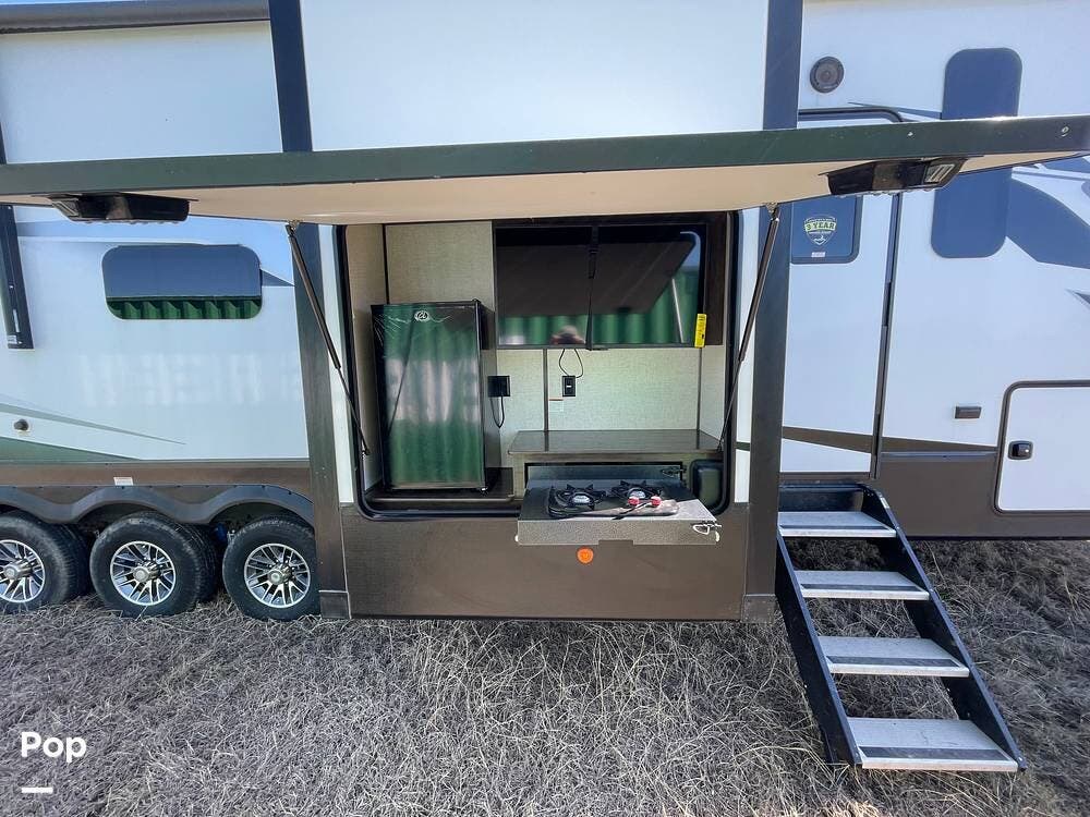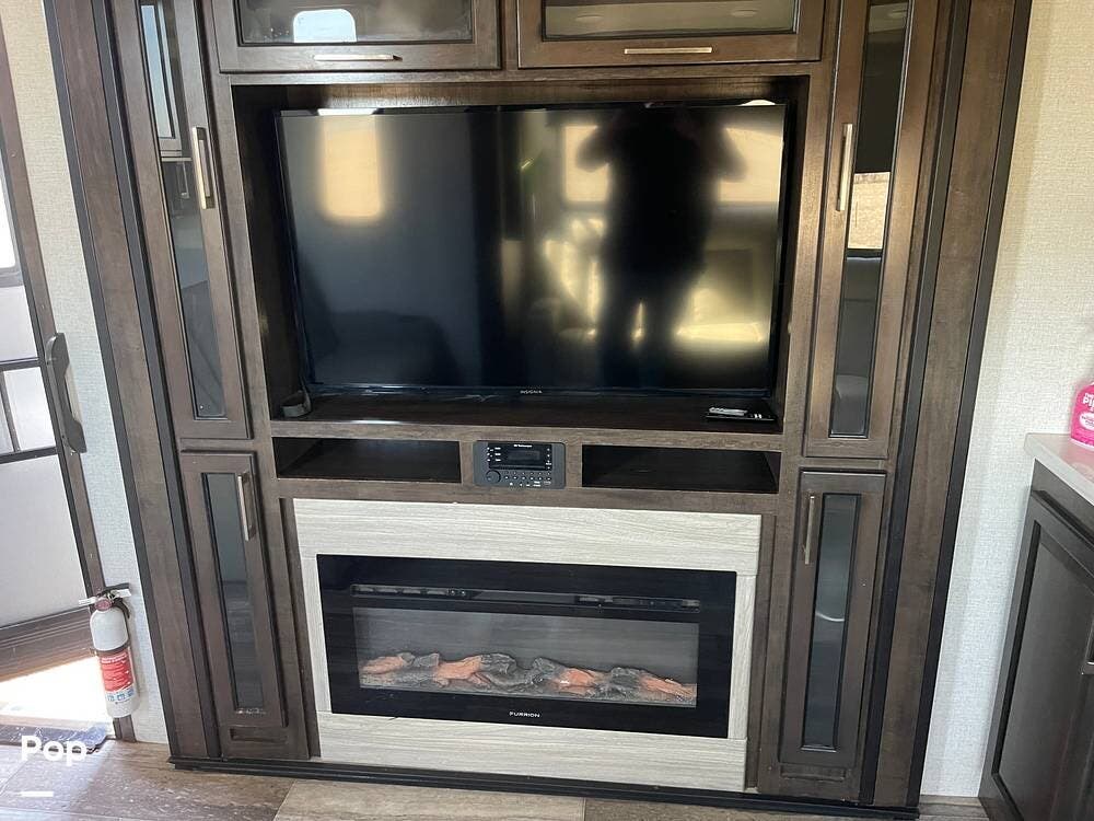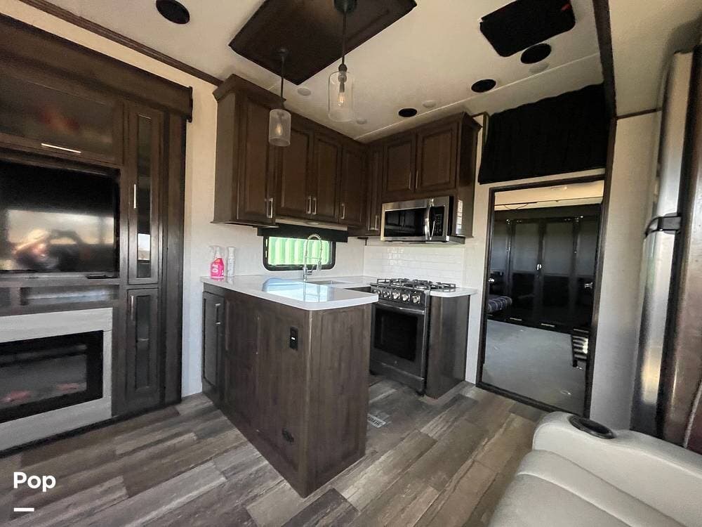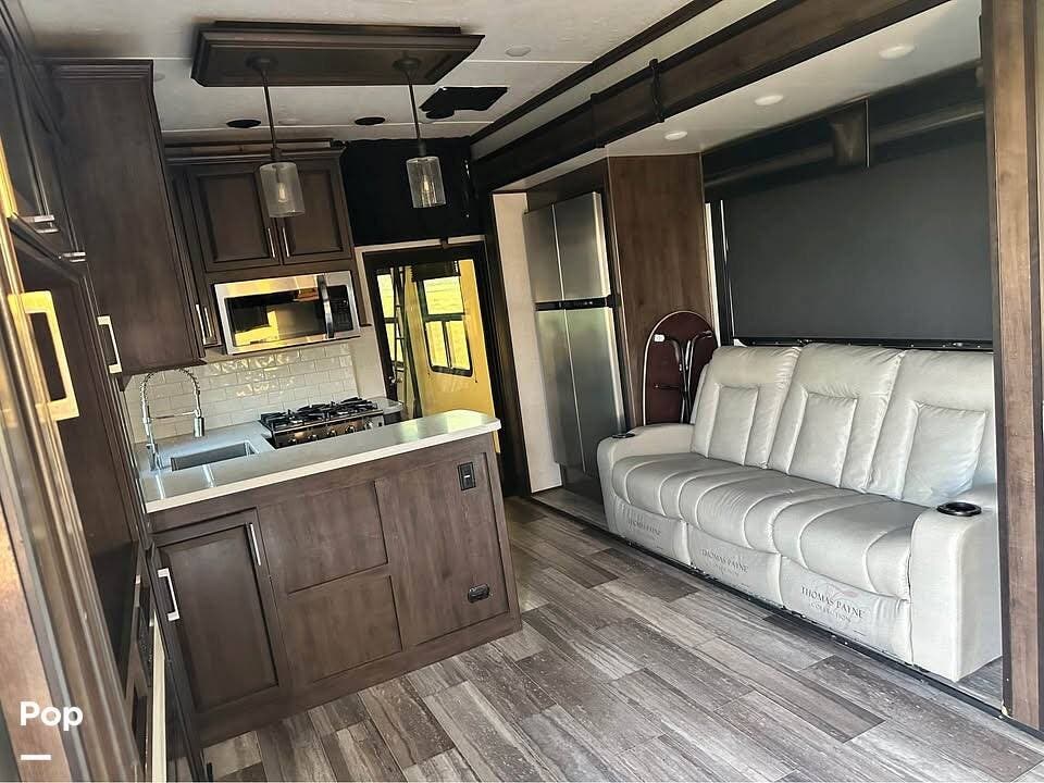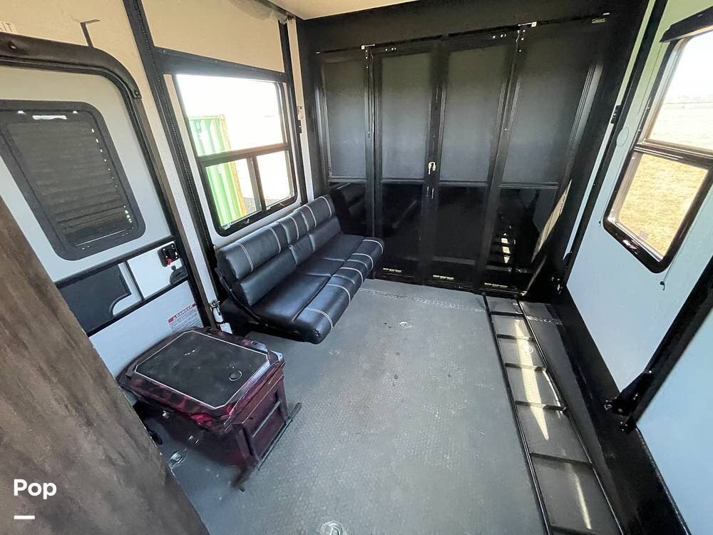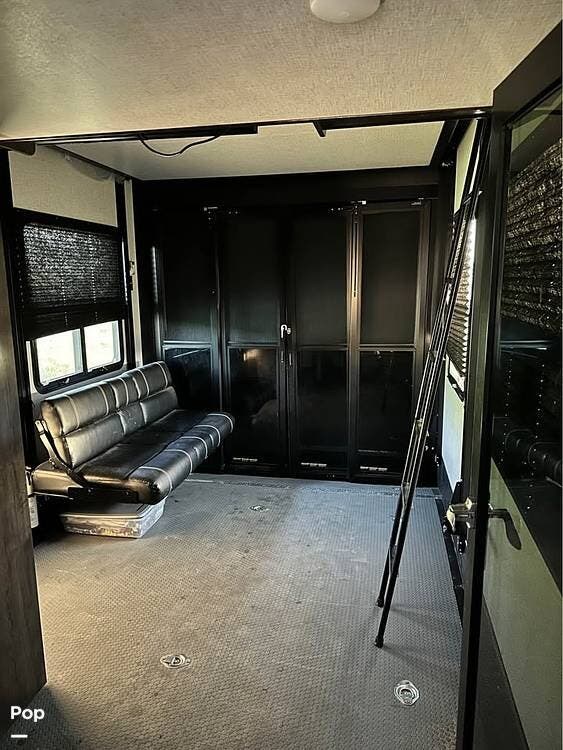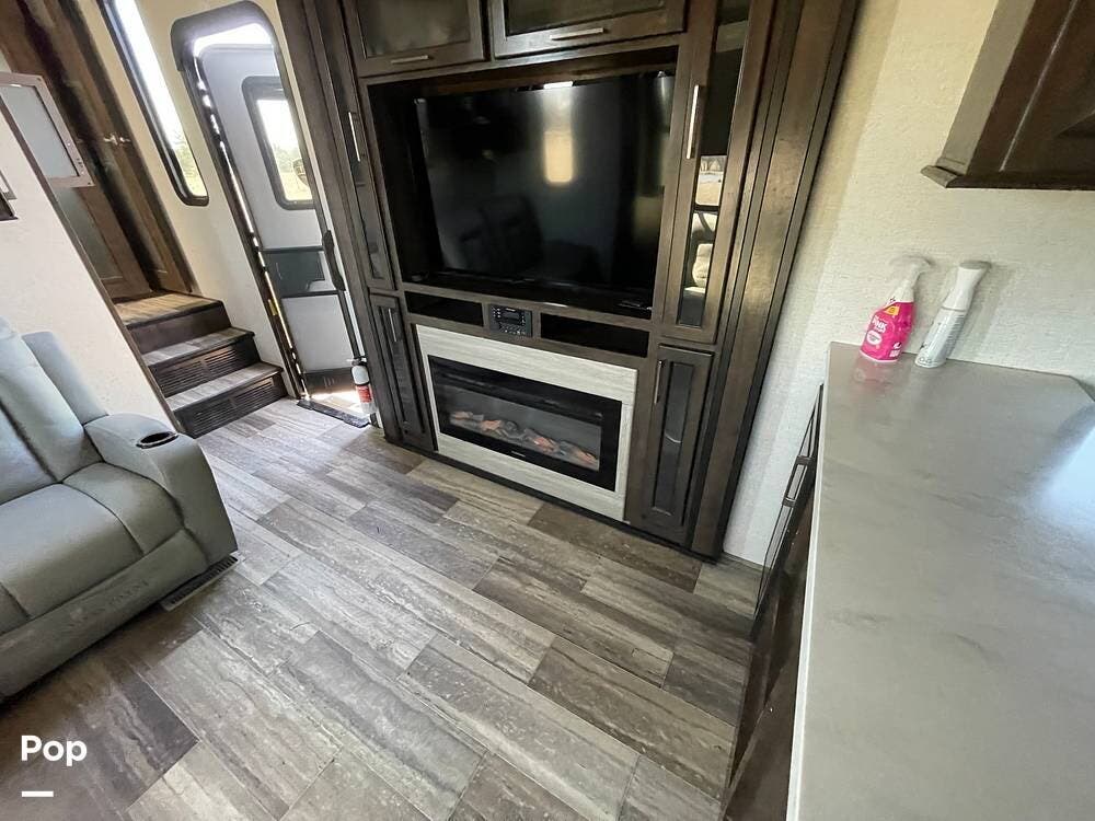 This unit sleeps and is extremely versatile with quality components and style. It was the 2022 Toy Hauler of the Year for a reason. It has reclining stadium-style recliners and a sofa with a huge flat screen and an electric fireplace beneath. There are two more TVs, one in the 13 ft cargo area, and one in the exterior kitchen,