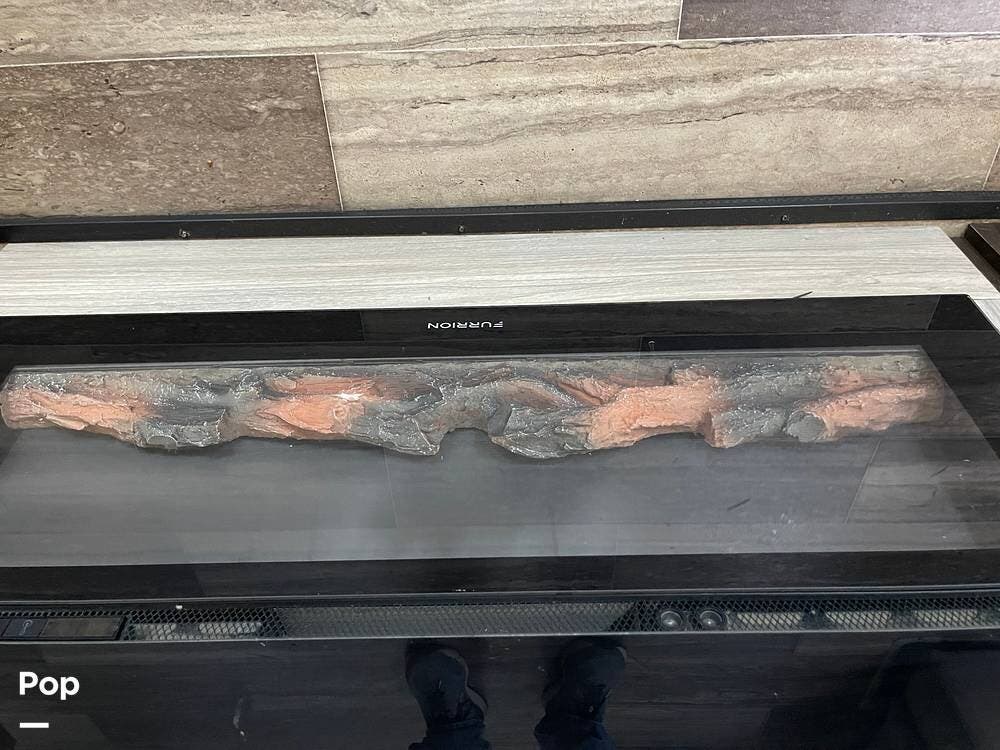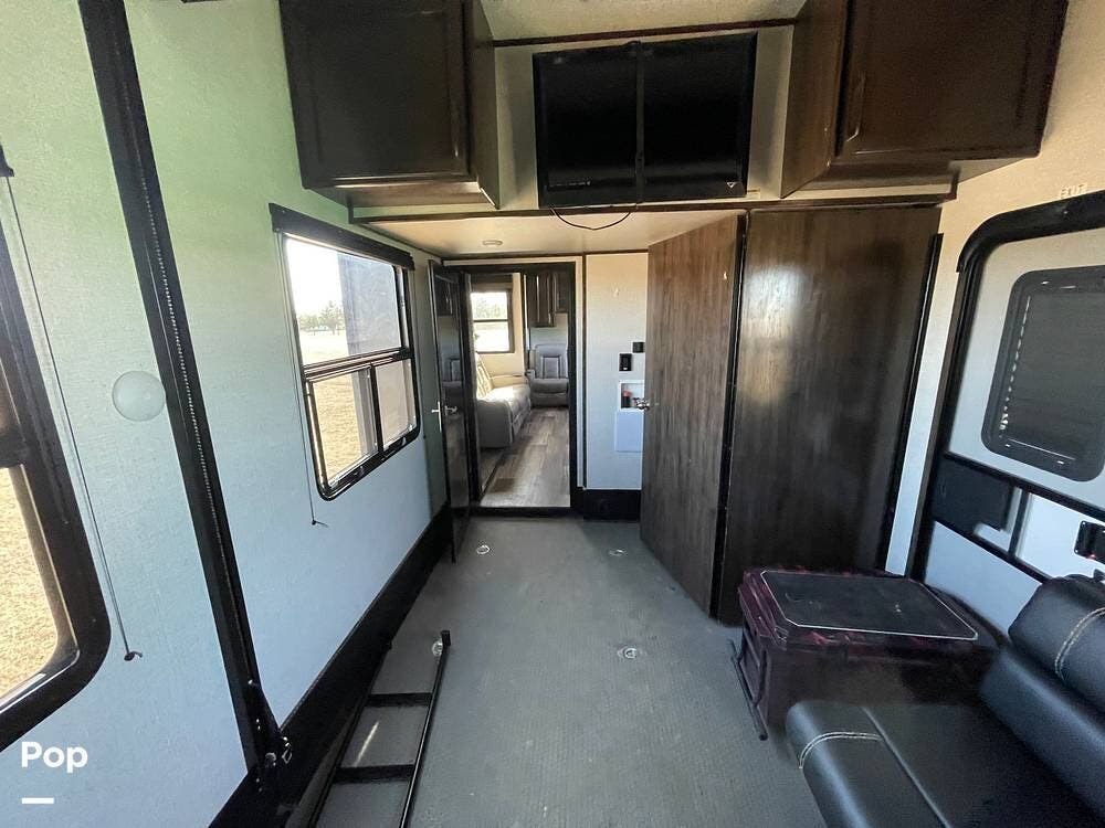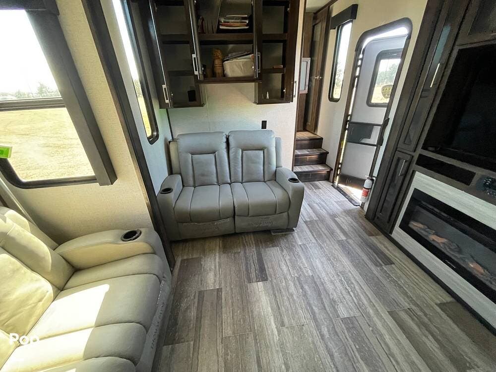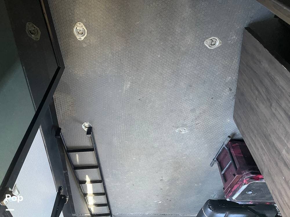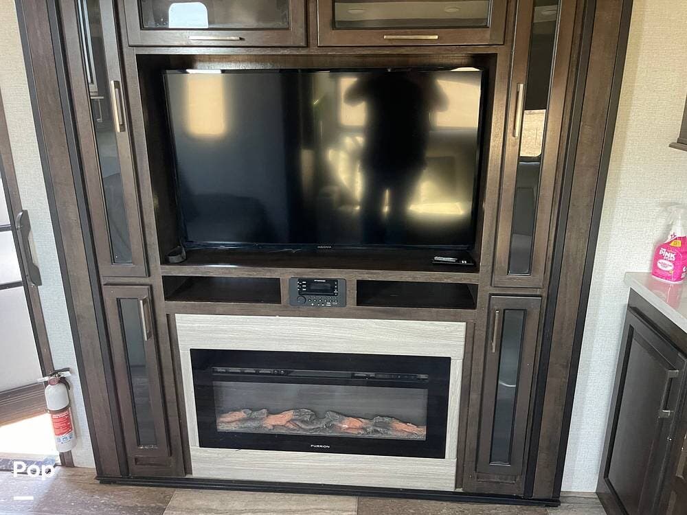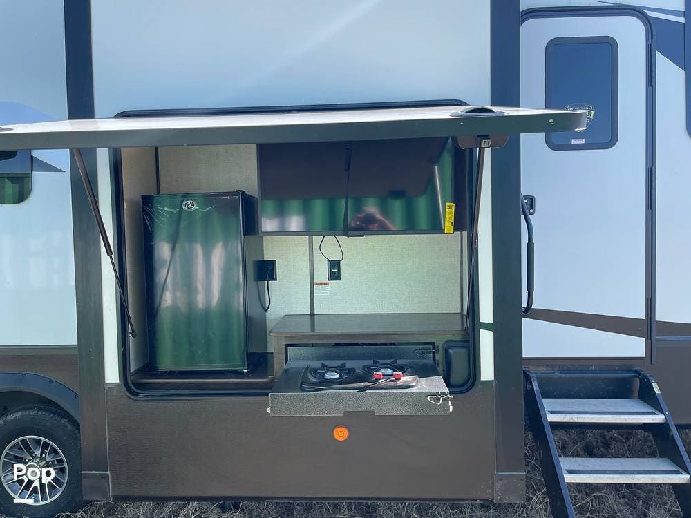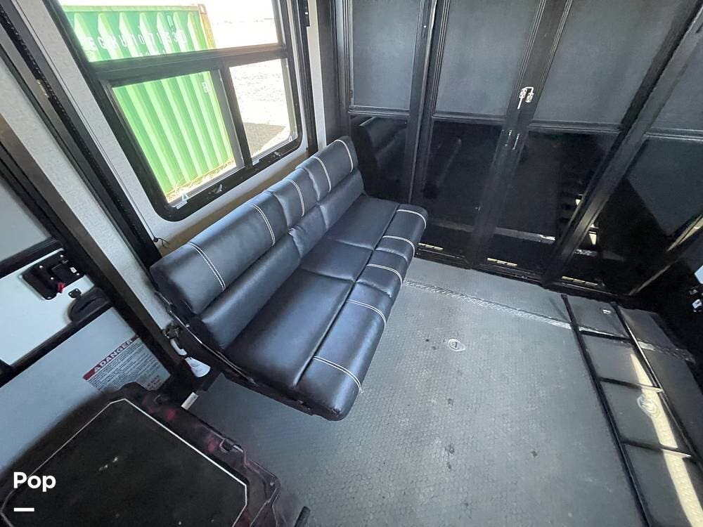 This unit sleeps and is extremely versatile with quality components and style. It was the 2022 Toy Hauler of the Year for a reason. It has reclining stadium-style recliners and a sofa with a huge flat screen and an electric fireplace beneath. There are two more TVs, one in the 13 ft cargo area, and one in the exterior kitchen,