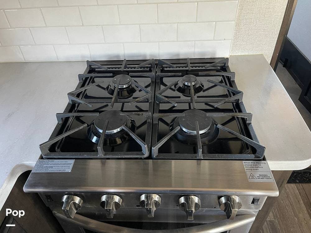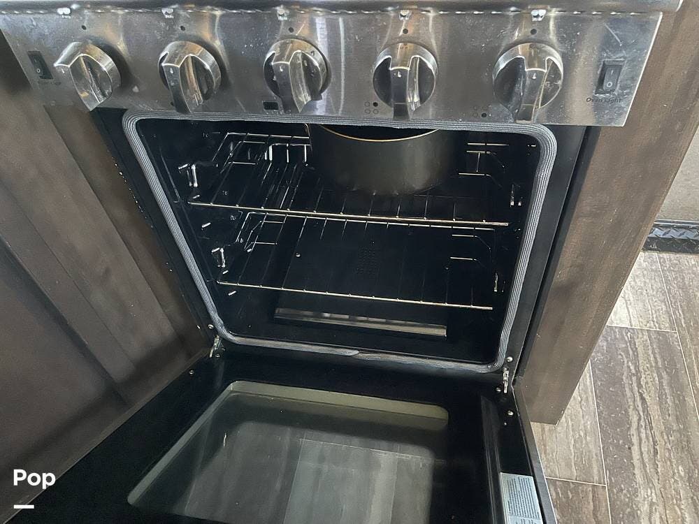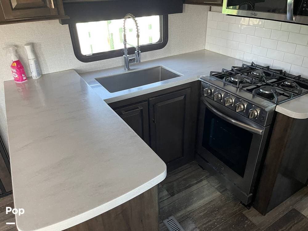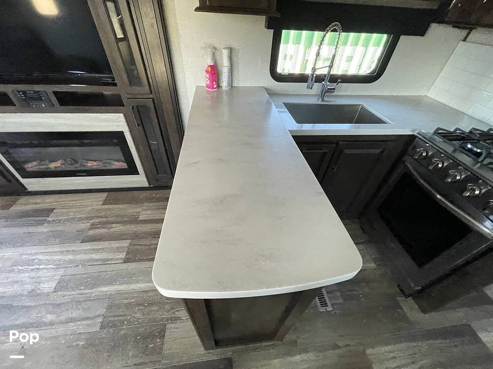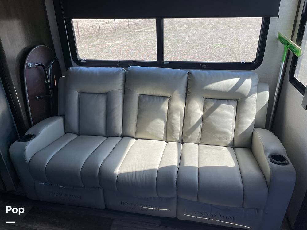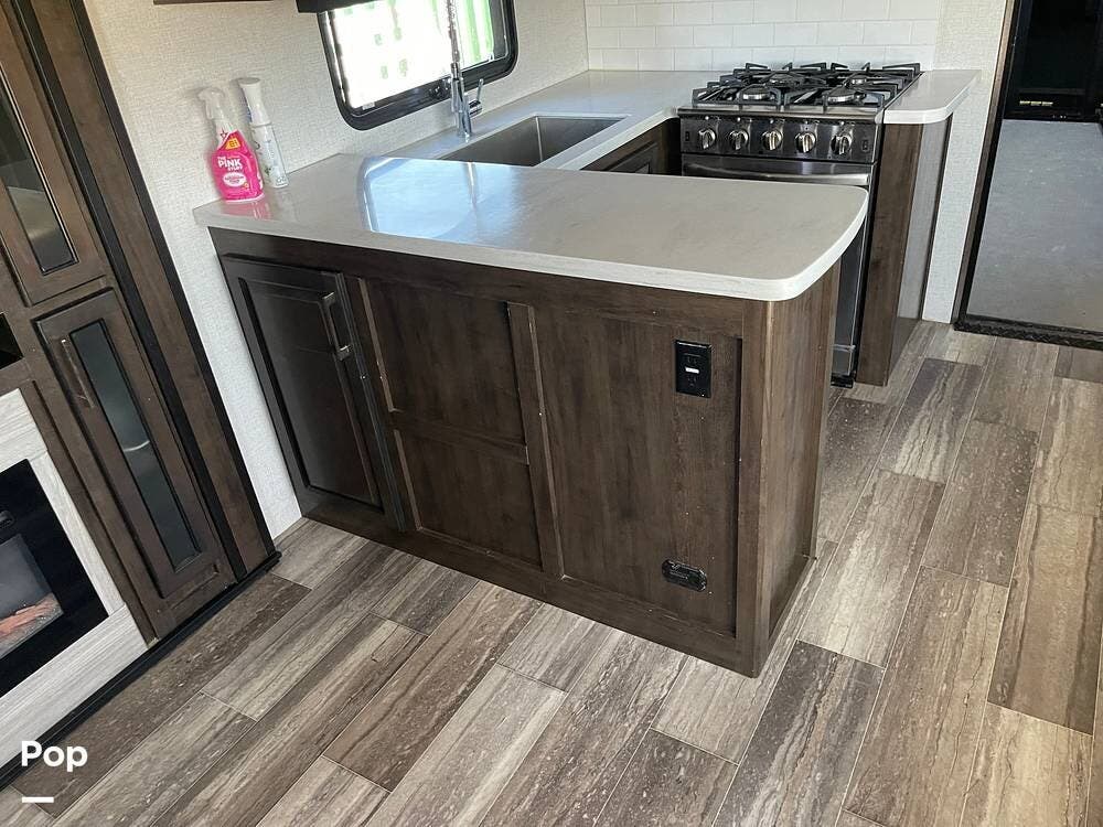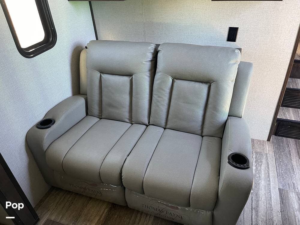 This unit sleeps and is extremely versatile with quality components and style. It was the 2022 Toy Hauler of the Year for a reason. It has reclining stadium-style recliners and a sofa with a huge flat screen and an electric fireplace beneath. There are two more TVs, one in the 13 ft cargo area, and one in the exterior kitchen,