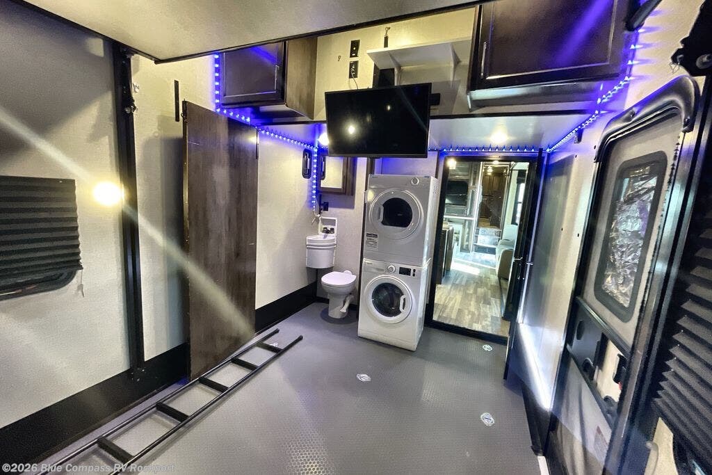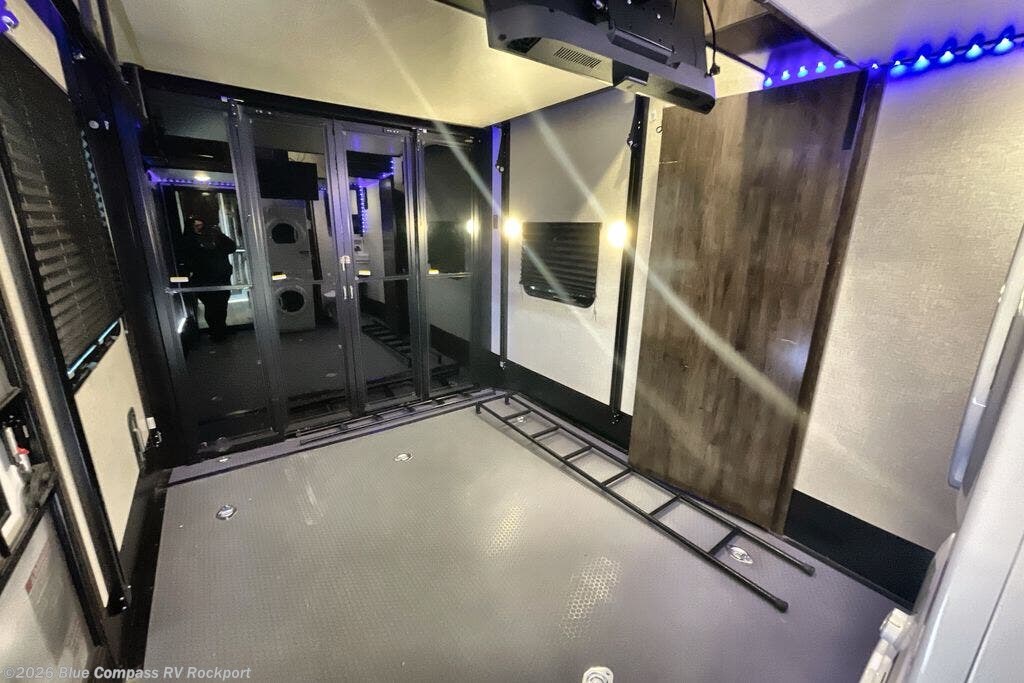 This Voltage toy hauler is going to get you pumped to start traveling! You will have your own master suite in the front which has private access to the dual-entry bathroom, and you can offer a guest suite with half bathroom, power bunk, sofas, TV, and exterior entry to your friends or family. A loft bed adds even more sleeping space, and you'll have a great relaxation area with the three sofas in the main living room. A pantry sits next to the 18-cubic foot refrigerator for food storage, and the rest of the kitchen appliances will help you prepare dinner in a flash.