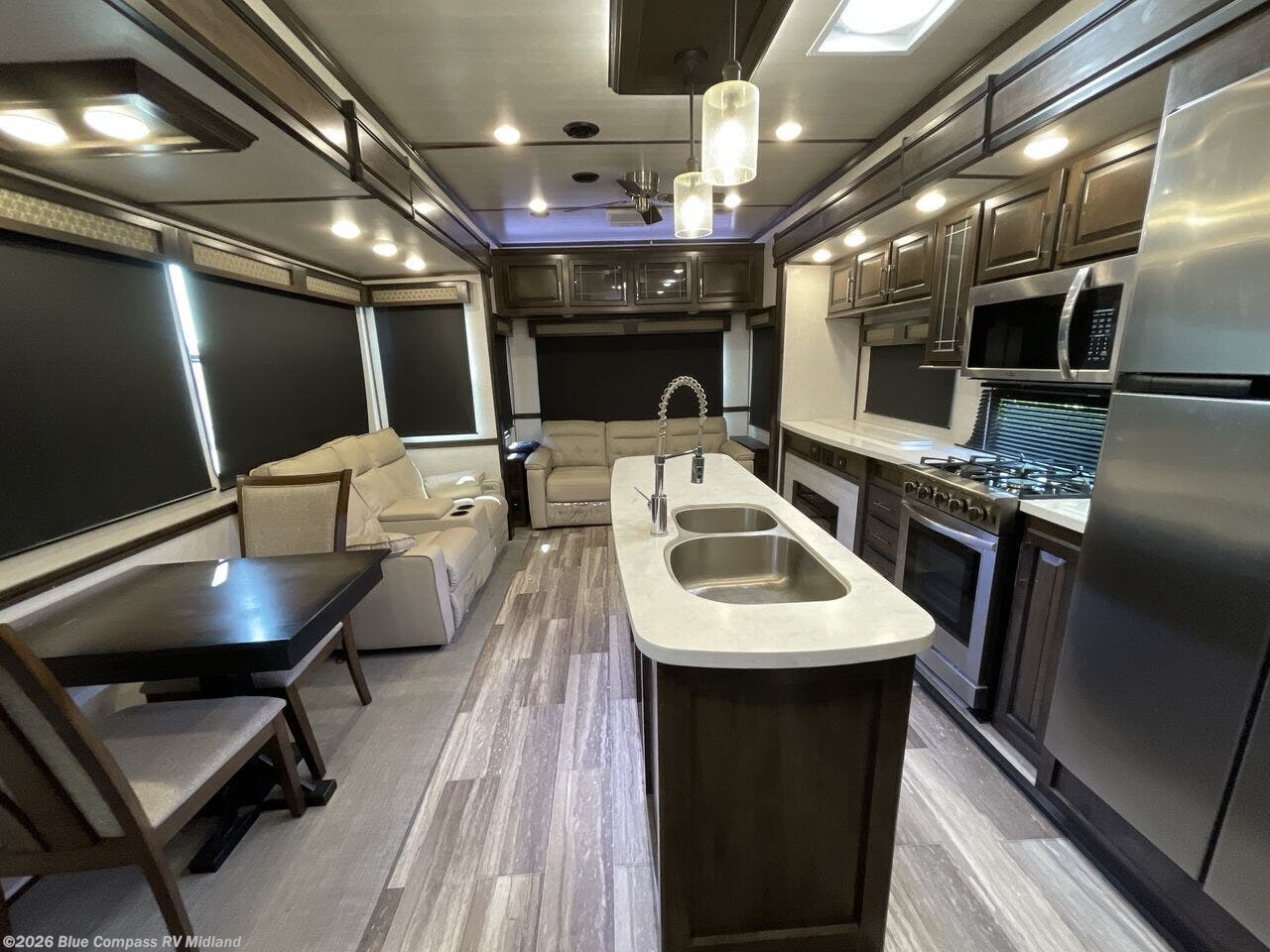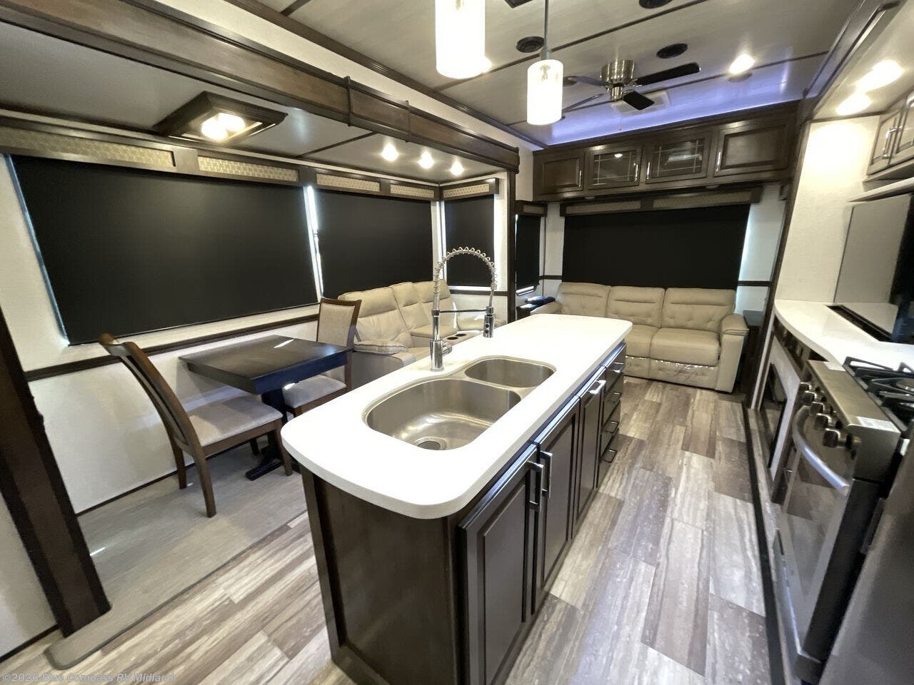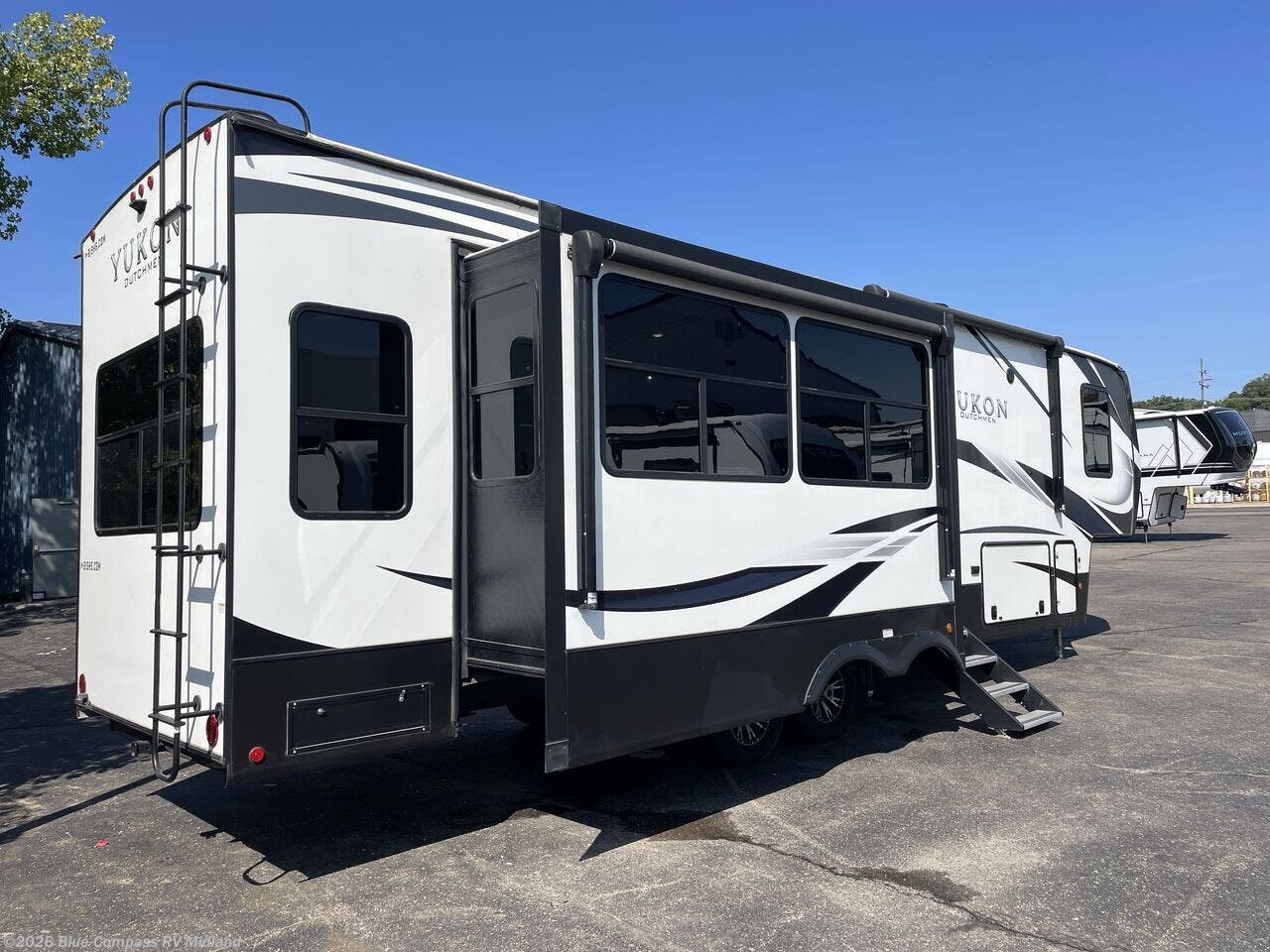 This Yukon fifth wheel takes your adventures to new heights with its excellent features! You'll find the largest oven in the industry on this unit, and the large kitchen island will make meal prep a breeze. The master suite houses a king bed slide and 50" TV, and there is another 50" TV in the main living area at the entertainment center. The free-standing dinette is a great place to sit while you eat, and the large pantry will hold your favorite snacks. Spend some time relaxing on one of the two sofas, and enjoy the added interior living space that comes from the two opposing slides.