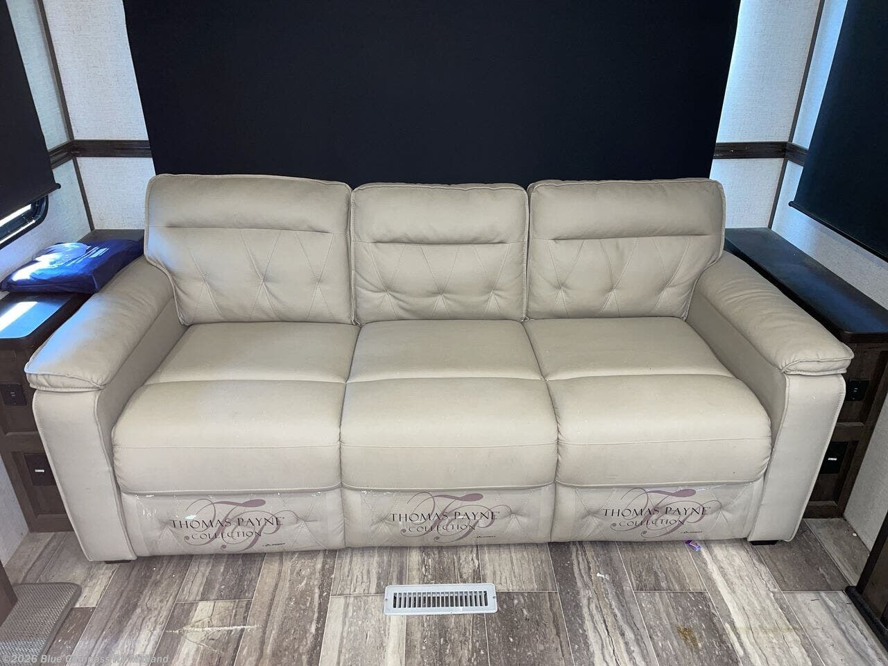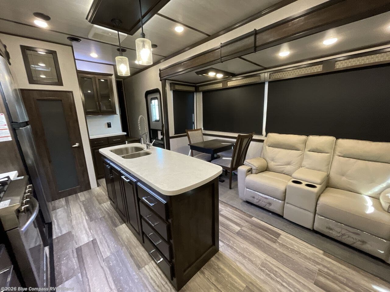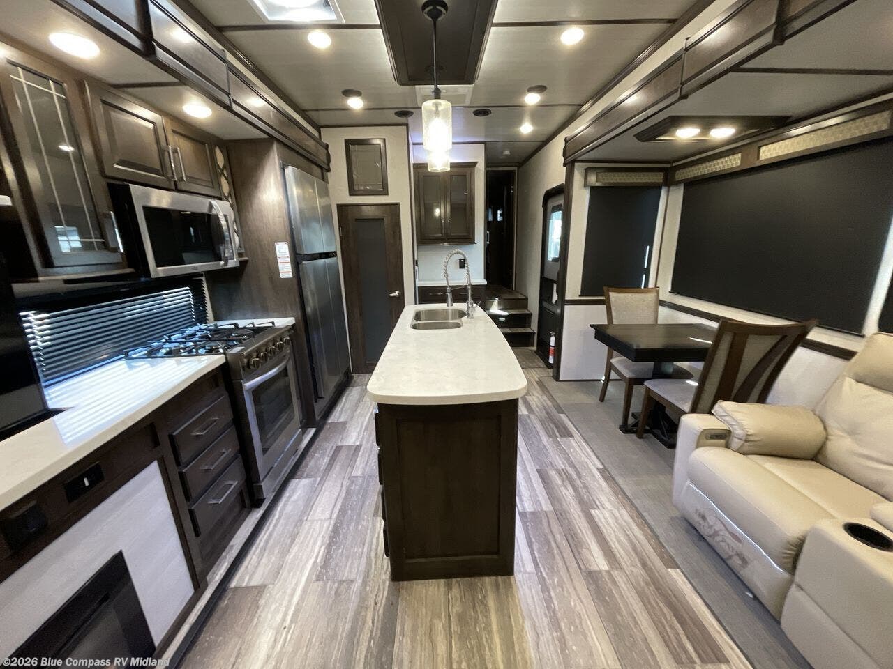 This Yukon fifth wheel takes your adventures to new heights with its excellent features! You'll find the largest oven in the industry on this unit, and the large kitchen island will make meal prep a breeze. The master suite houses a king bed slide and 50" TV, and there is another 50" TV in the main living area at the entertainment center. The free-standing dinette is a great place to sit while you eat, and the large pantry will hold your favorite snacks. Spend some time relaxing on one of the two sofas, and enjoy the added interior living space that comes from the two opposing slides.