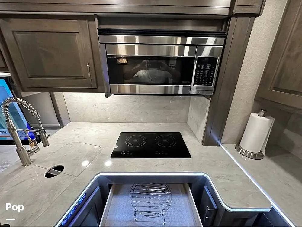 A residential refrigerator, induction cooktop, stacked washer/dryer, and convection microwave make life on the road effortlessly convenient, while dual A/Cs with heat pumps and Aqua-Hot hydronic heat keep you comfortable no matter the weather.