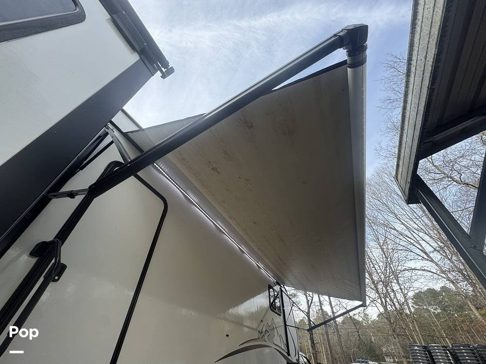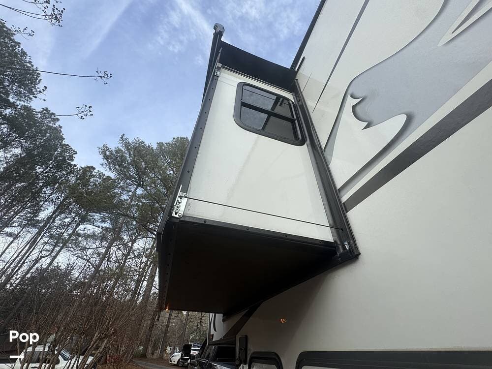Outside, dual awnings expand the living space alongside oversized pass-thru storage.