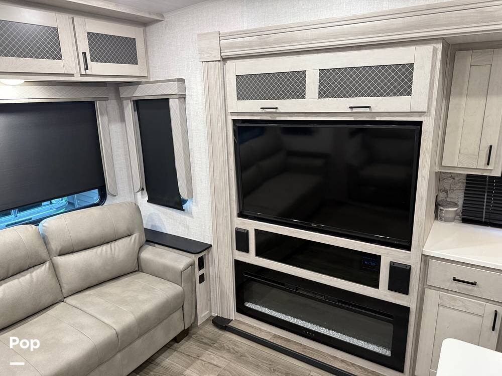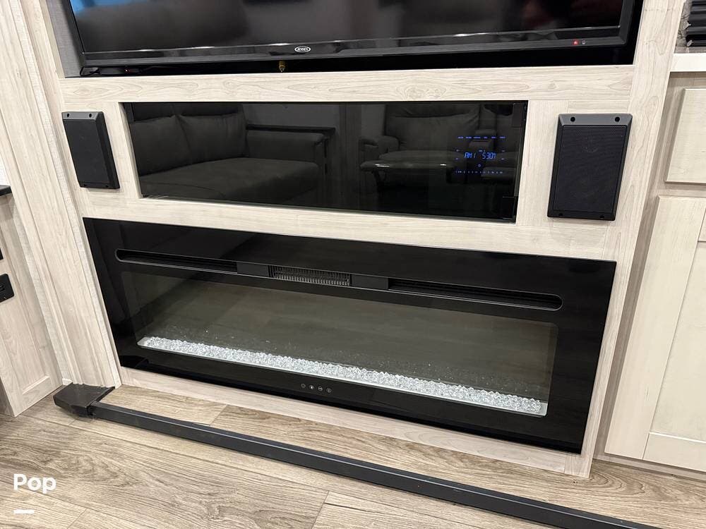 The 2022 Tandara (by East to West RV) 385MB features an inviting rear living area with a hide-a-bed sofa, theater seating, a freestanding dinette, and a TV with fireplace.