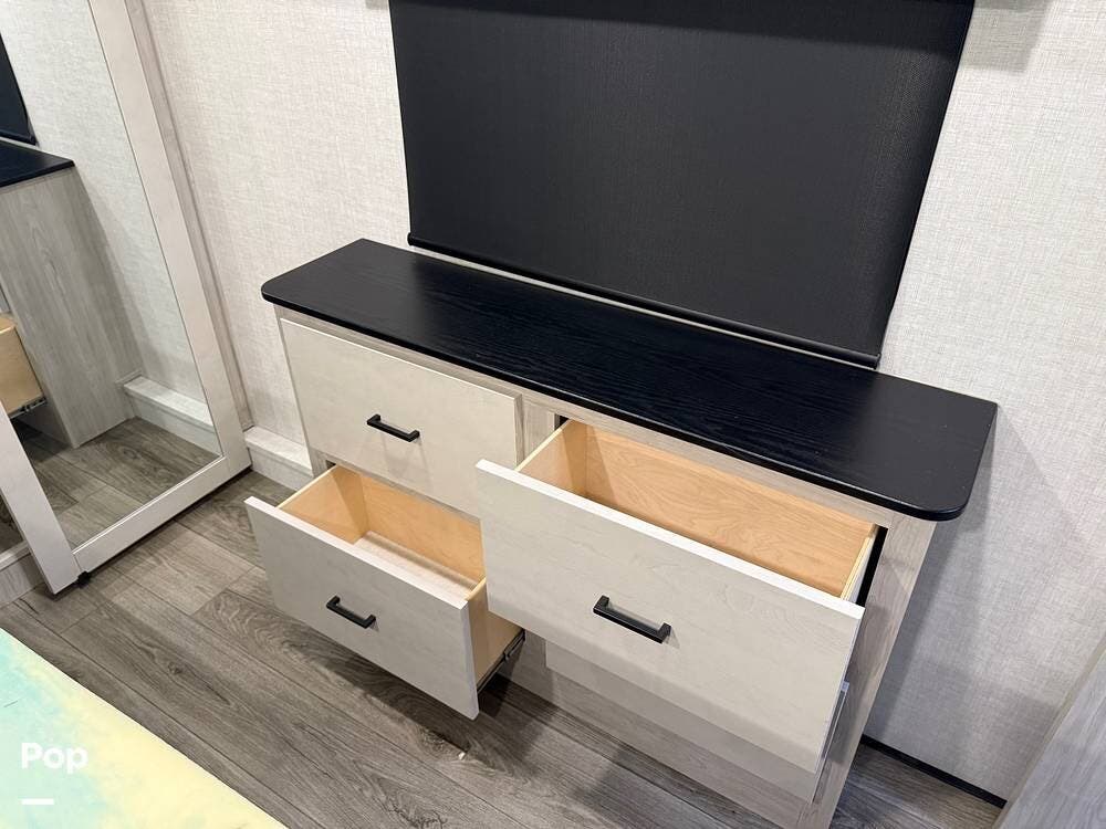 At the front, the private bedroom features a king bed with storage beneath, a dresser/TV prep, and a washer/dryer prep inside the wardrobe.