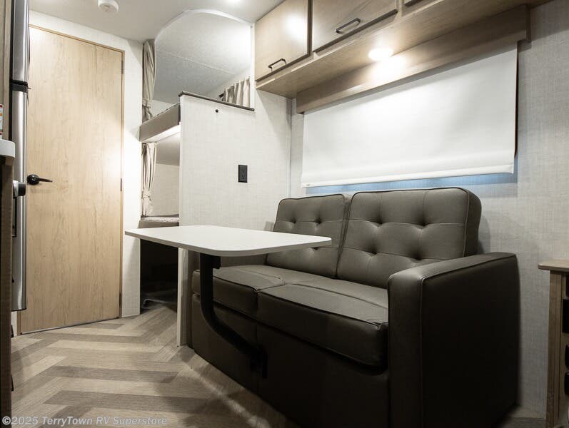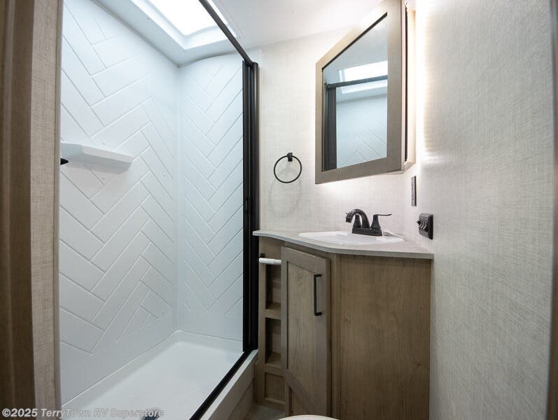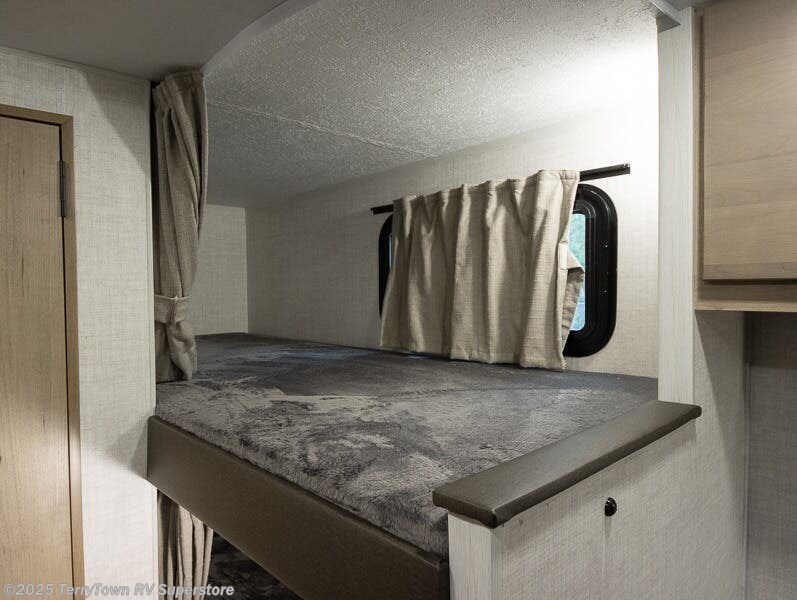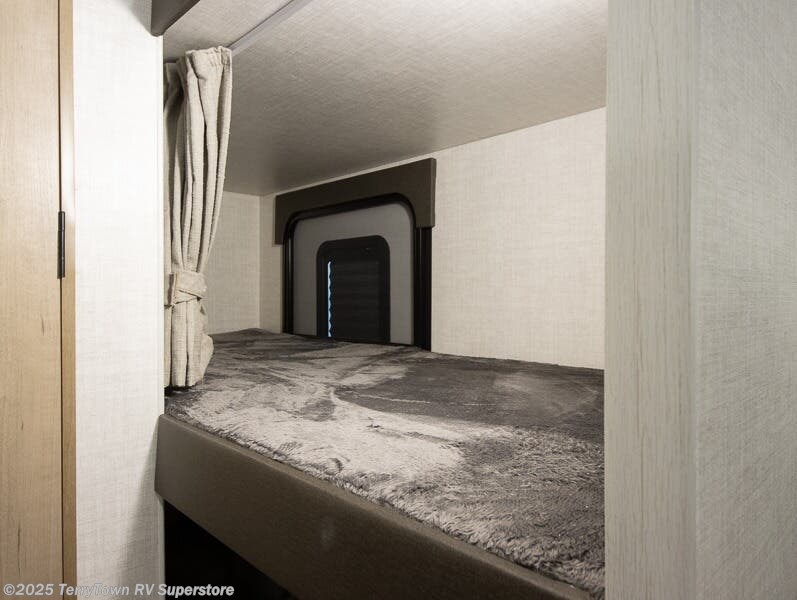 Enjoy a home away from home with the whole family in this travel trailer! Lay your head at night on the front queen bed and gaze up at the stars through the "Stargazer" skylight or watch a movie with the 12V HDTV with an AV system. Two others can sleep on the set of bunk beds and the lower bunk can even fold for storage, plus there is an exterior storage door by the lower bunk area. Freshen up each morning in the rear corner bathroom featuring a 24" x 40" shower and then grab some eggs from the 8 cu. ft. refrigerator to fry up on the two burner cooktop. You can enjoy your meals at the jackknife sofa with removable table. This can also double as extra sleeping space at night!
