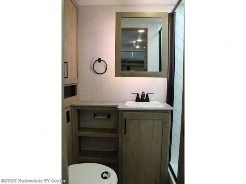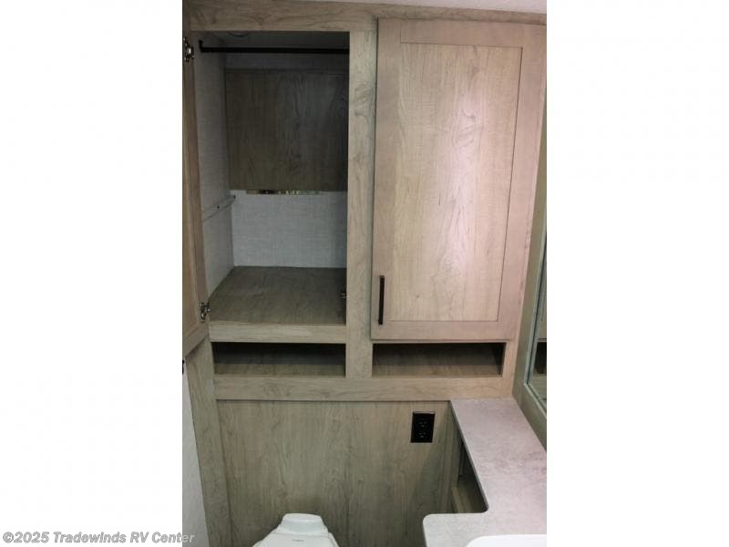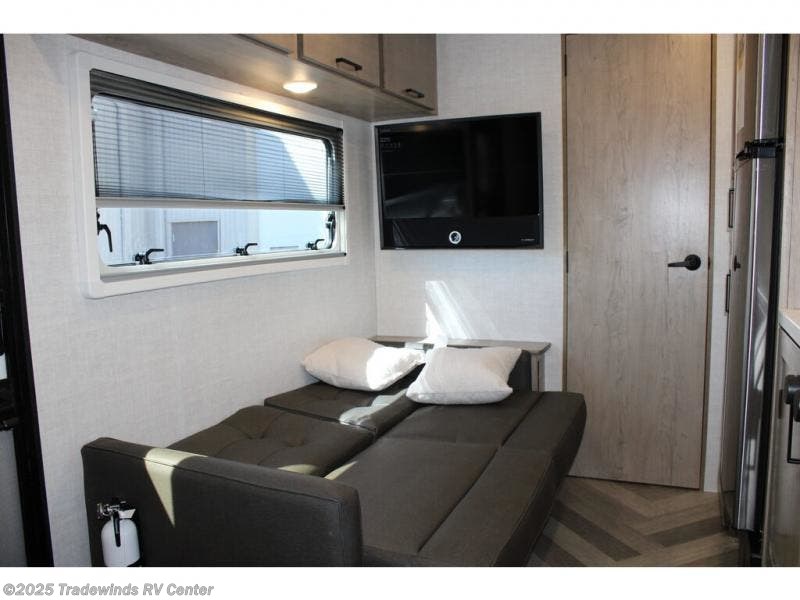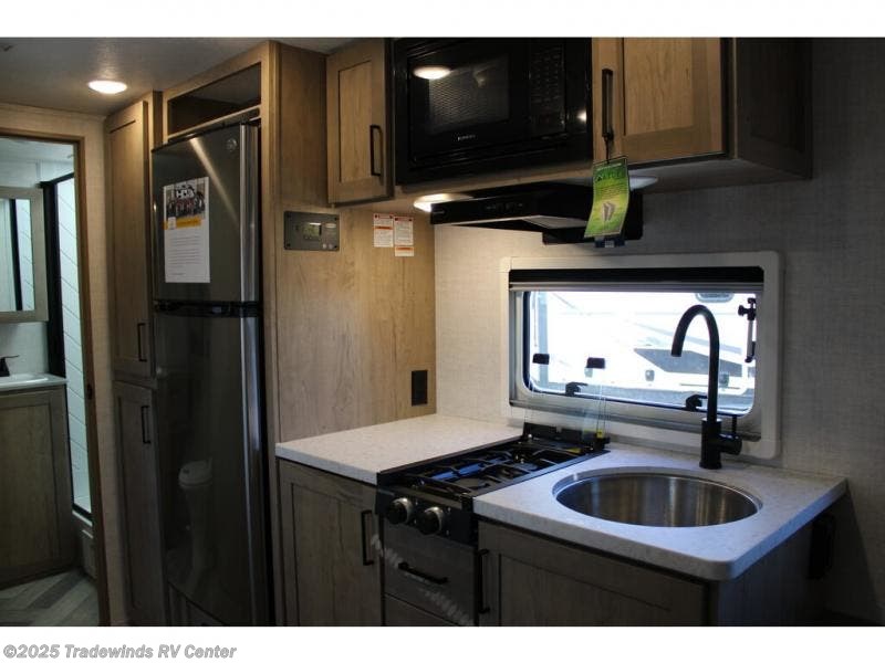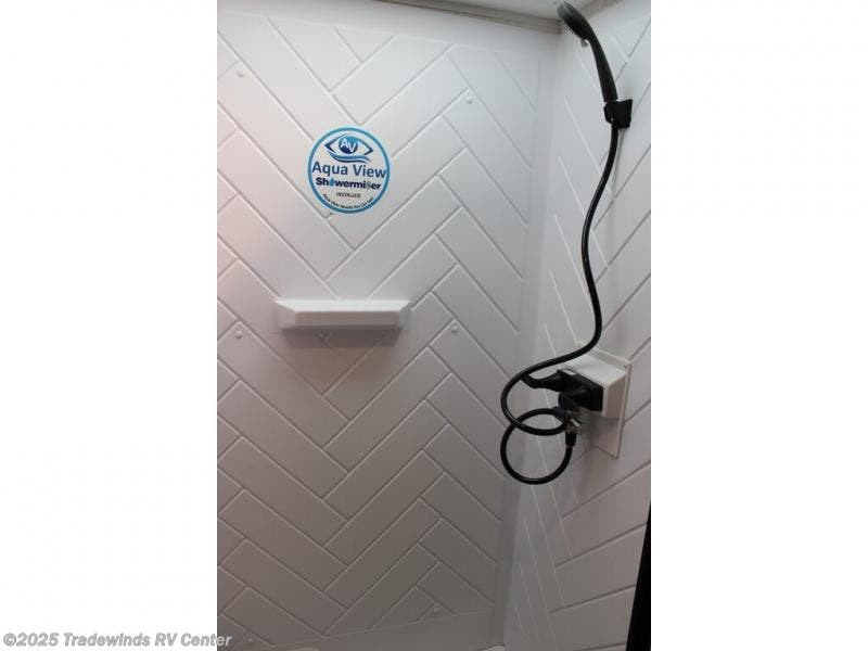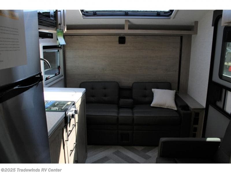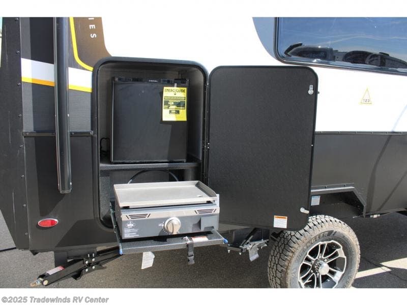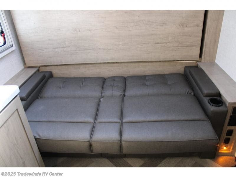 Go off-grid camping in comfort with this travel trailer! It features a full rear bathroom with a 24" x 40" shower to clean up in after a day of exploring and a wardrobe/linen closet to keep your towels close. You can prepare your best meals with the two burner cooktop and 8 cu. ft. refrigerator then enjoy them at the jackknife sofa with a removable table which is across from a 12V HDTV/AV system with a hidden wardrobe behind it. Store all of your outdoor gear in the exterior pass-through storage areas and stay protected by the 12' electric awning with dimmable LED light while you cook at the outside kitchen which has a 1.6 cu. ft. refrigerator and an optional griddle. When you're ready to wind down your nights, lay down on the front 60" x 80" Murphy bed and admire the beautiful stars through the "Stargazer" skylight!
