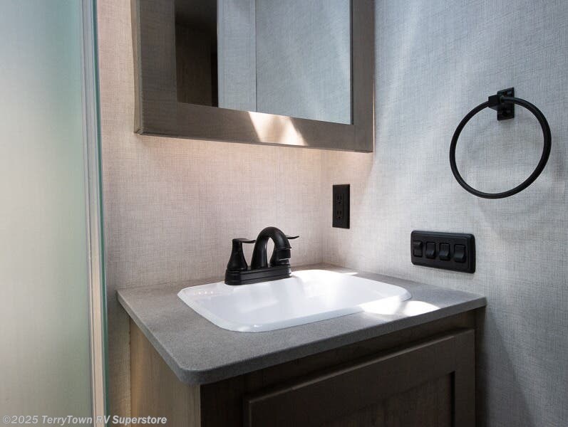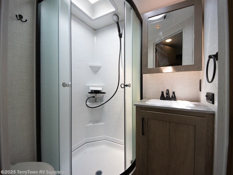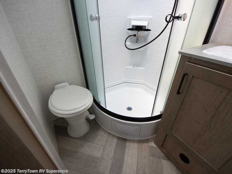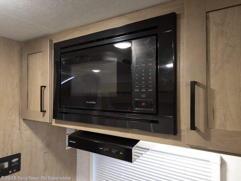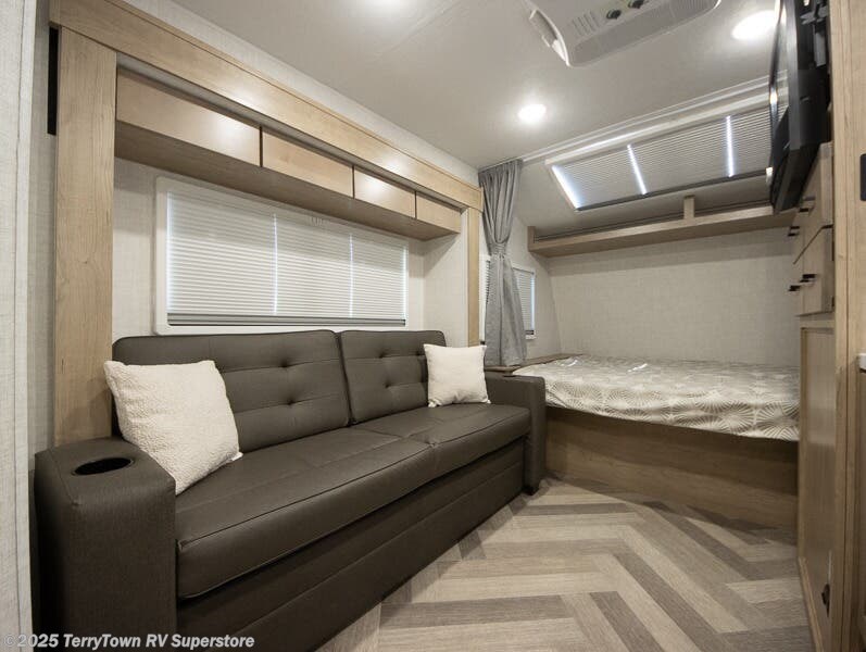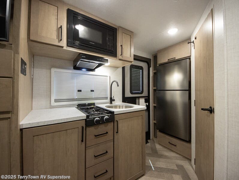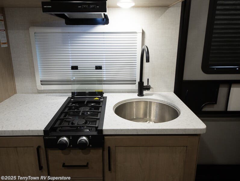 Pack your bags and hitch up this travel trailer for an unforgettable camping trip! Start each day feeling well rested after sleeping on the front queen bed and look up at the beautiful sky through the "Stargazer" skylight. Another friend can join in on the fun too and sleep on the jackknife sofa slide when you are done relaxing on it while watching a movie with the 12V HDTV/AV system which even has a hidden wardrobe behind it. On one side of the 12V refrigerator there is a pantry for your snacks, and on the other side you will find the rear corner bathroom with a 32" radius shower to freshen up. You can prepare delicious home cooked meals indoors with the two burner cooktop or head to the outside kitchen where you will find a 1.6 cu. ft. refrigerator and an optional griddle.