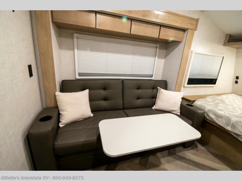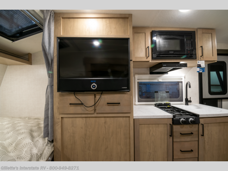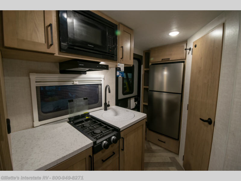Pack your bags and hitch up this travel trailer for an unforgettable camping trip! Start each day feeling well rested after sleeping on the front queen bed and look up at the beautiful sky through the "Stargazer" skylight. Another friend can join in on the fun too and sleep on the jackknife sofa slide when you are done relaxing on it while watching a movie with the 12V HDTV/AV system which even has a hidden wardrobe behind it. On one side of the 8 cu. ft. refrigerator there is a pantry for your snacks, and on the other side you will find the rear corner bathroom with a 32" radius shower to freshen up. You can prepare delicious home cooked meals indoors with the two burner cooktop or head to the outside kitchen where you will find a 1.6 cu. ft. refrigerator and an optional griddle. There is also an optional microwave you can add to the inside kitchen for those nights when you don't feel like cooking!